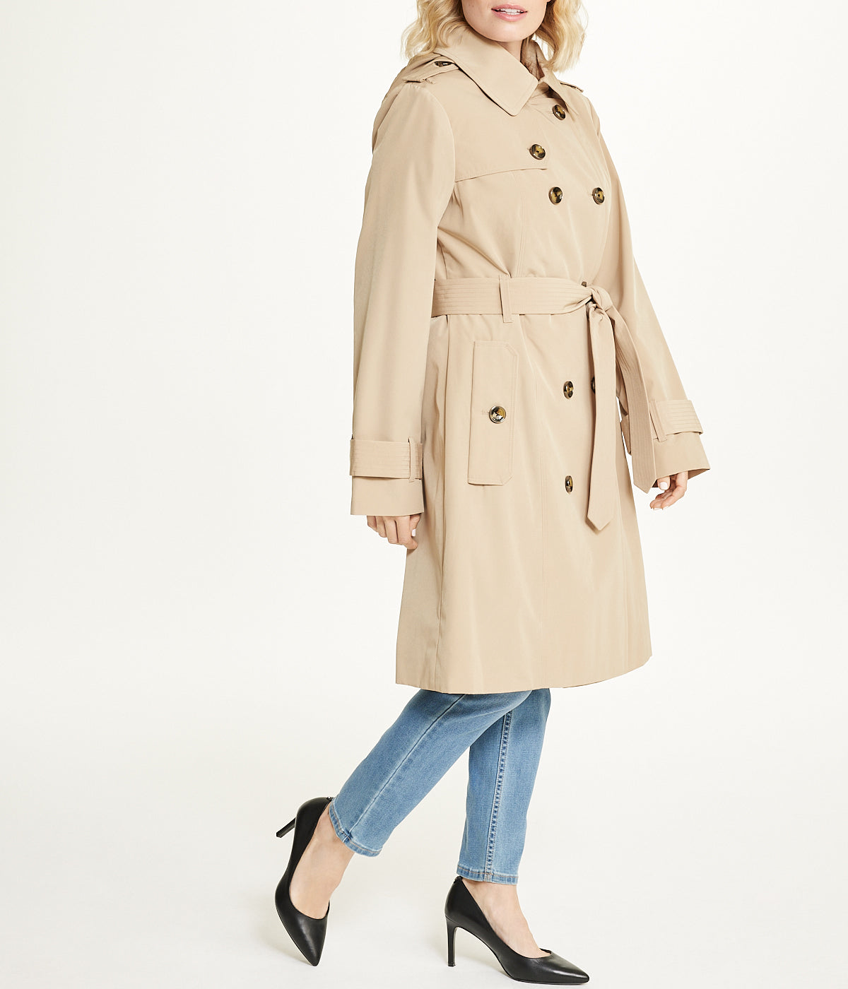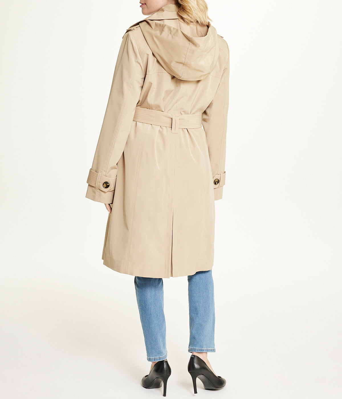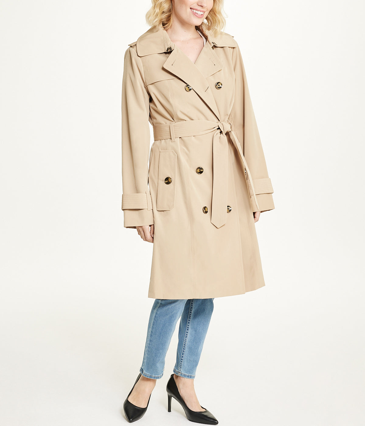 Sleek and simple, this longline double breasted trench coat is the perfect outerwear piece for any occasion. This coat features a removable hood and stylish self tie belt. Layer over a dress for a night out, or a crisp white button down and pants for work!Product Care: Dry cleanMaterial: Polyester