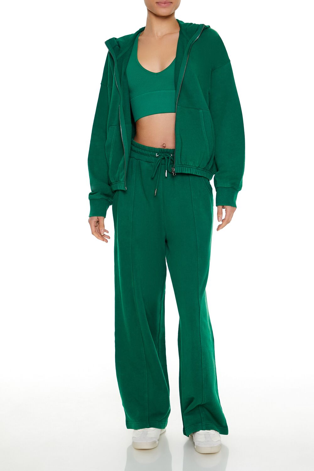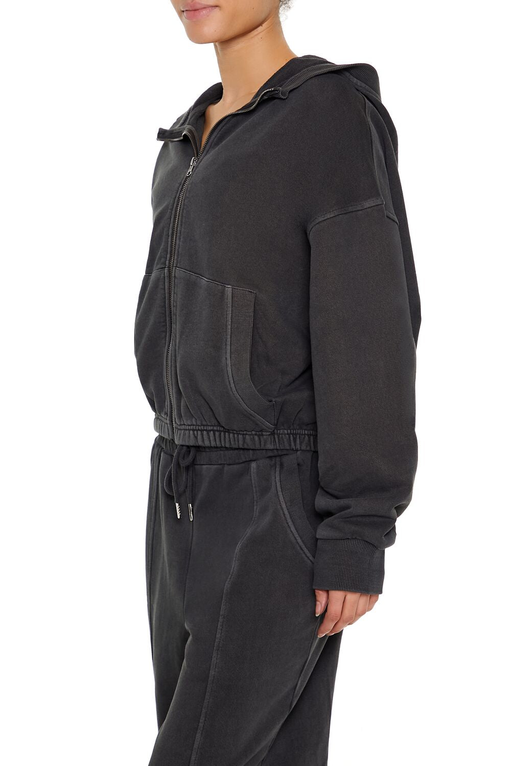 An athletic French terry zip-up hoodie featuring ribbed trim, a split kangaroo front pocket, dropped long sleeves, and elasticized waist.- Matching bottoms available. Complete the look with 01371595 or 01371596.
