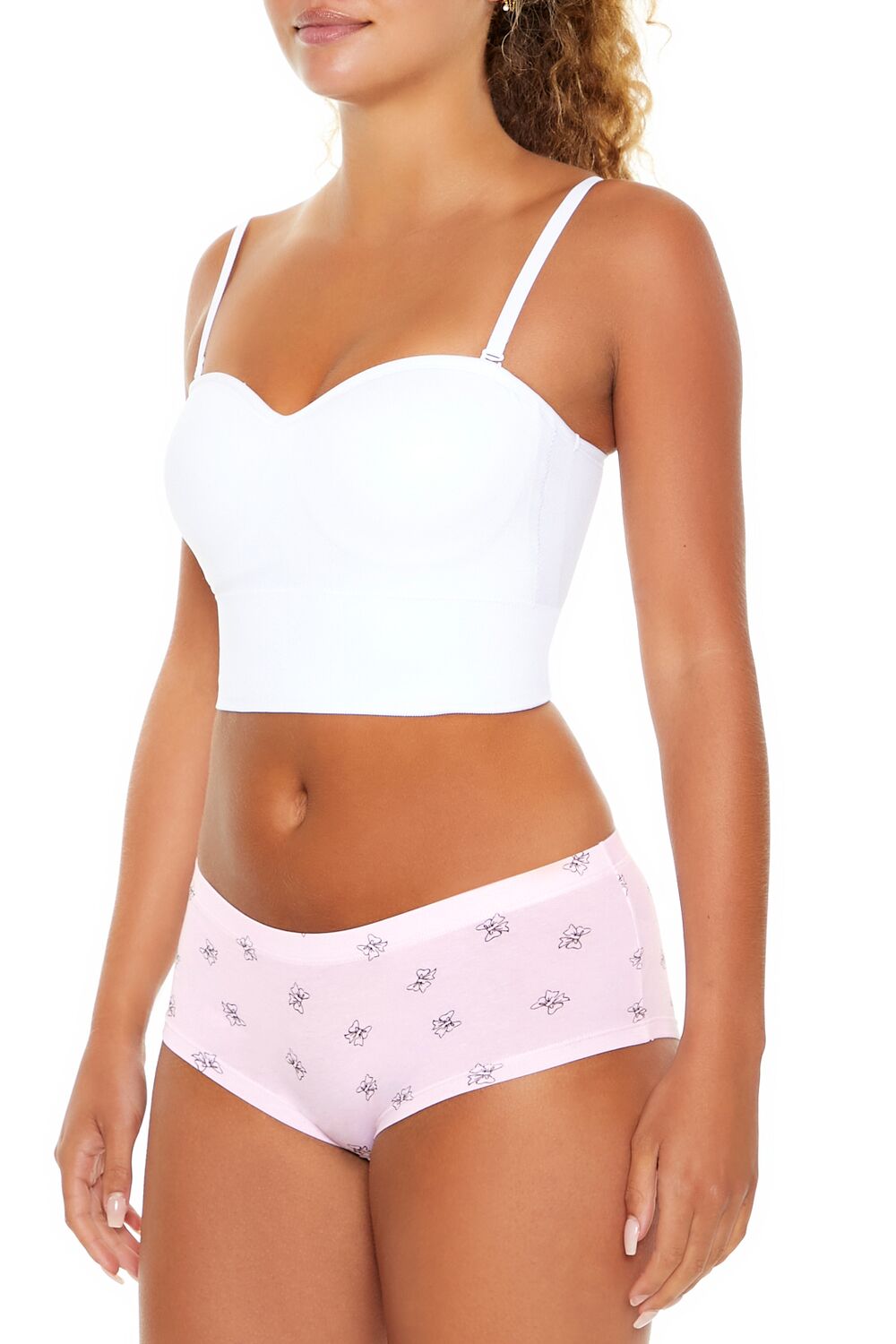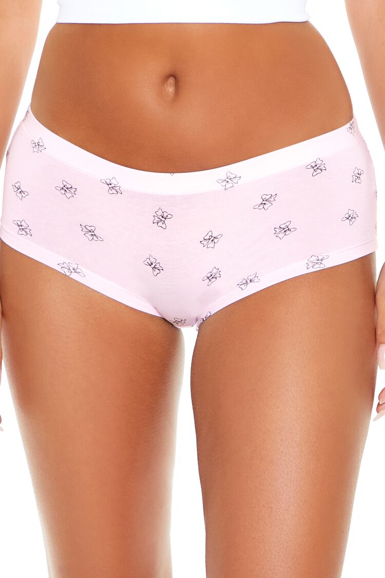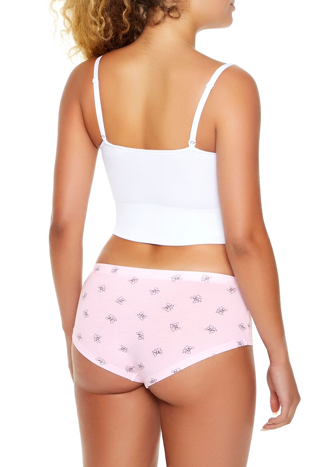 A pair of knit panties featuring a shortie design and allover bow print.Content + Care