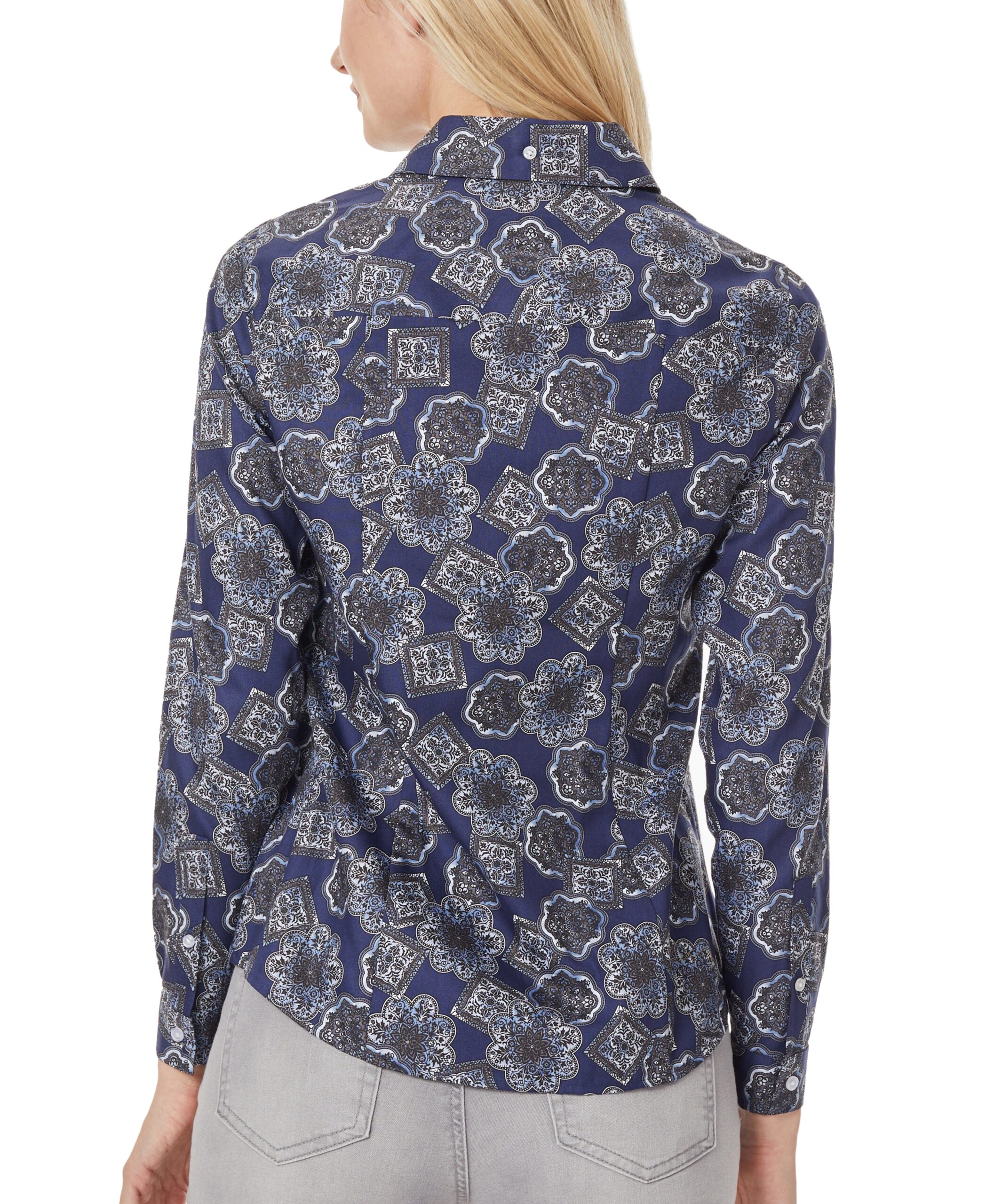 An elegant, simple-to-care-for blouse is a strong foundational piece that works wonders for any work or weekend wardrobe. With its striking pattern and traditional polish of a Y-neckline, shirt collar, and button-front, this top will upgrade your wardrobe. Women’s Blouse Length is 27″ Button-Front Closure; Y-Neckline Shirt Collar; Long Sleeves with Button Cuffs Product Care : Machine Wash Cold Material : 100% Cotton