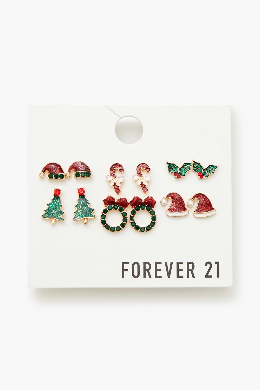 A set of high-polish stud earrings featuring an enamel construction, rhinestone embellishments, and Santa hat, candy cane, mistletoe, Christmas tree, and wreath designs, all complete with post-back closures.Content + Care