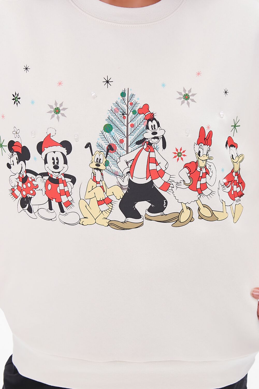 A fleece pullover featuring front character graphics of Mickey and Minnie Mouse, Goofy, Pluto, and Daisy and Donald Duck, long sleeves with ‘Let It Snow’ text, ribbed trim, and a crew neck.- Officially licensed product