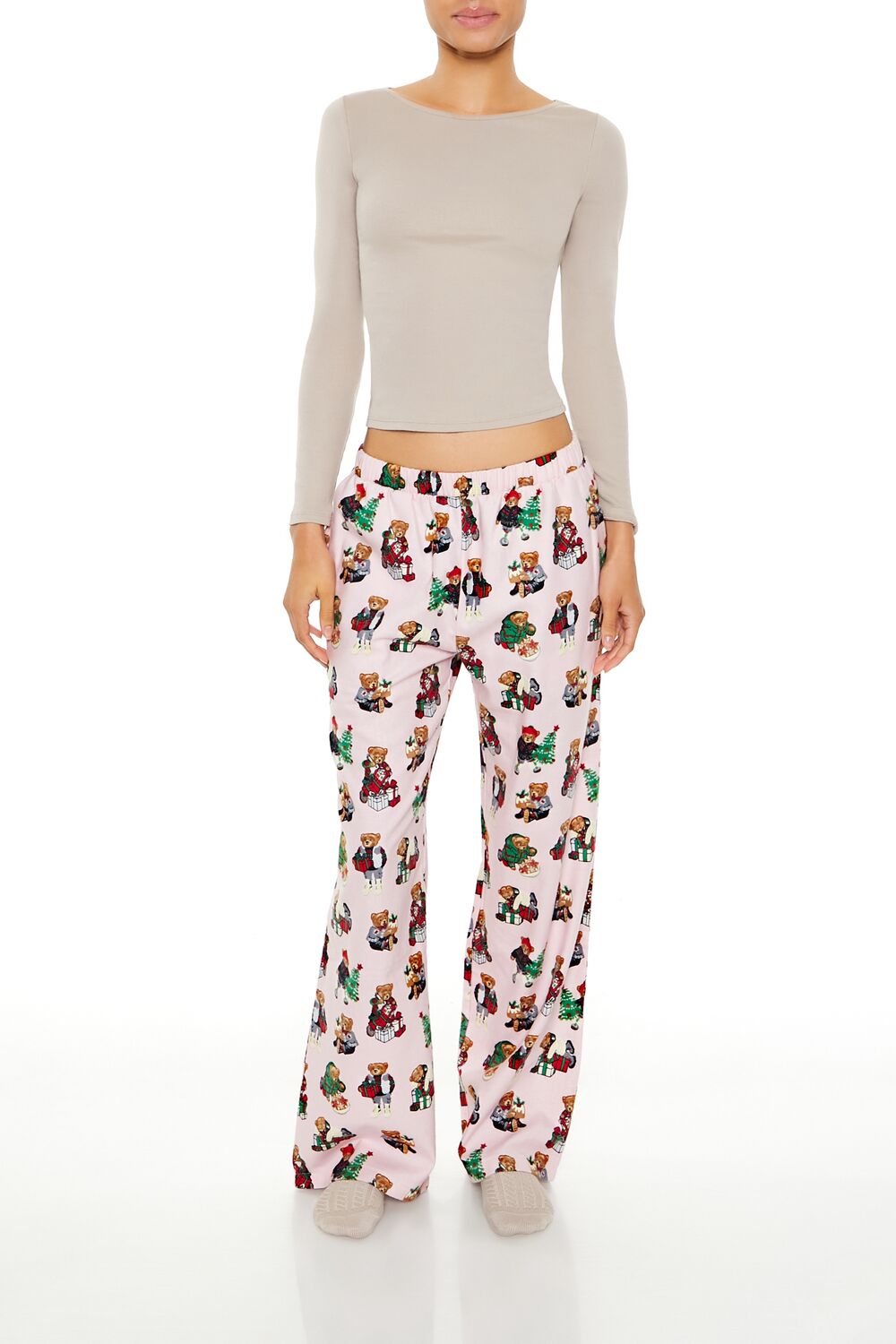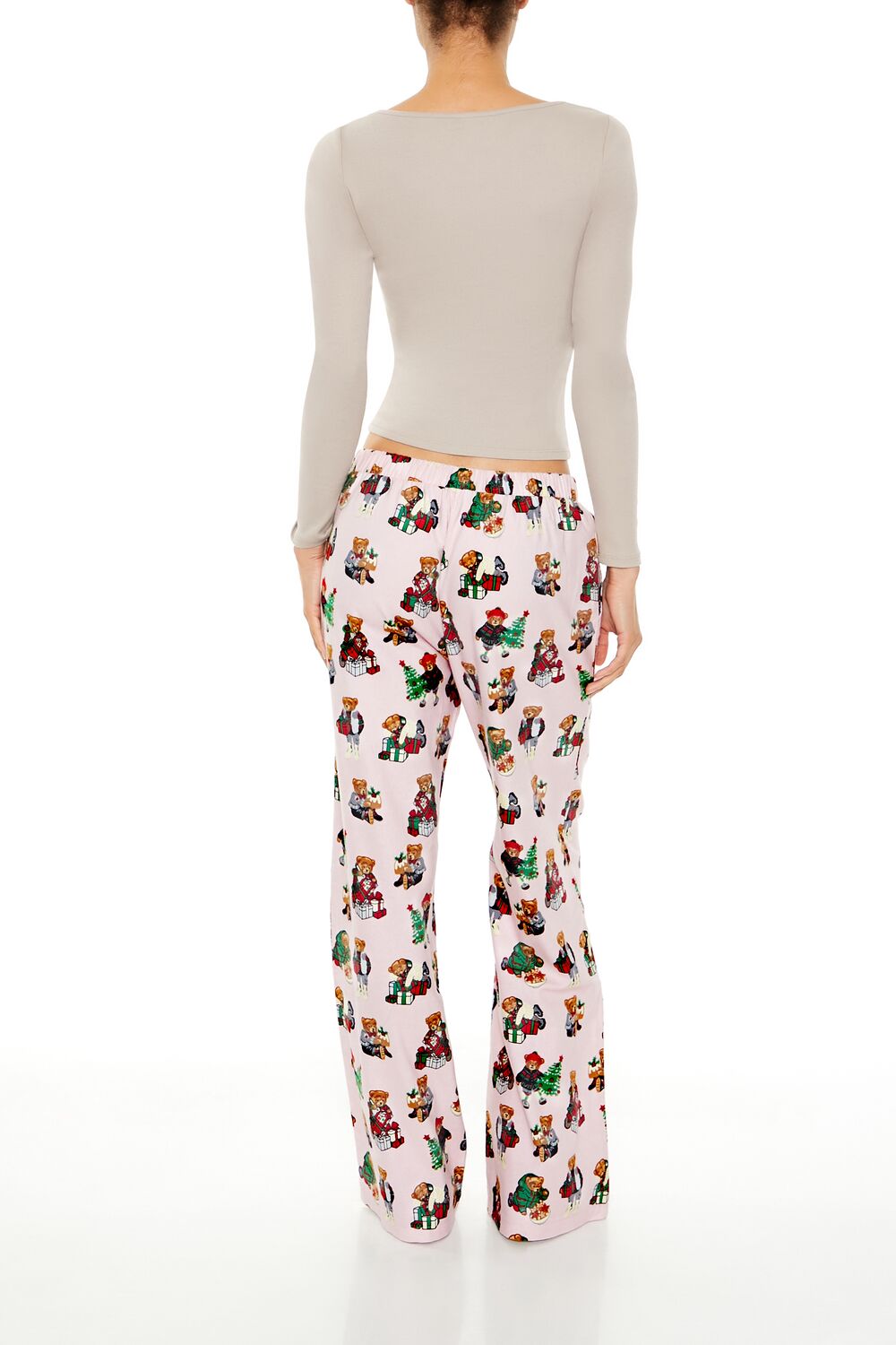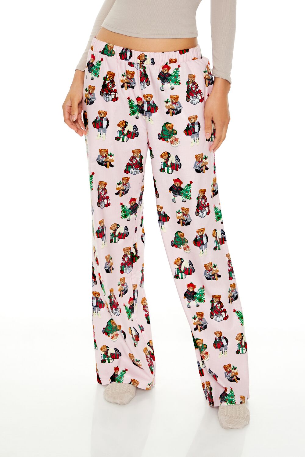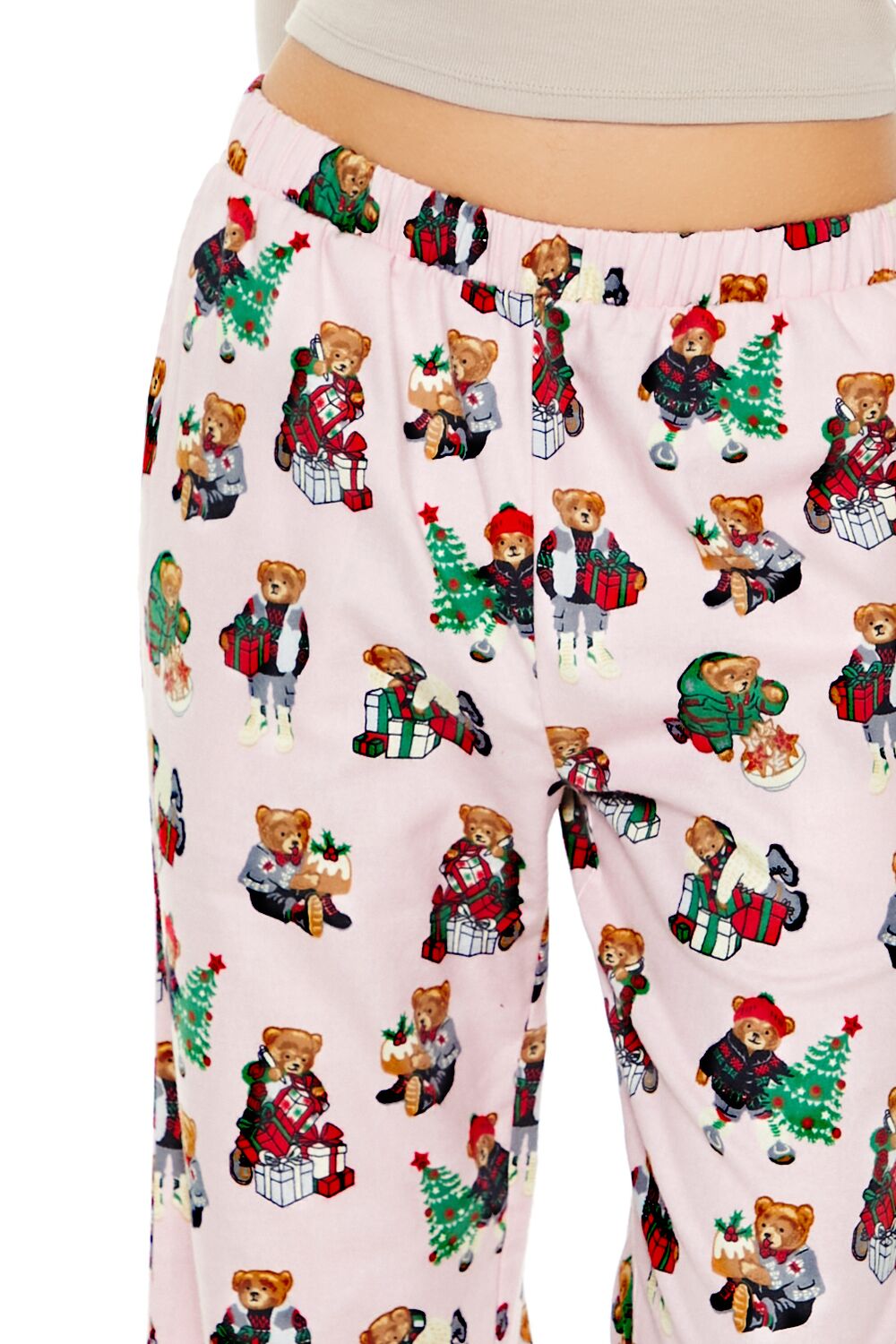 A pair of woven pajama pants featuring allover Christmas-themed teddy bear graphics, an elasticized mid-rise waist, and wide leg.Content + Care