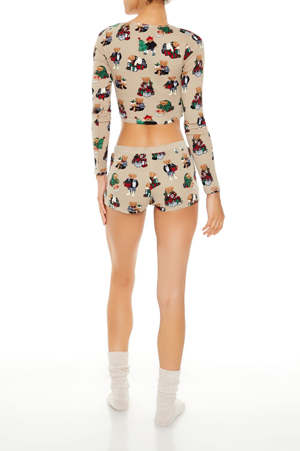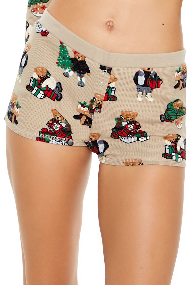 A pair of knit pajama shorts featuring allover Christmas-themed teddy bear graphics, an elasticized mid-rise waist, and button-front placket.Content + Care