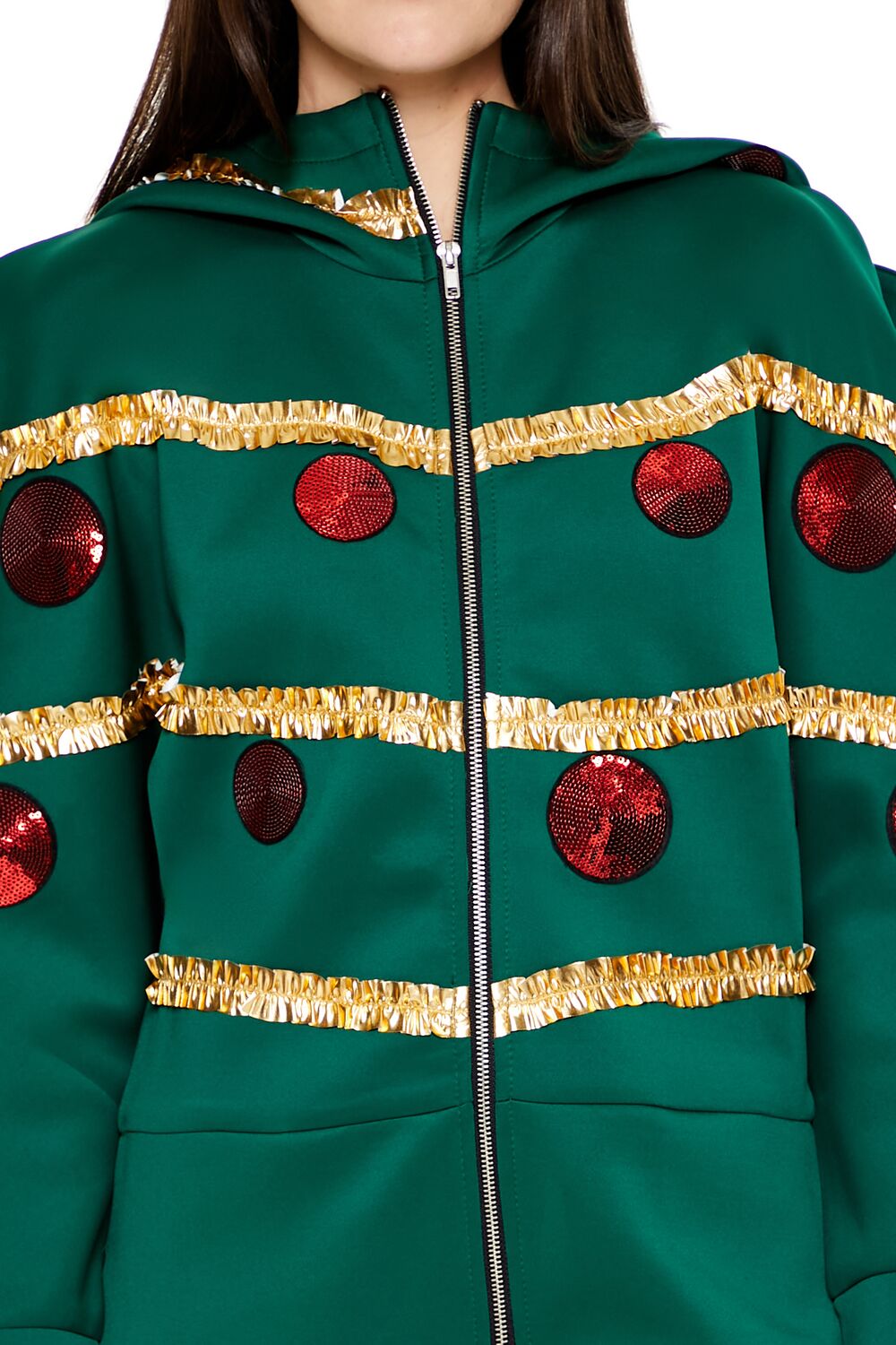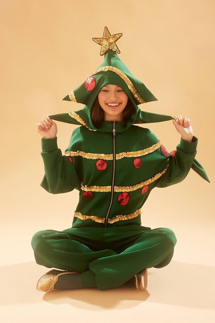 A scuba knit jumpsuit featuring metallic garland accents, sequin ornament embellishments, long sleeves, an attached hood complete with a sequin star topper, a Christmas tree design, and a zip-up front.Content + Care