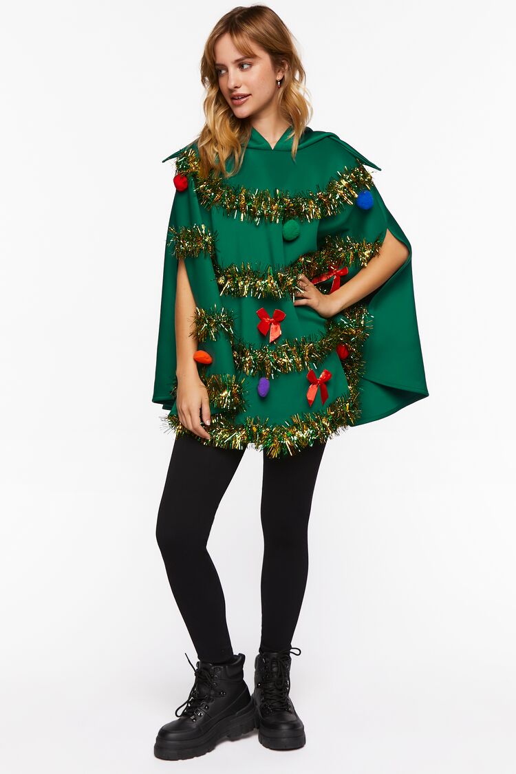 Get into the holiday spirit with this scuba knit poncho in the shape of a Christmas tree, featuring a tiered tinsel design, multicolor pom pom accents, dropped armholes, and an opening for the face with a star on top.- This is an independent brand and not a Forever 21 branded item.