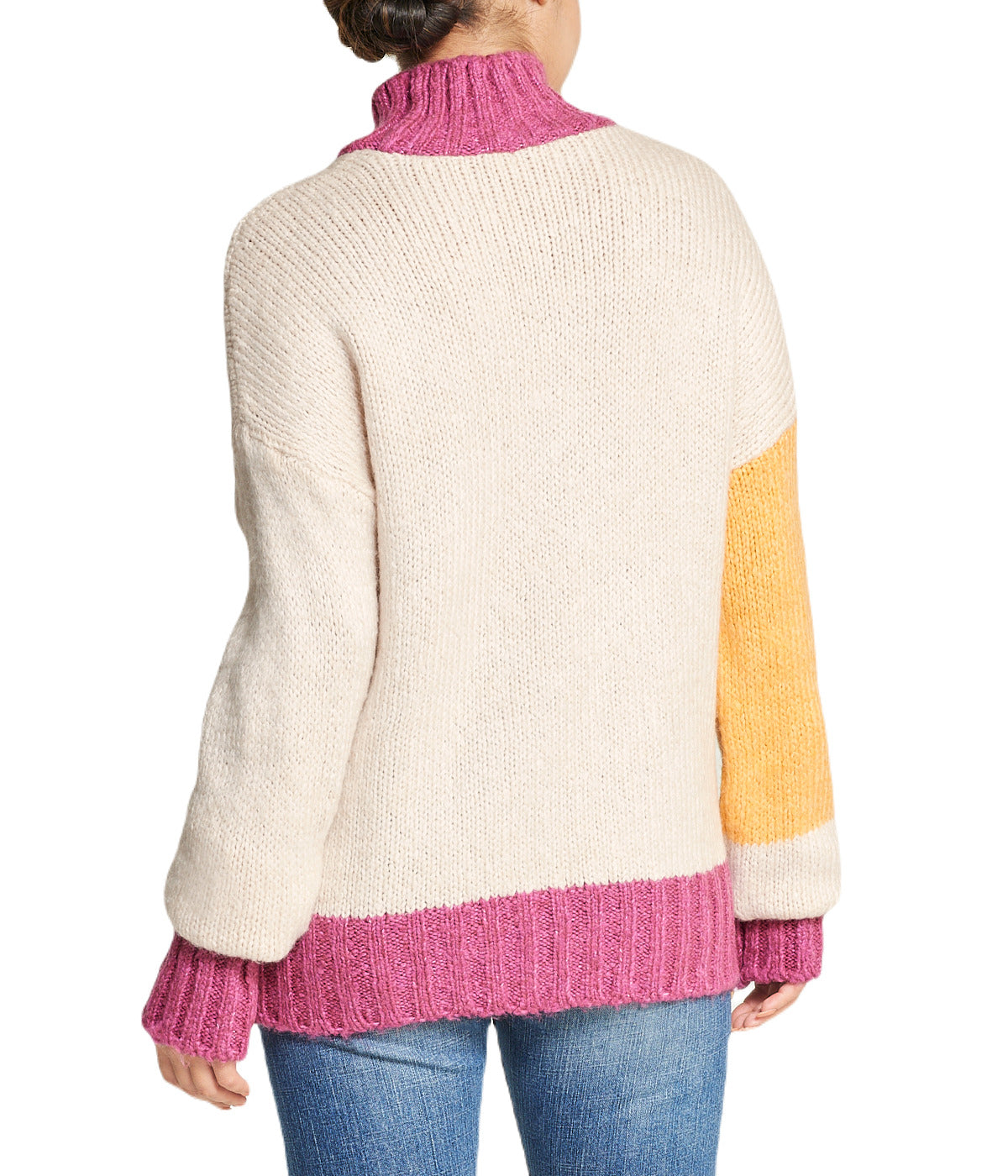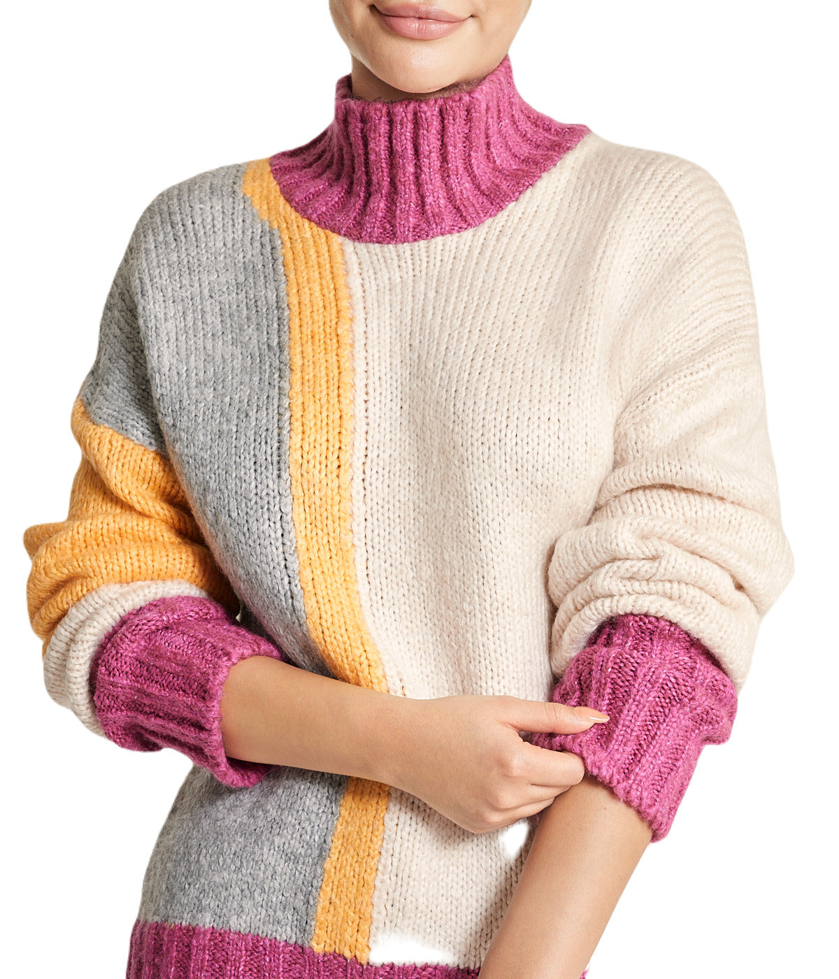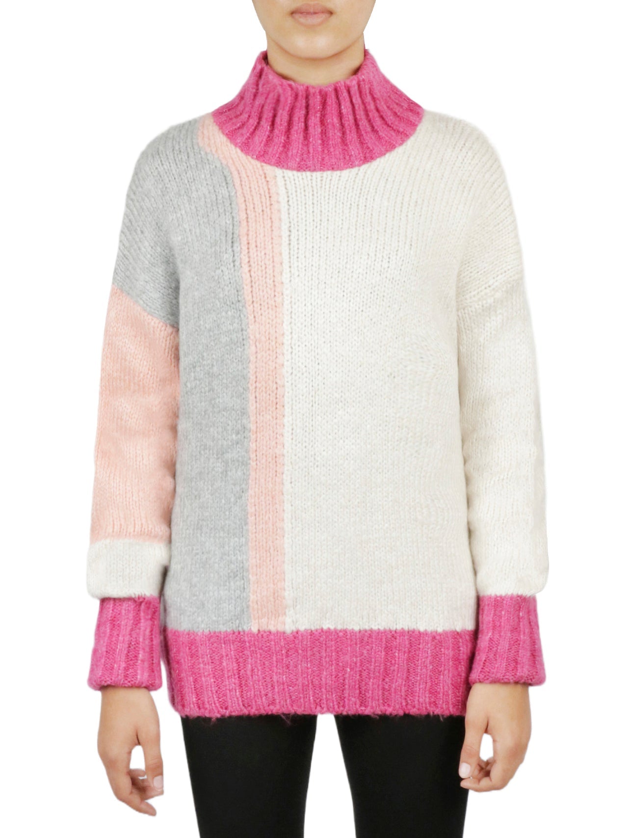 In addition to its comfort, this mock neck tunic sweater features a trend right color block pattern. This garment runs small, please size up. Product Care : Refer to Garment Material : Tricot %80 Acrylic %20 Polyester