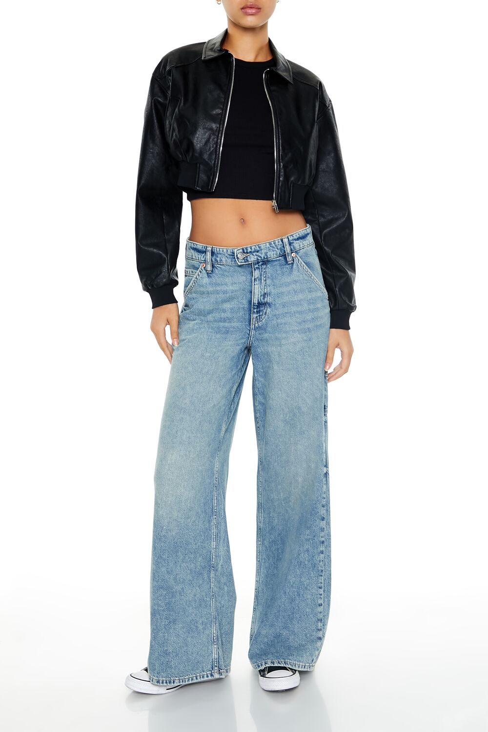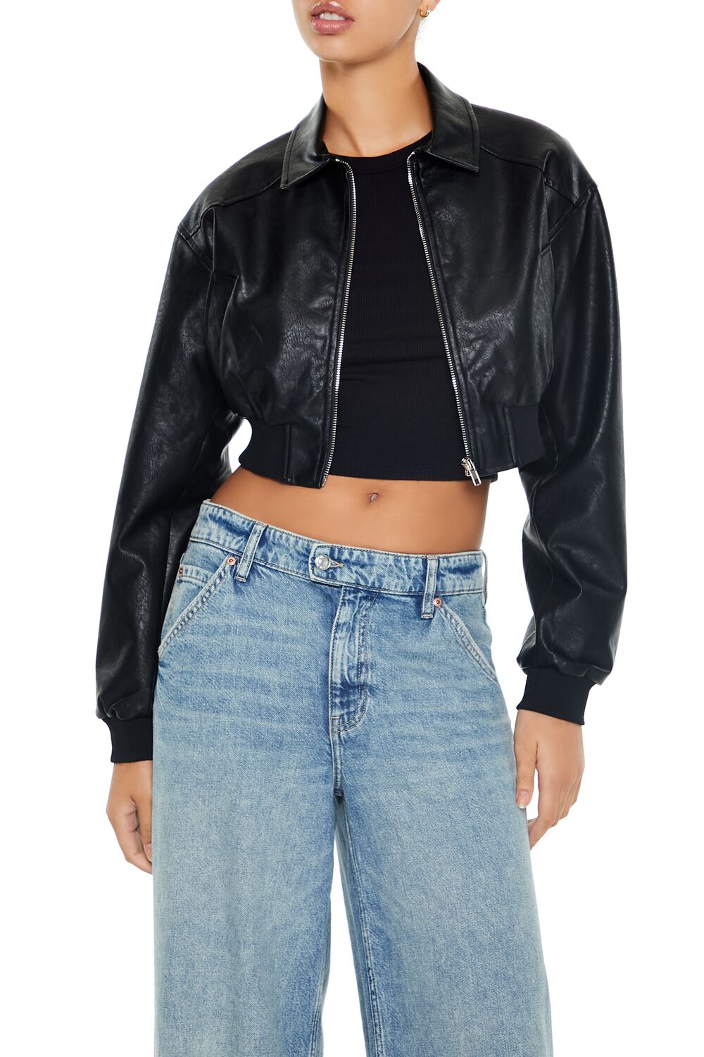 A faux leather bomber jacket featuring ribbed trim, a basic collar, zip-up front closure, slanted front pockets, long sleeves, and cropped hem.Content + Care