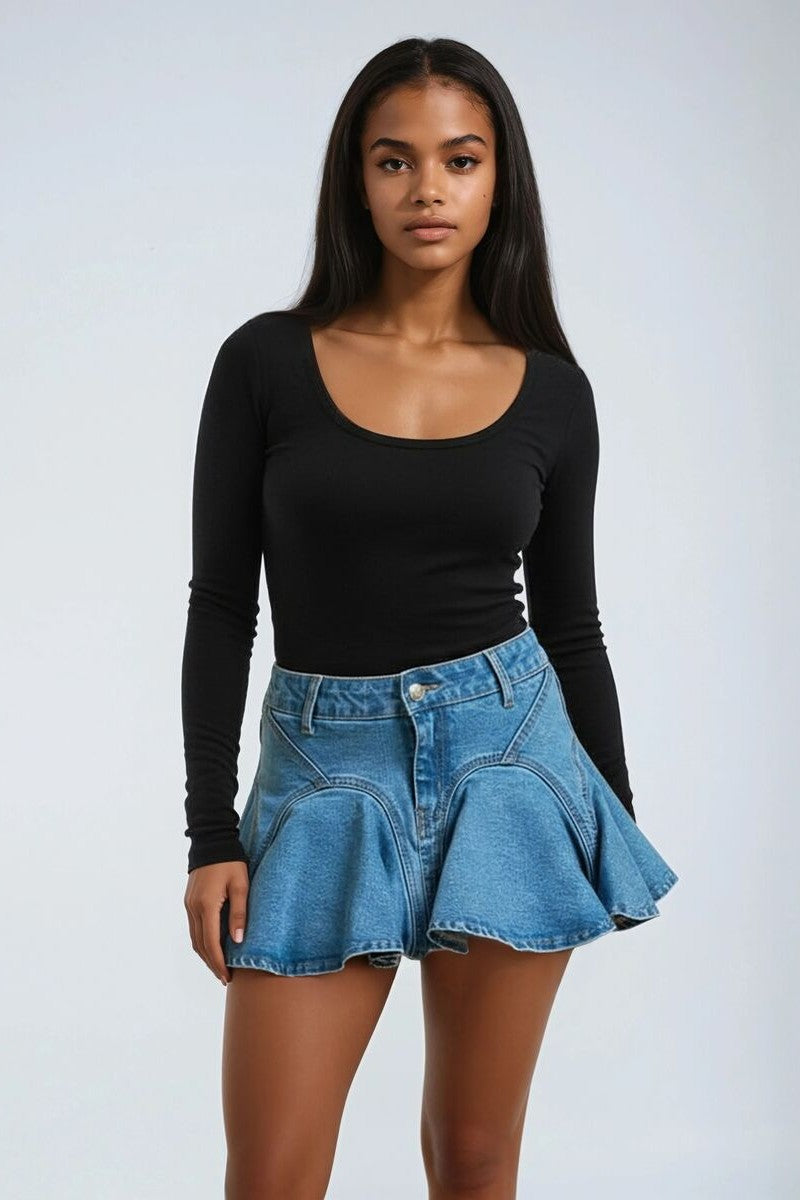 Washed denim mini skirt with flounce hem for a playful, voluminous shape