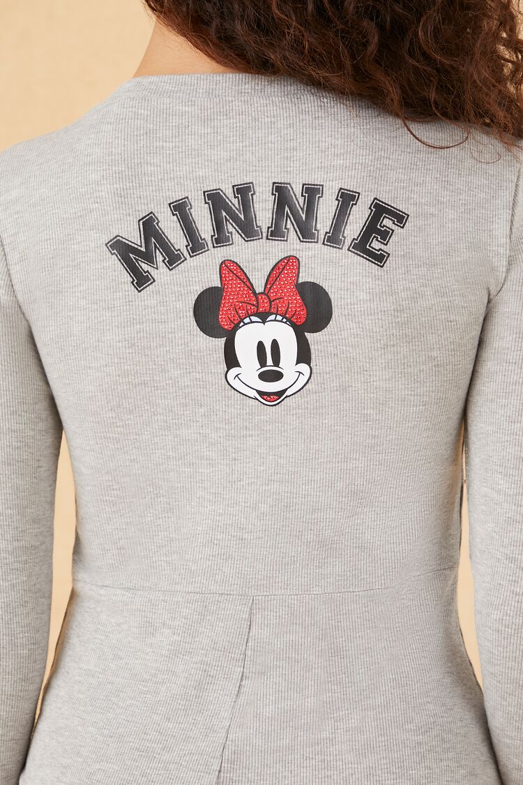 From our Disney x Forever 21 collection, this ribbed knit pajama romper features back ‘Minnie’ text, accompanying character graphic with rhinestone , long sleeves, fitted silhouette, bow chest graphic, a plunging neckline, and partial button placket.- Officially licensed product