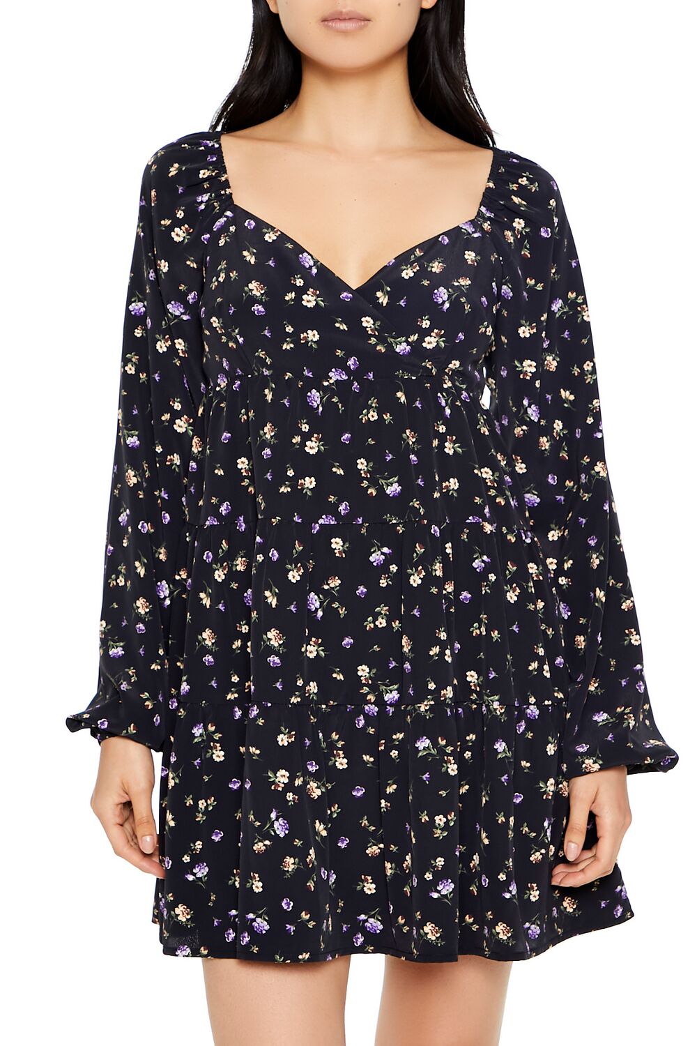 A woven mini dress featuring an allover ditsy floral print, surplice neckline, long peasant sleeves, tiered construction, and babydoll silhouette.Content + Care
