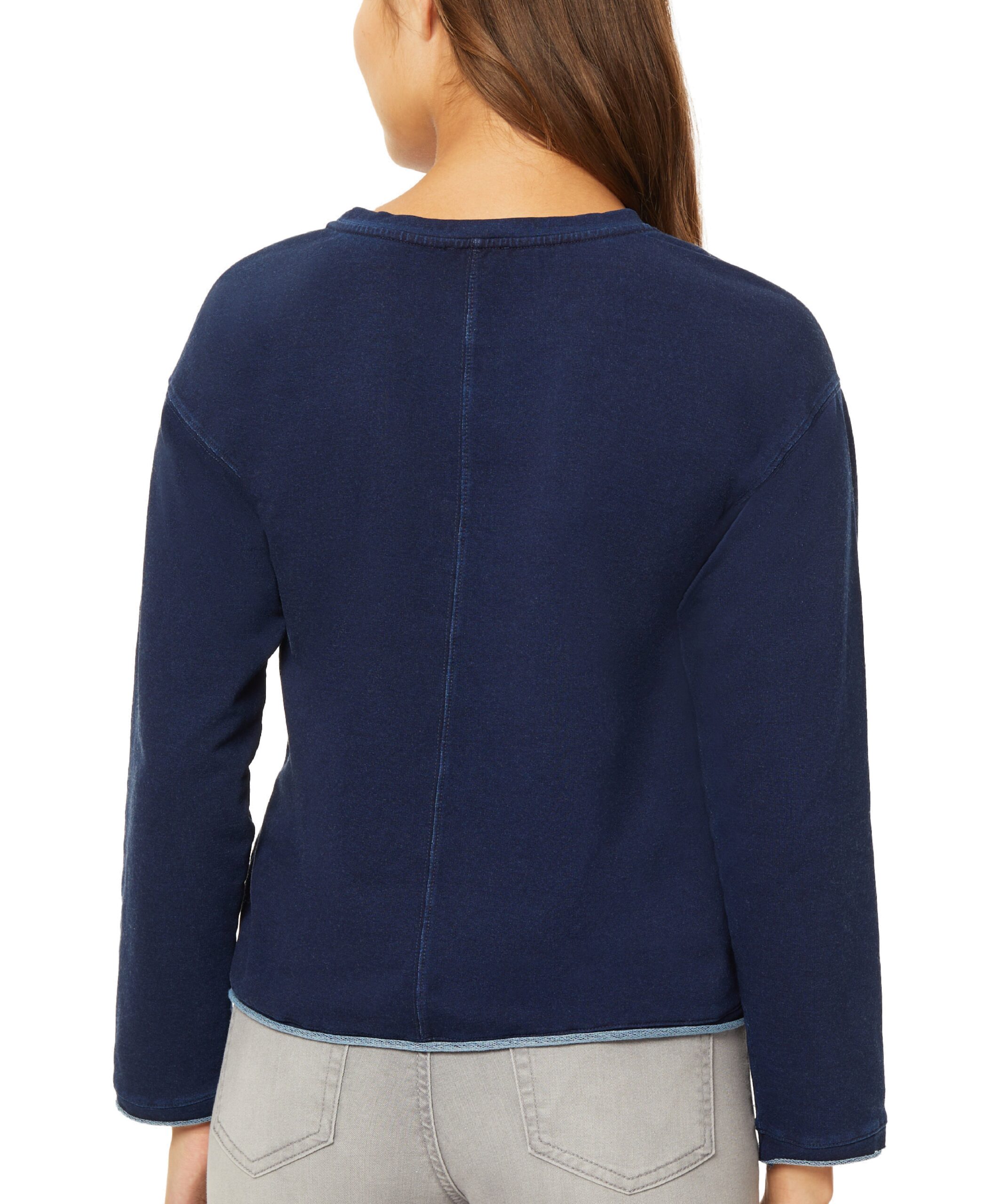 This Indigo sweatshirt is extremely comfortable, so you can kick back, relax, and get cozy in it. This denim-like top has a relaxed fit with drop shoulders and a relaxed fit overall, giving it the feel of loungewear but the style of a classic sweater. Women’s Sweater Length is 27 3/8″ Long Sleeves; Crew Neck; Pullover Product Care : Dry Clean/ Machine Wash Material : 78% Cotton, 15% Polyester, 7% Elastane