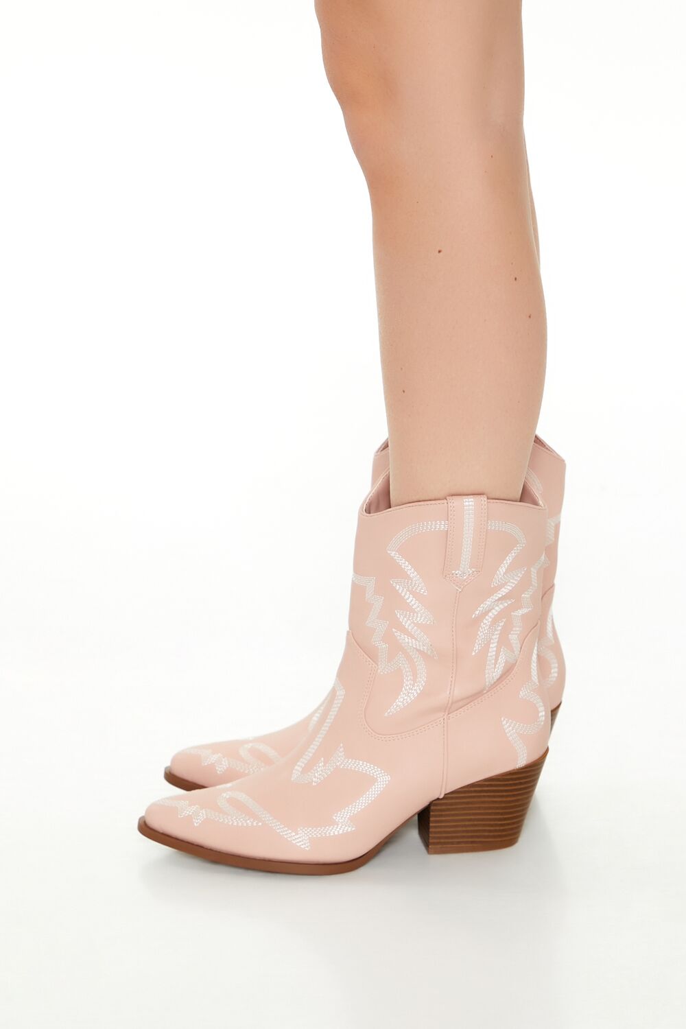 A pair of faux leather cowboy booties featuring Western-inspired embroidery, an ankle length, notched top pull tabs, pointed toe, zipper side closure, and stacked block heel.Content + Care