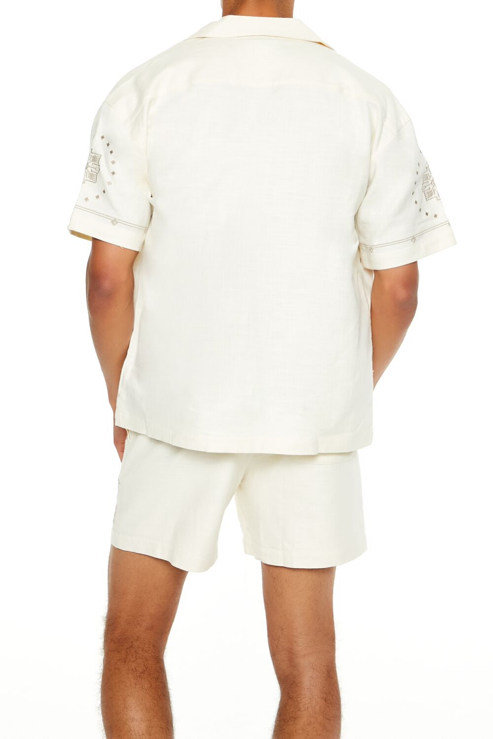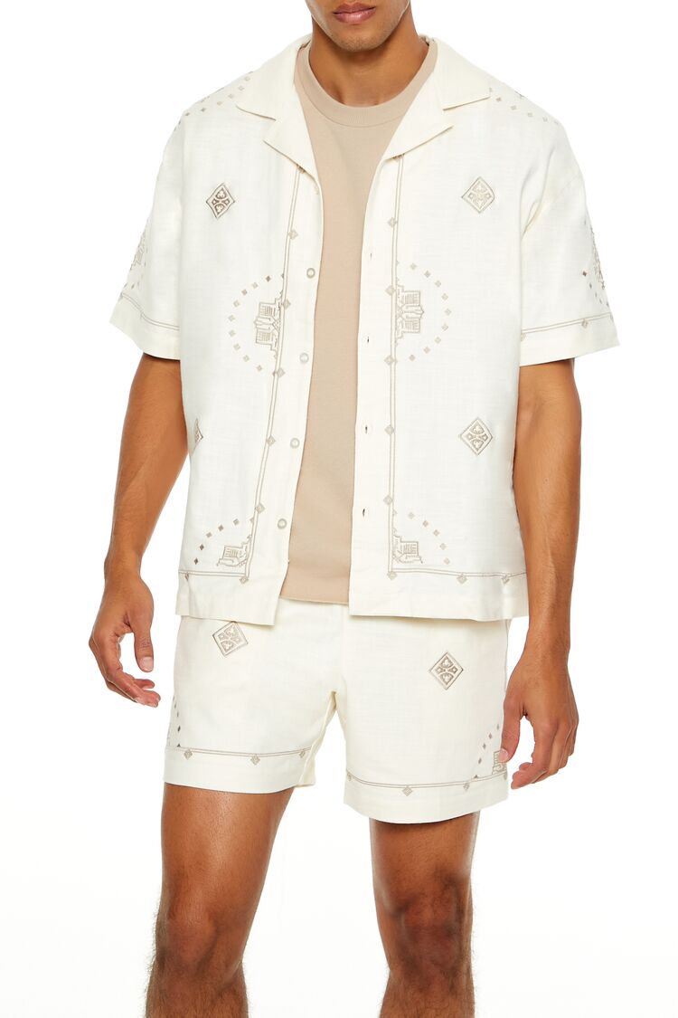 A woven shirt featuring geometric front embroidery, a Cuban collar, button-front closures, and dropped short sleeves.Content + Care