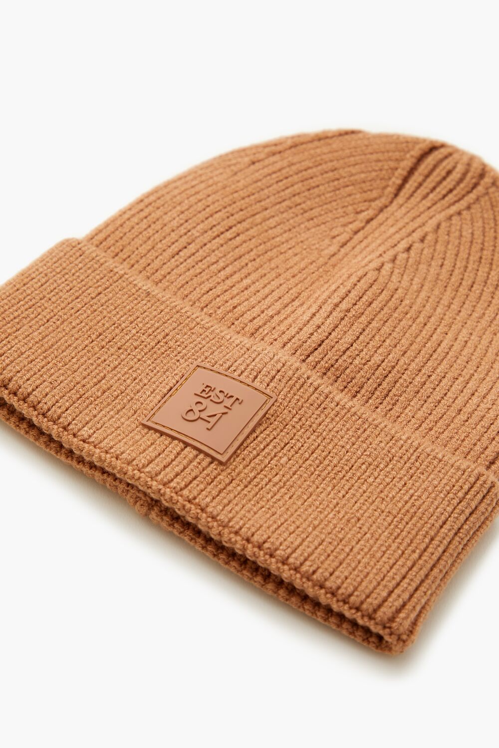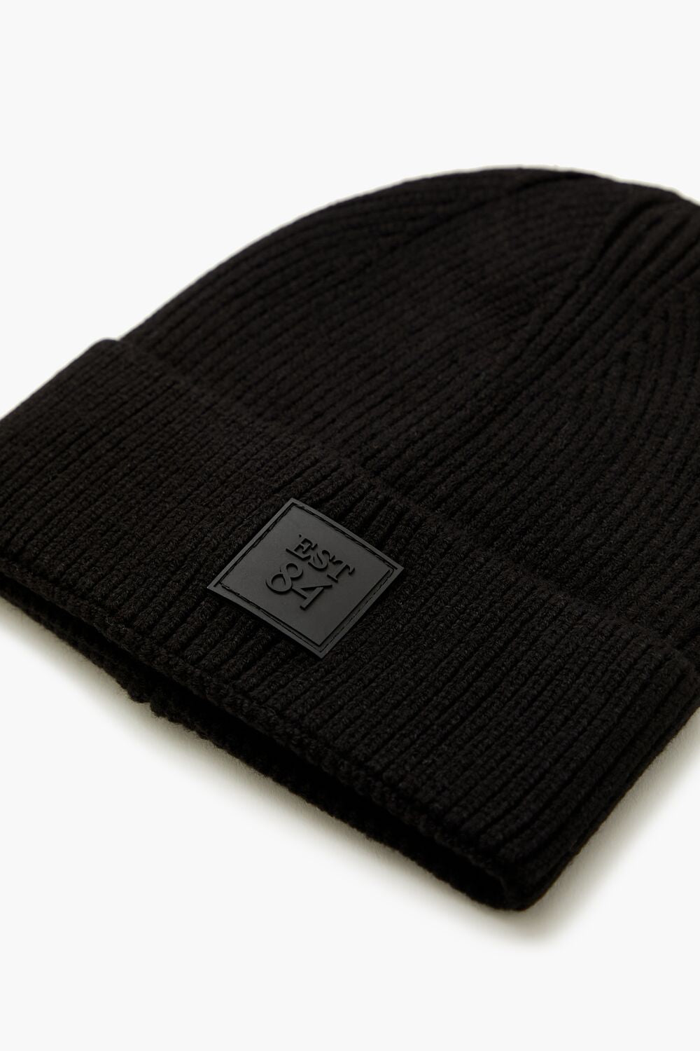 A ribbed knit beanie featuring a foldover brim and patch with ‘EST 84’ text.Content + Care