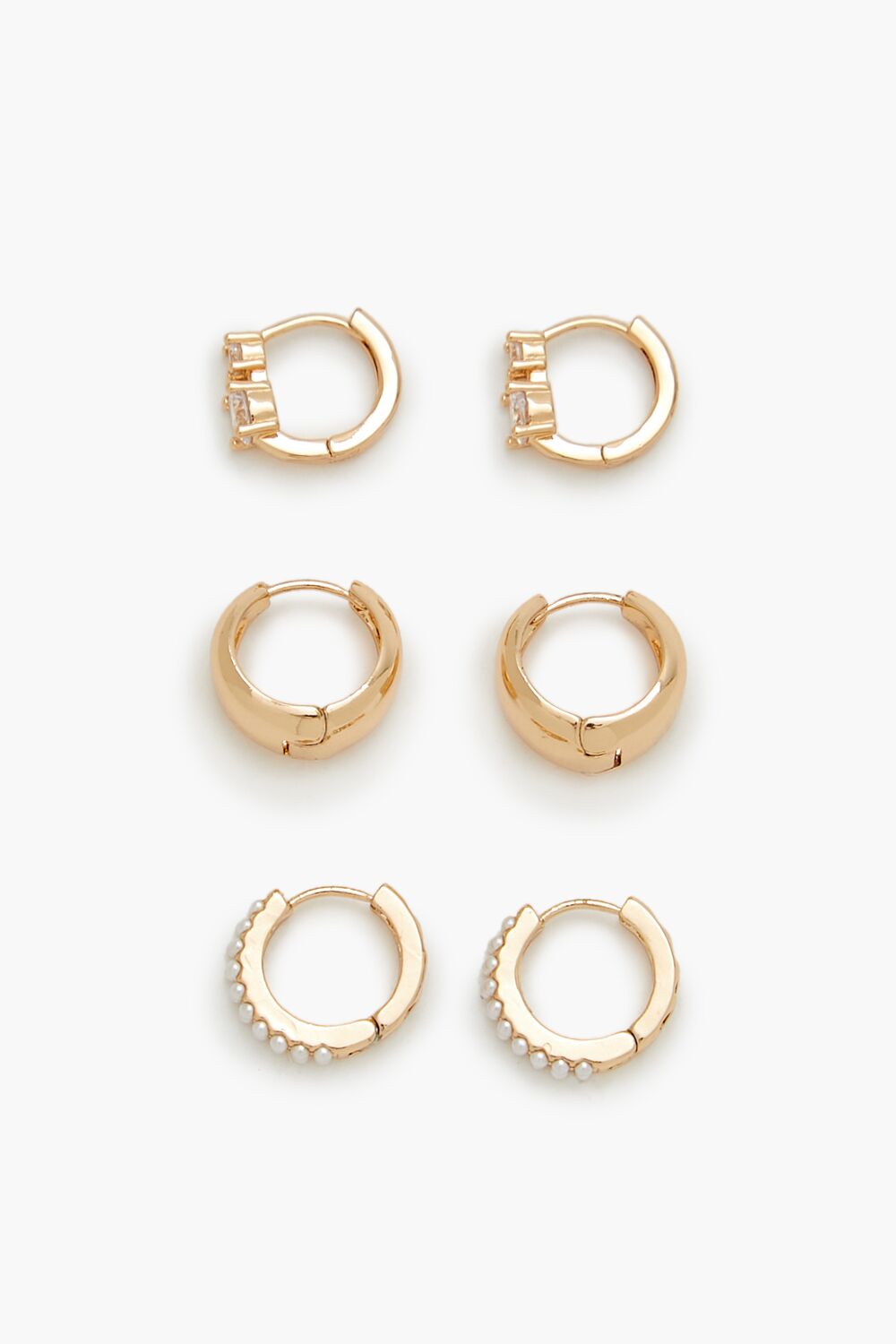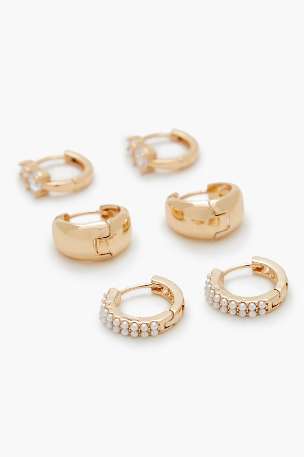 A set of high-polish hoop earrings featuring faux pearl and gem embellishments, all complete with huggie closures.Content + Care