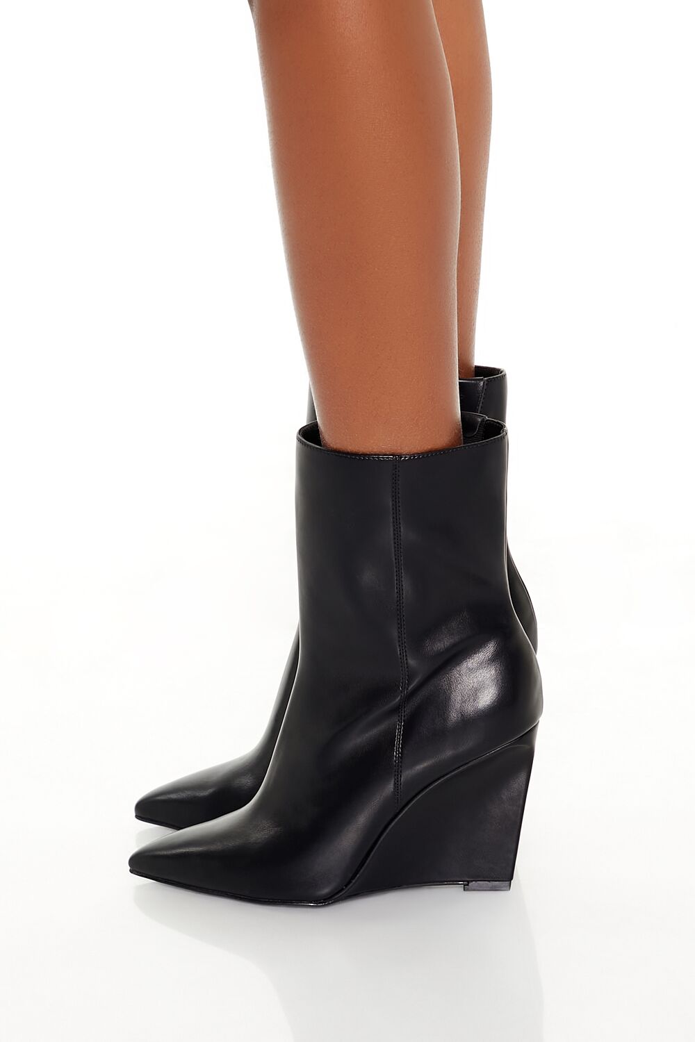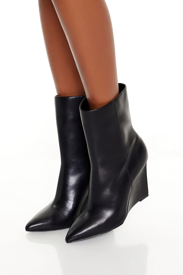 A pair of faux leather booties featuring an ankle length, pointed toe, zipper side closure, and slim notched wedge heel.Content + Care