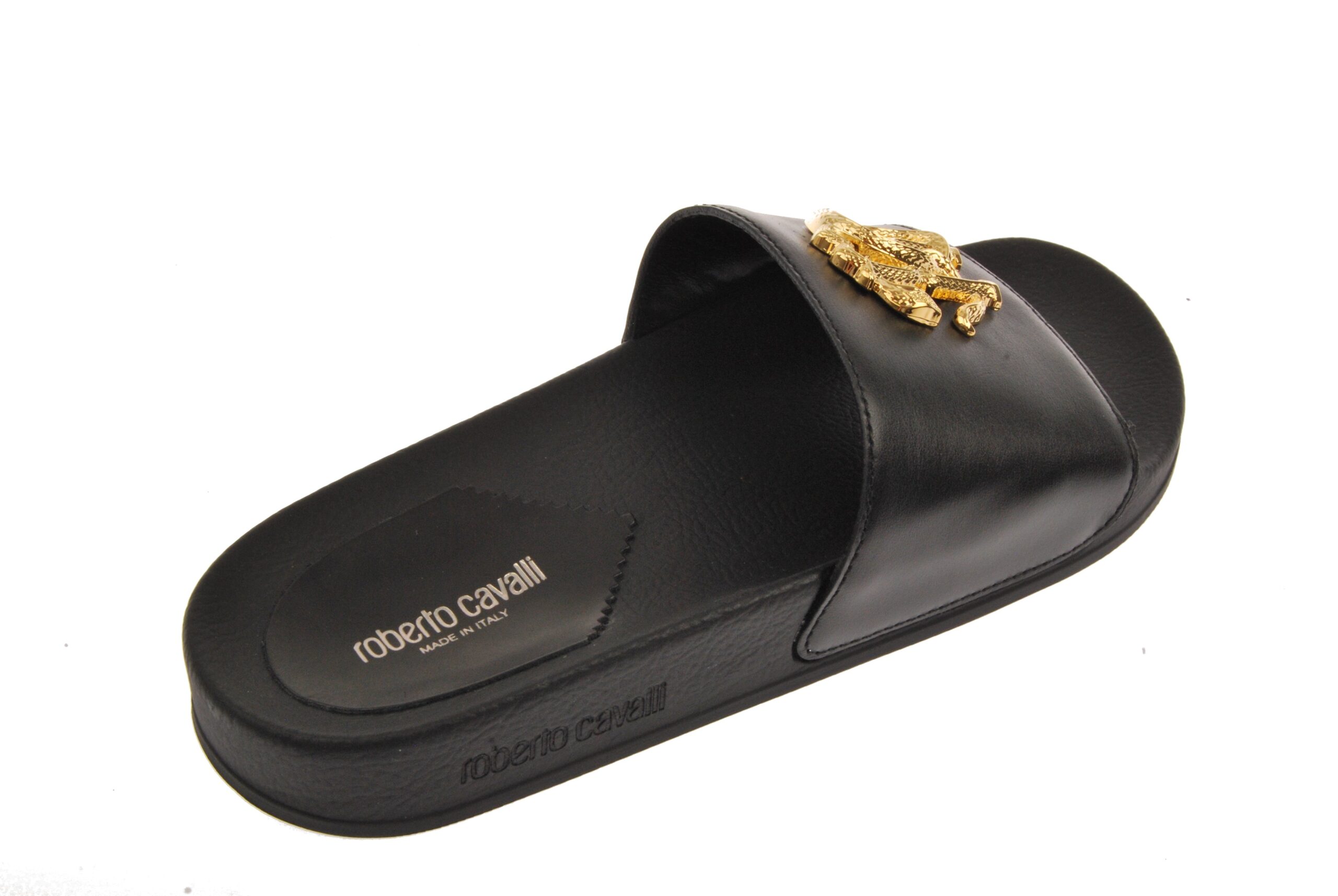 This Gold Crest Leather Sport Slide makes a statement. This luxury slide is made of 100% upper leather and has a magnificent gold crest accent with a smooth finish for extra flair. You’ll distinguish yourself from the crowd with its iconic look and comfy fit. The Robert Cavalli Gold Crest Leather Sport Slide is ideal for a day out in the sun or a night out in town. Product Care : Wipe Clean Material : Upper 100% Leather