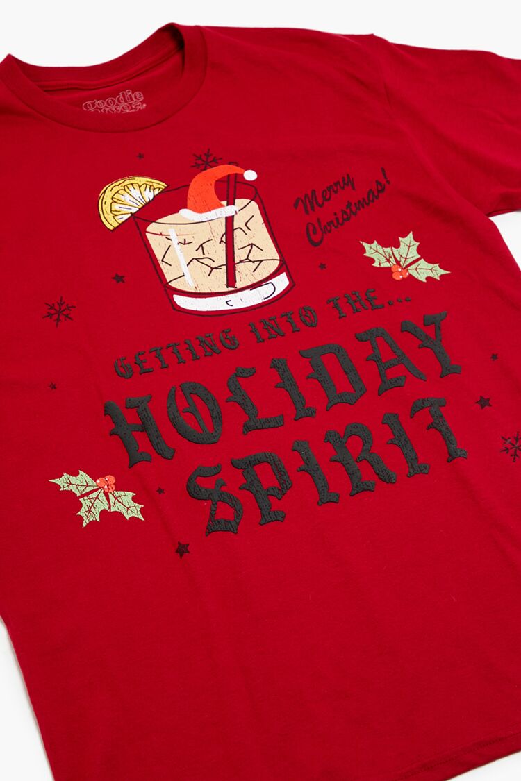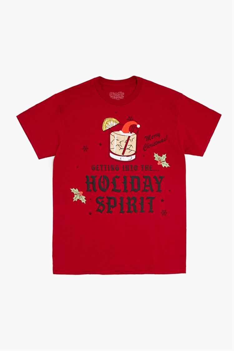 A knit unisex tee featuring a crew neck, front ‘Merry Christmas!’ and ‘Getting Into The… Holiday Spirit’ text, accompanying cocktail with a lemon wedge and Santa hat, mistletoe, and snowflake graphics, and short sleeves.Content + Care