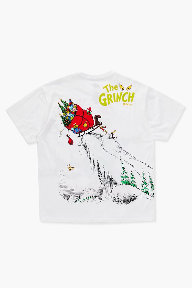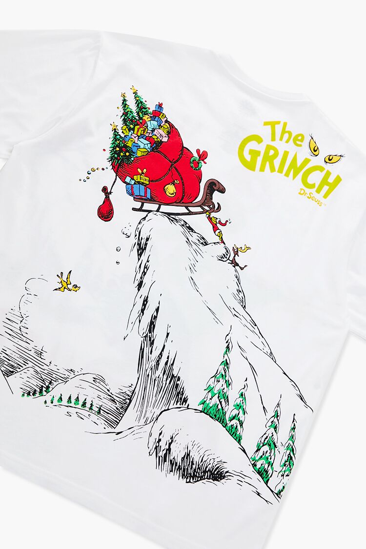 A knit tee featuring a crew neck, front ‘How The Grinch Stole Christmas!’ text, accompanying character with Christmas tree graphic, short sleeves, back ‘The Grinch’ text, and accompanying sleigh graphic.- Officially licensed product