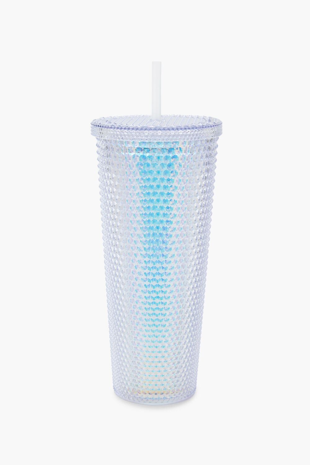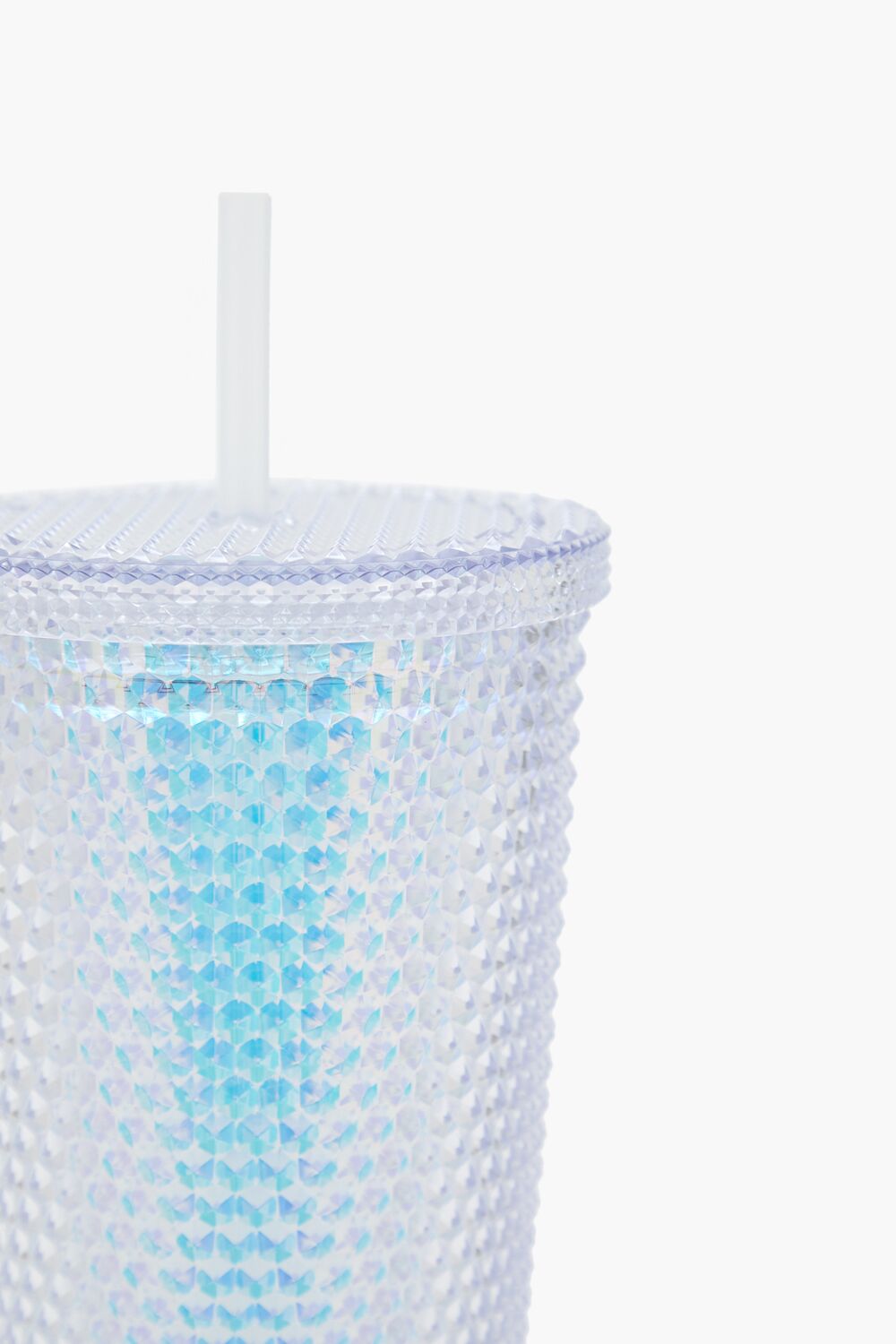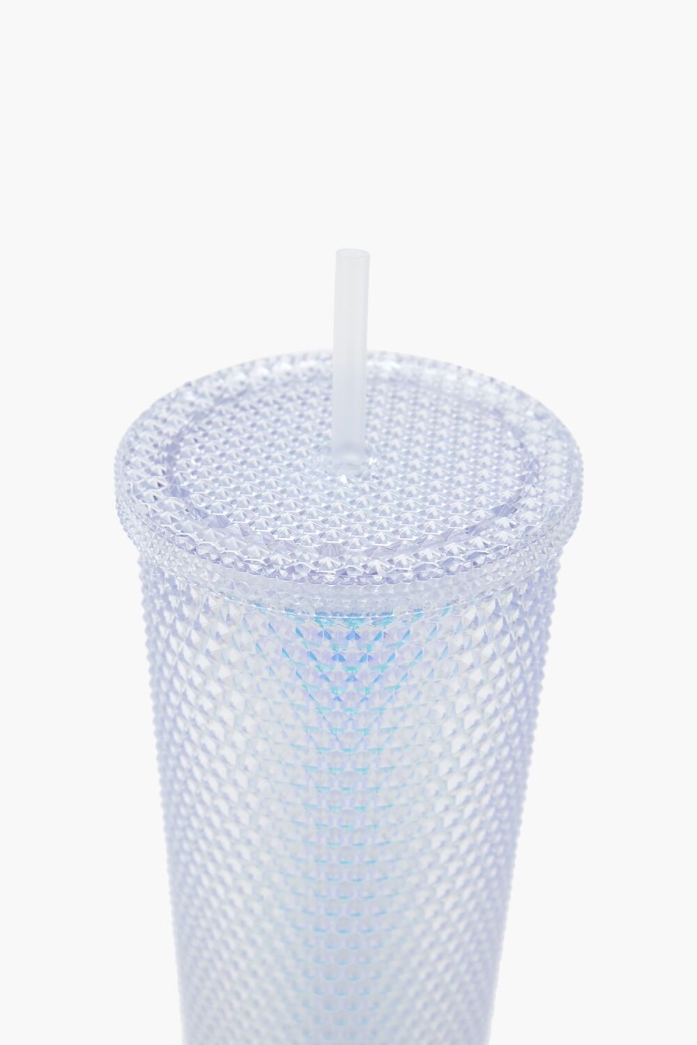 A tumbler featuring a textured design, iridescent finish, transparent construction, lid, and straw.Content + Care
