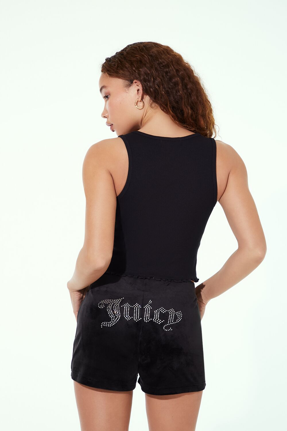 From our Juicy Couture x Forever 21 collection, this velour tank top features an allover ribbed construction, front ‘Juicy’ text, rhinestone embellishments, square-cut neckline, and lettuce-edge hem.- Officially licensed product