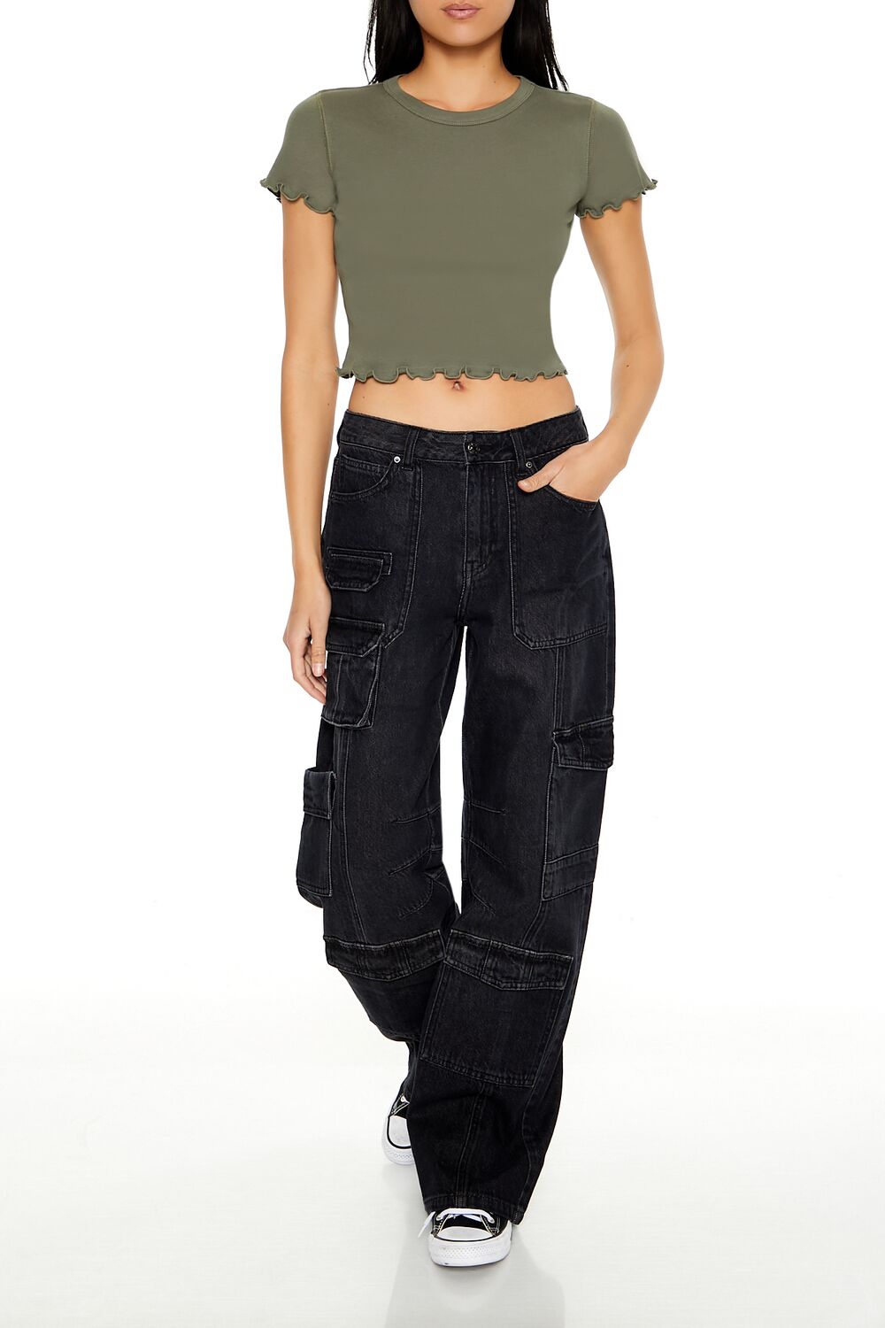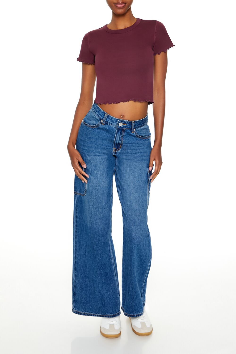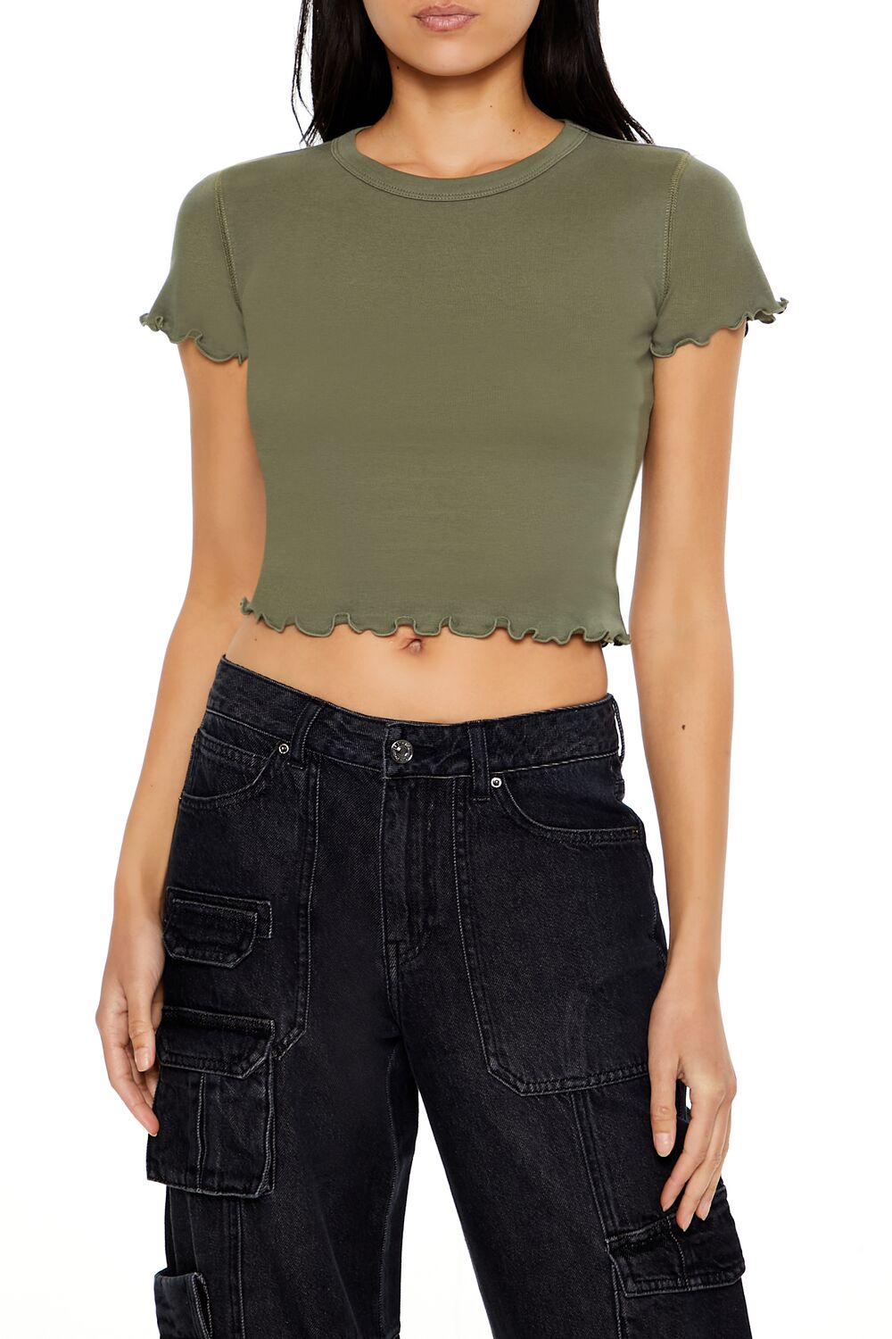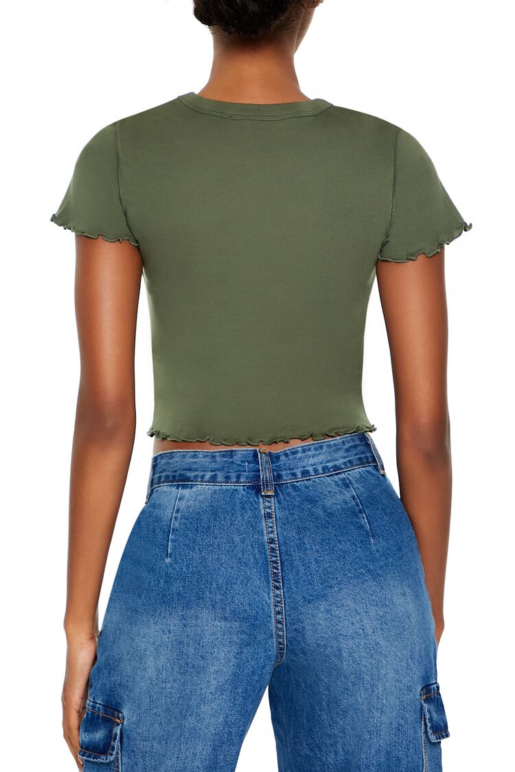A knit baby tee featuring a round neckline, short sleeves, lettuce-edge trim, and cropped hem.Content + Care