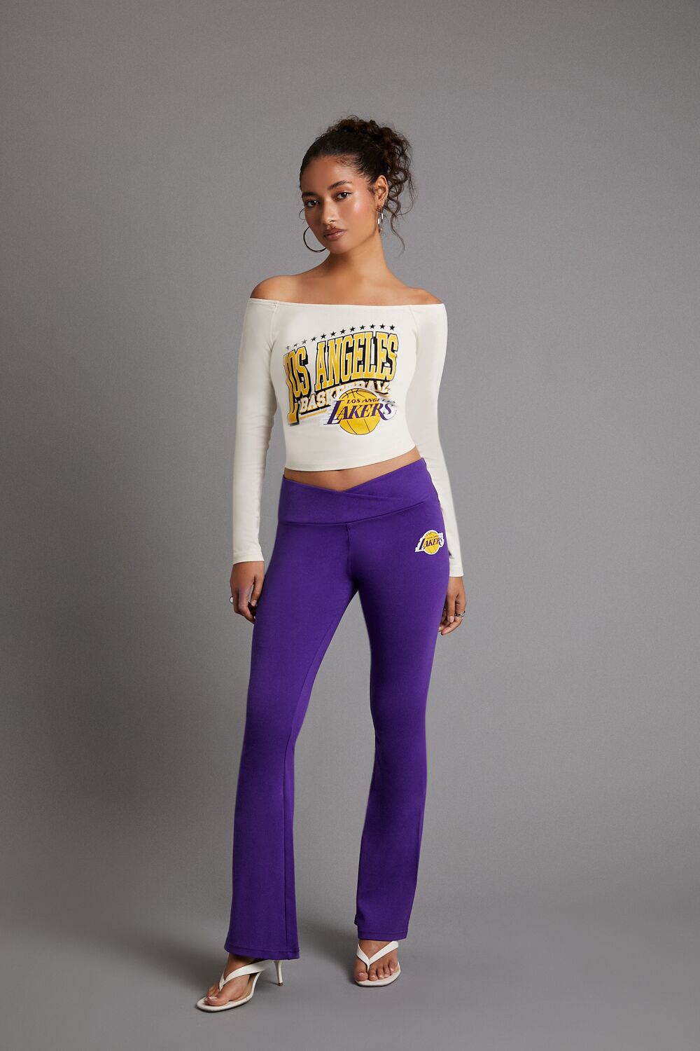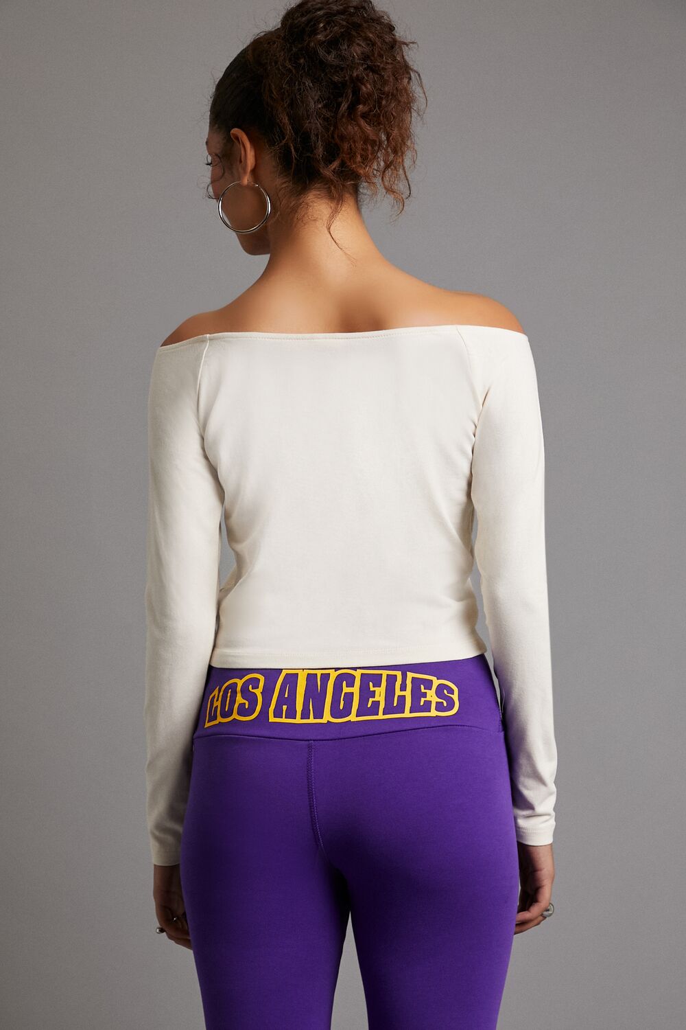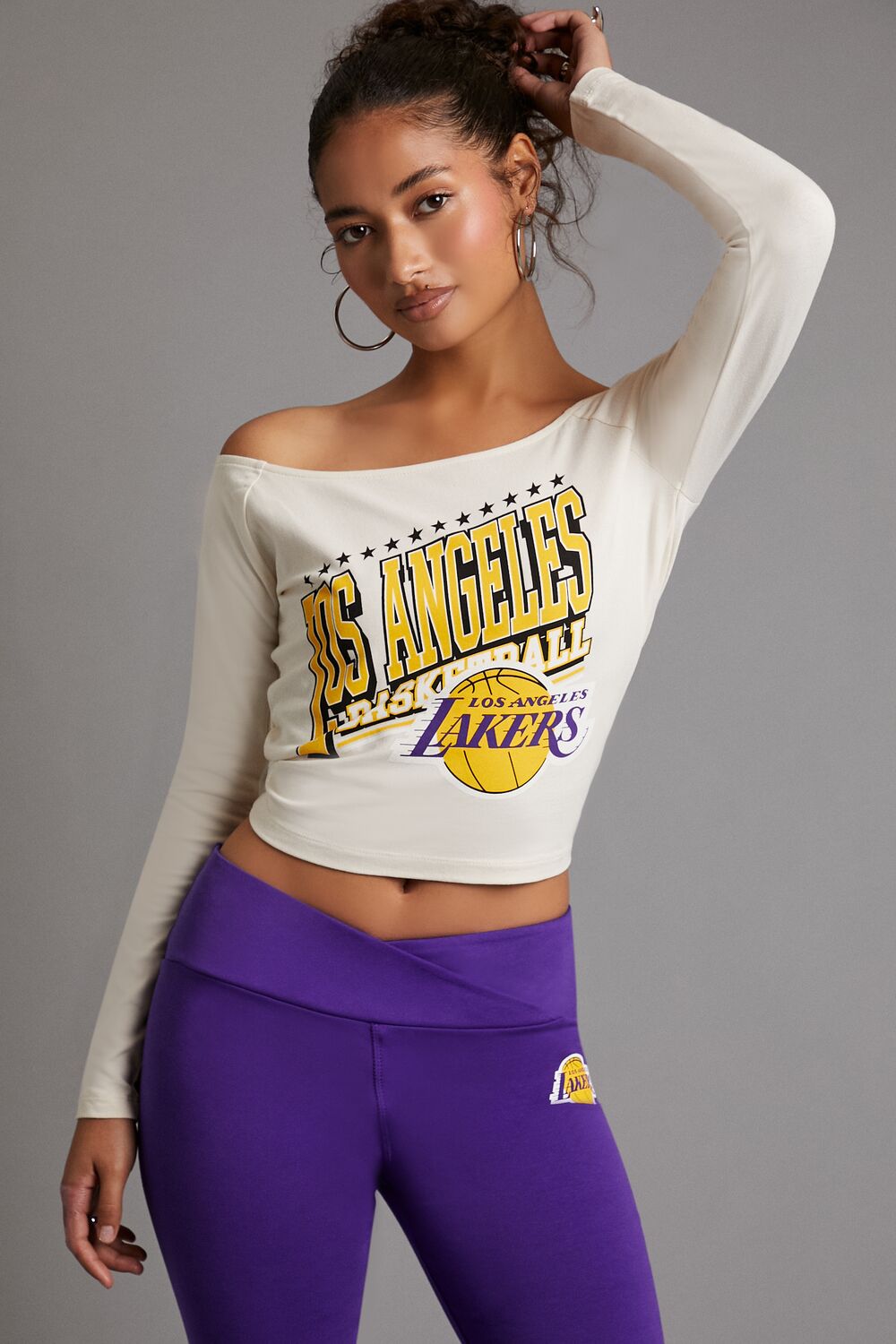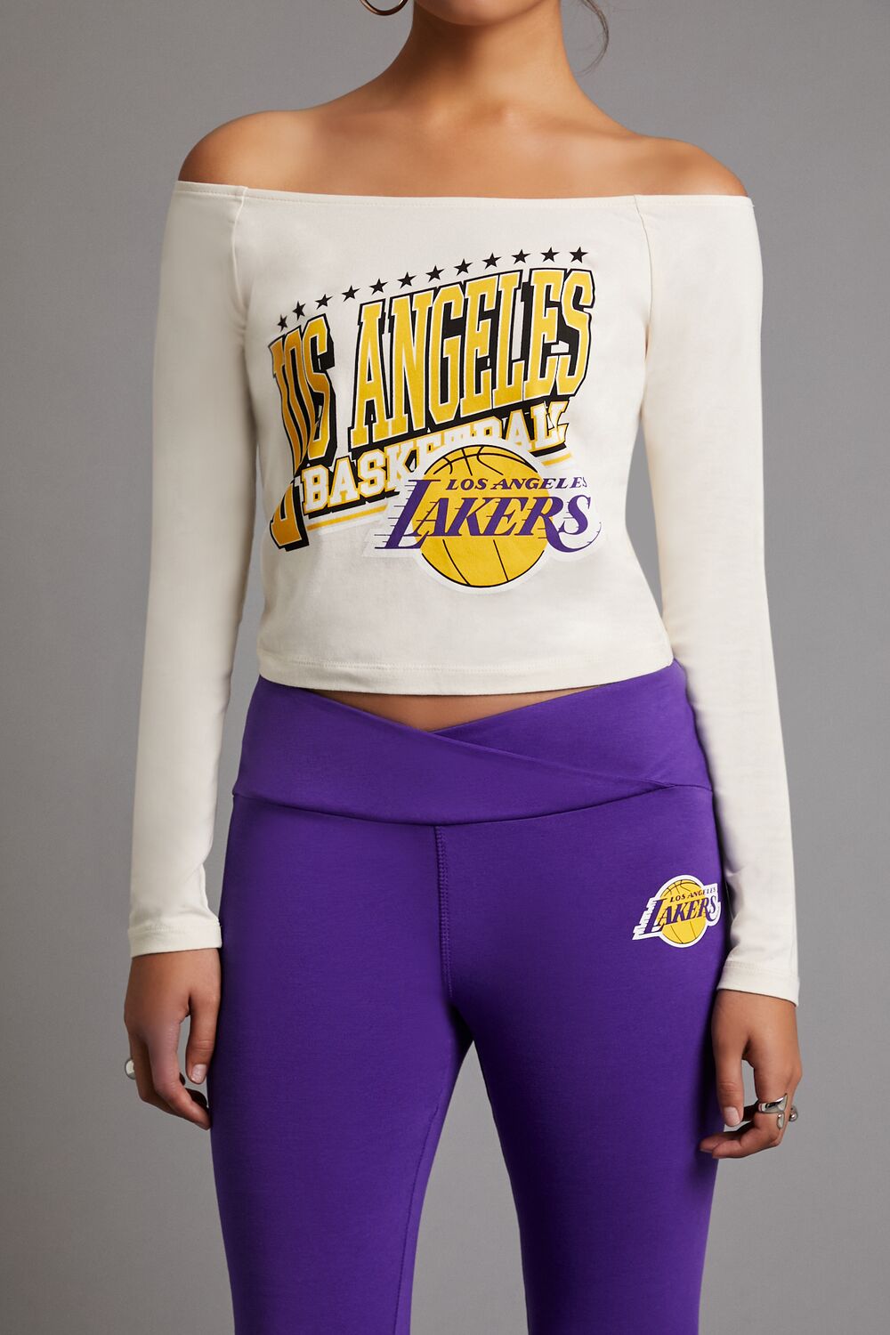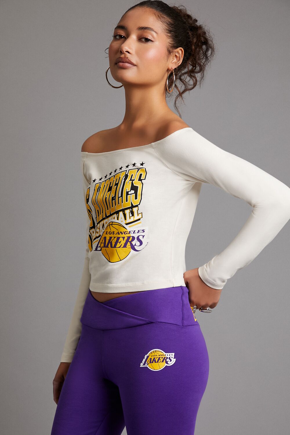 A knit top featuring an off-the-shoulder neckline, long sleeves, front ‘Los Angeles’ and ‘Basketball’ text, accompanying front Los Angeles Lakers logo, and a cropped hem.- Officially licensed product