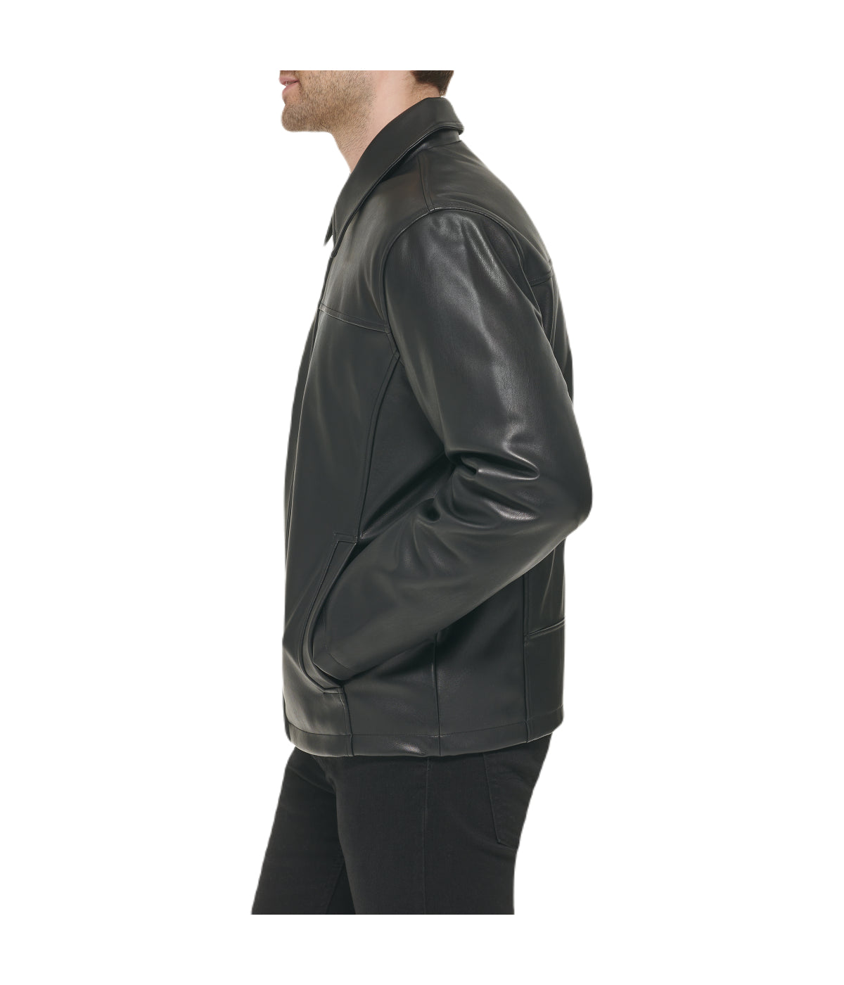 A spread collar and grainy faux-leather define a cool and collected open-bottom jacket that warms from the inside with its sleek quilted lining. Material: Polyester