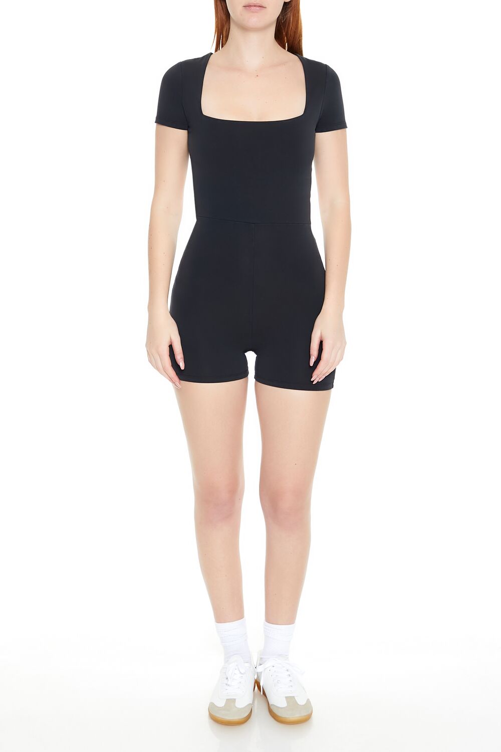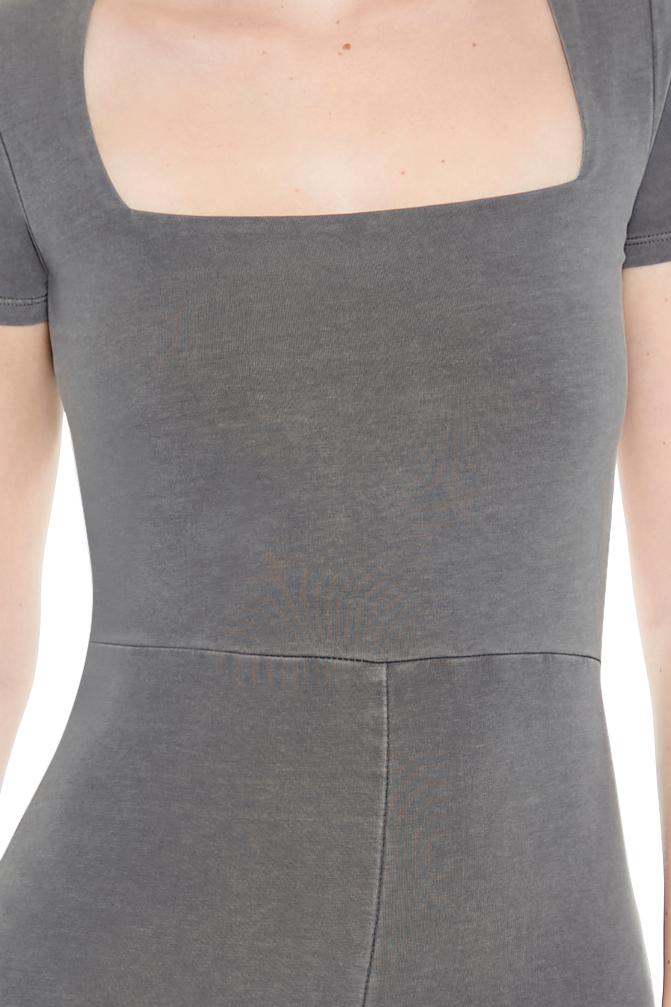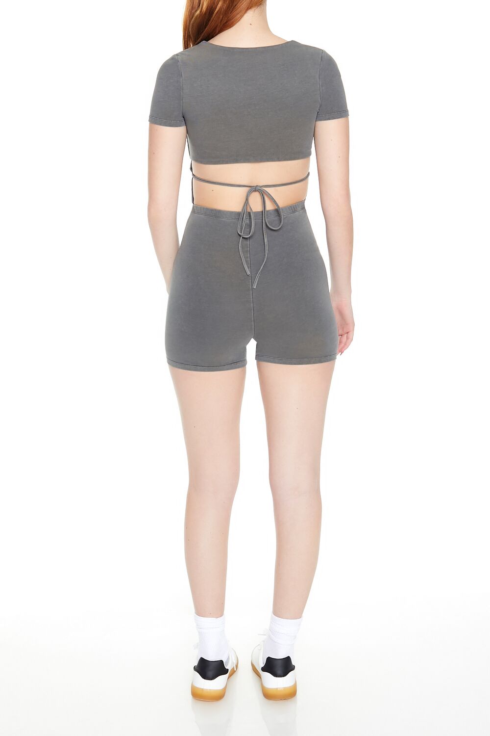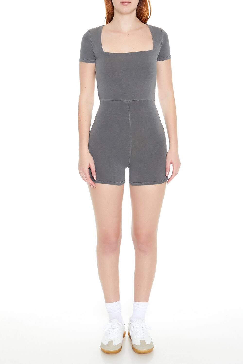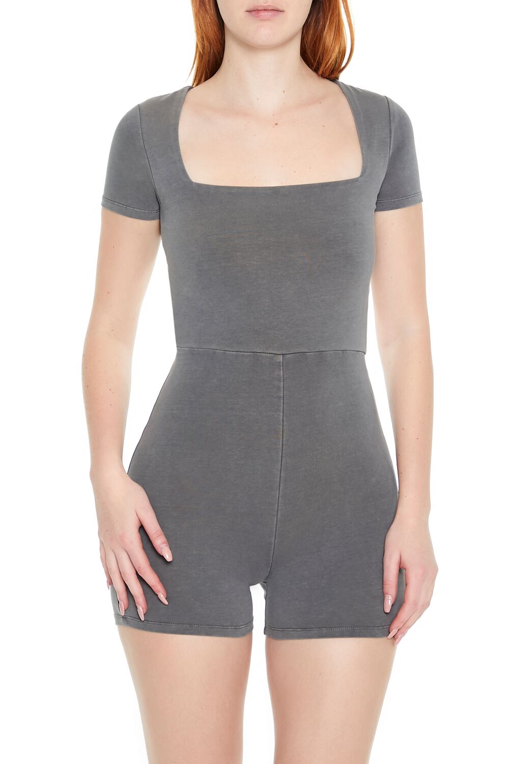 A knit romper featuring an allover mineral wash, square-cut neckline, short sleeves, back cutout with self-tie support strap, and fitted silhouette.Content + Care