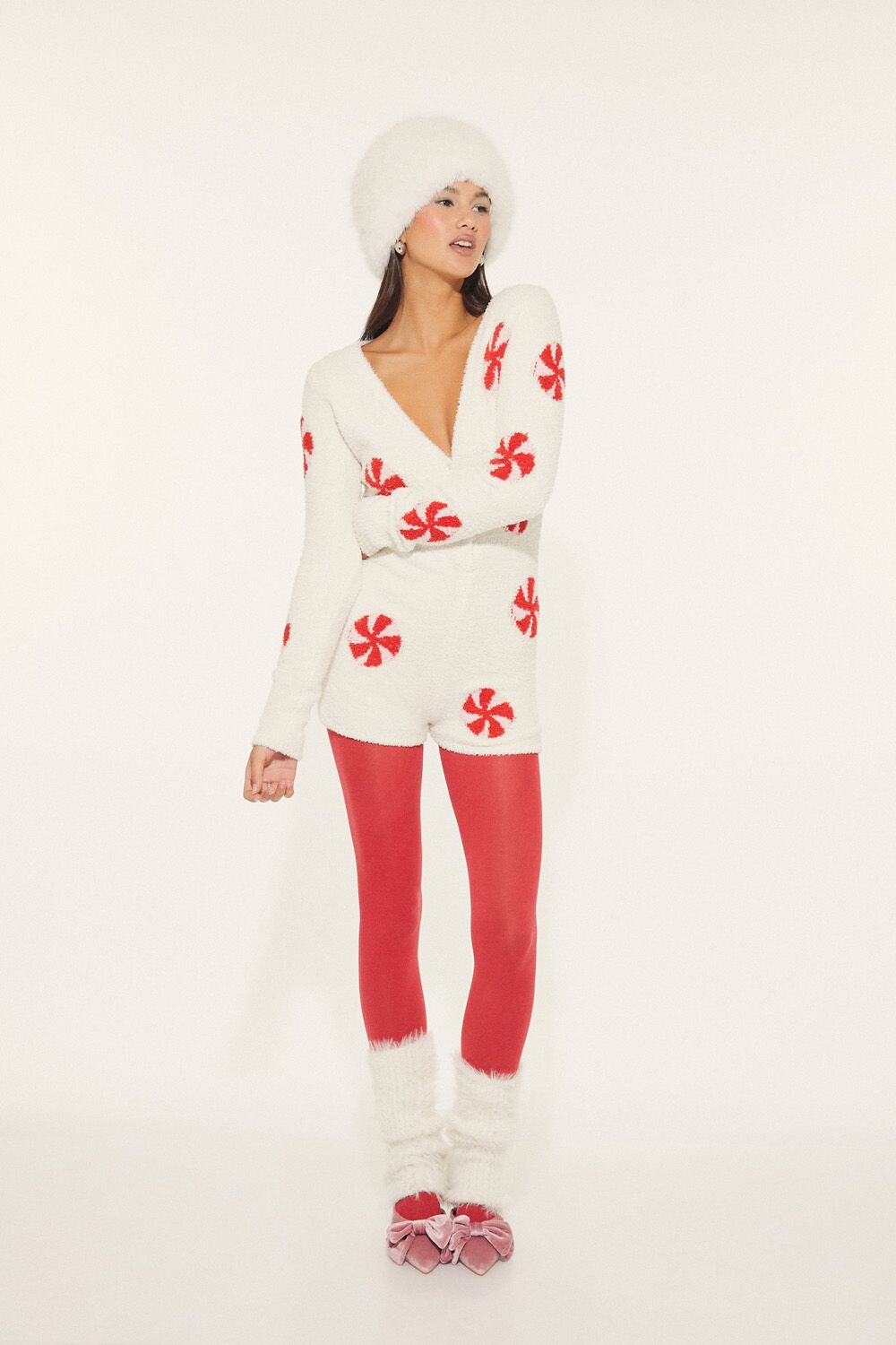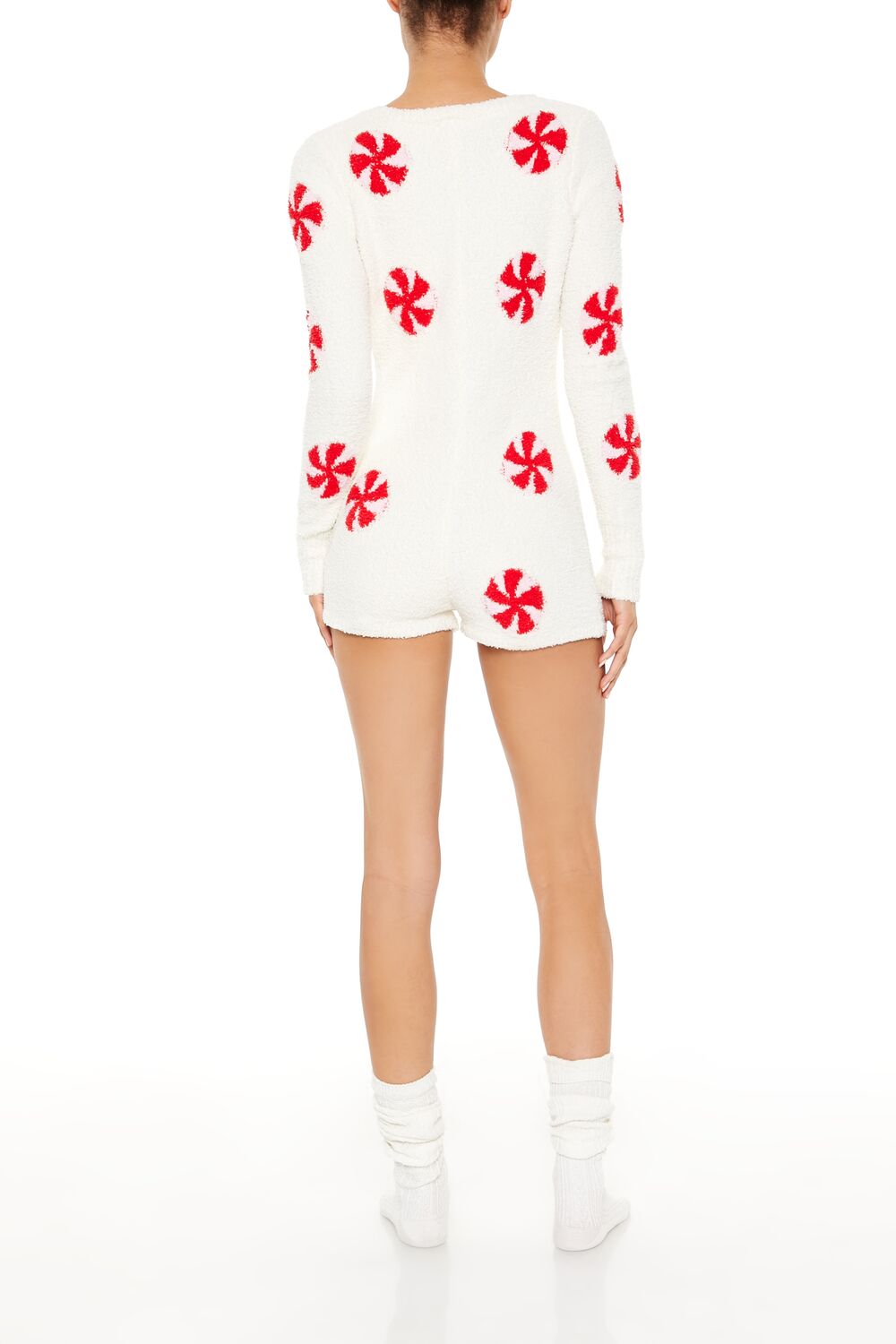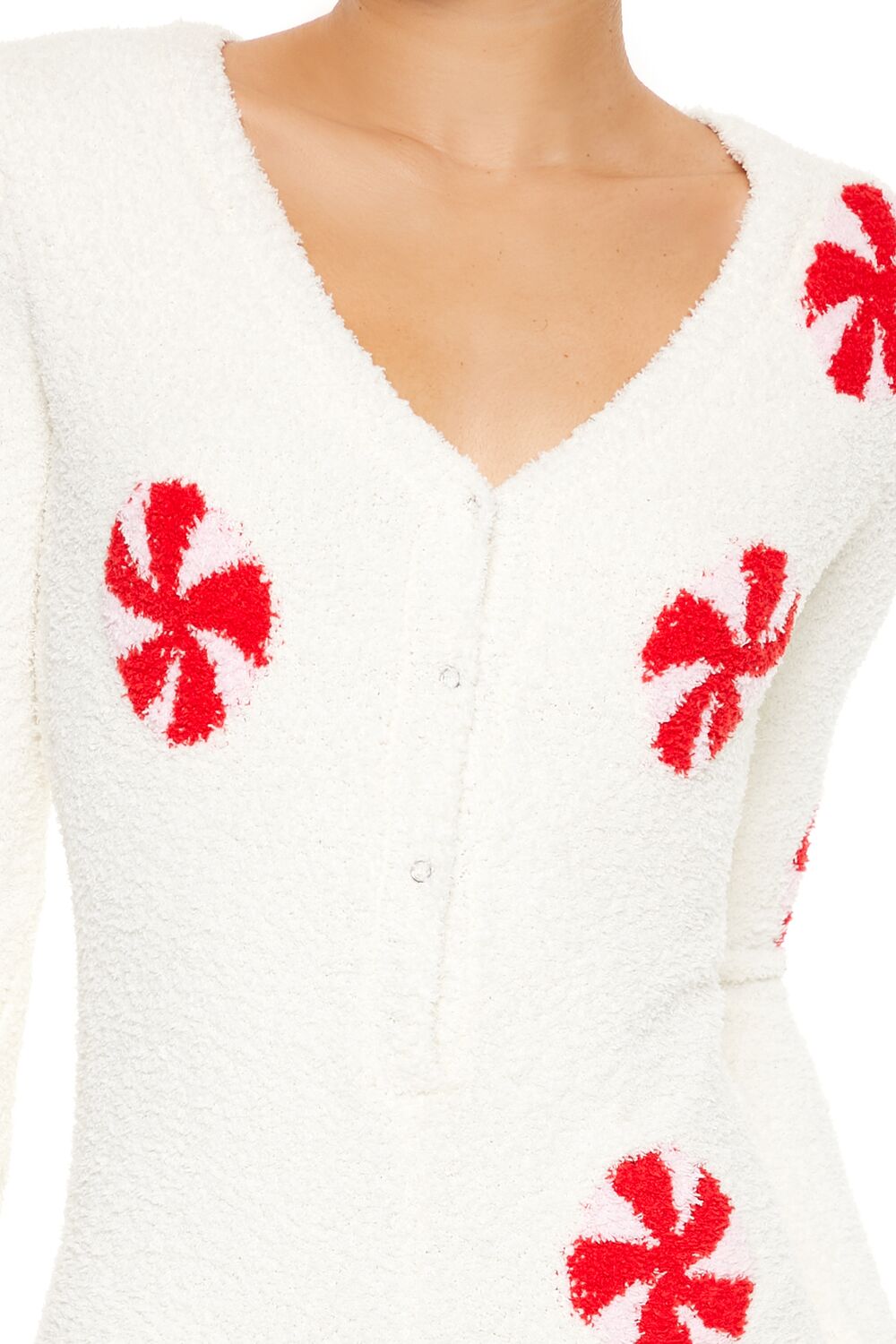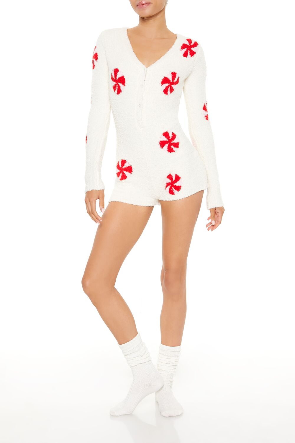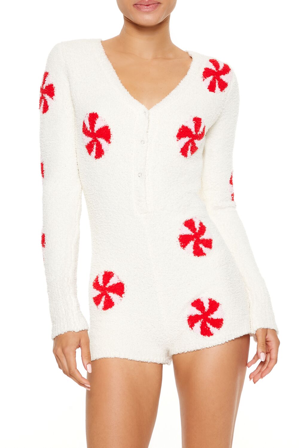 A plush pajama romper featuring allover peppermint candy graphics, a V-neckline, half snap button-front closures, long sleeves, and fitted silhouette.Content + Care