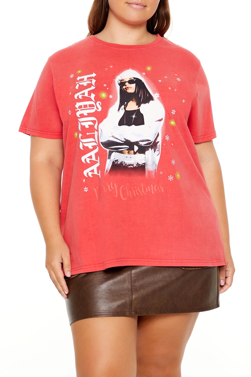 Forever 21+ – A jersey knit tee featuring a crew neck, front ‘Aaliyah’ and ‘Merry Christmas’ text, accompanying music artist and snowflake graphics, and short sleeves.- Officially licensed product