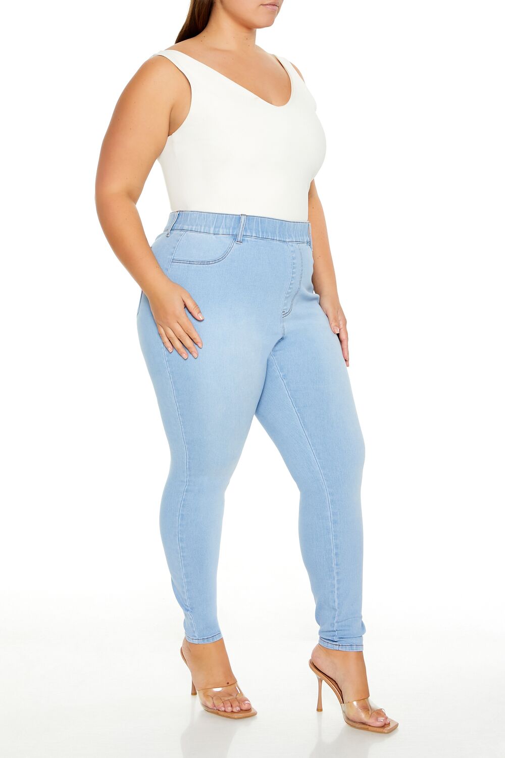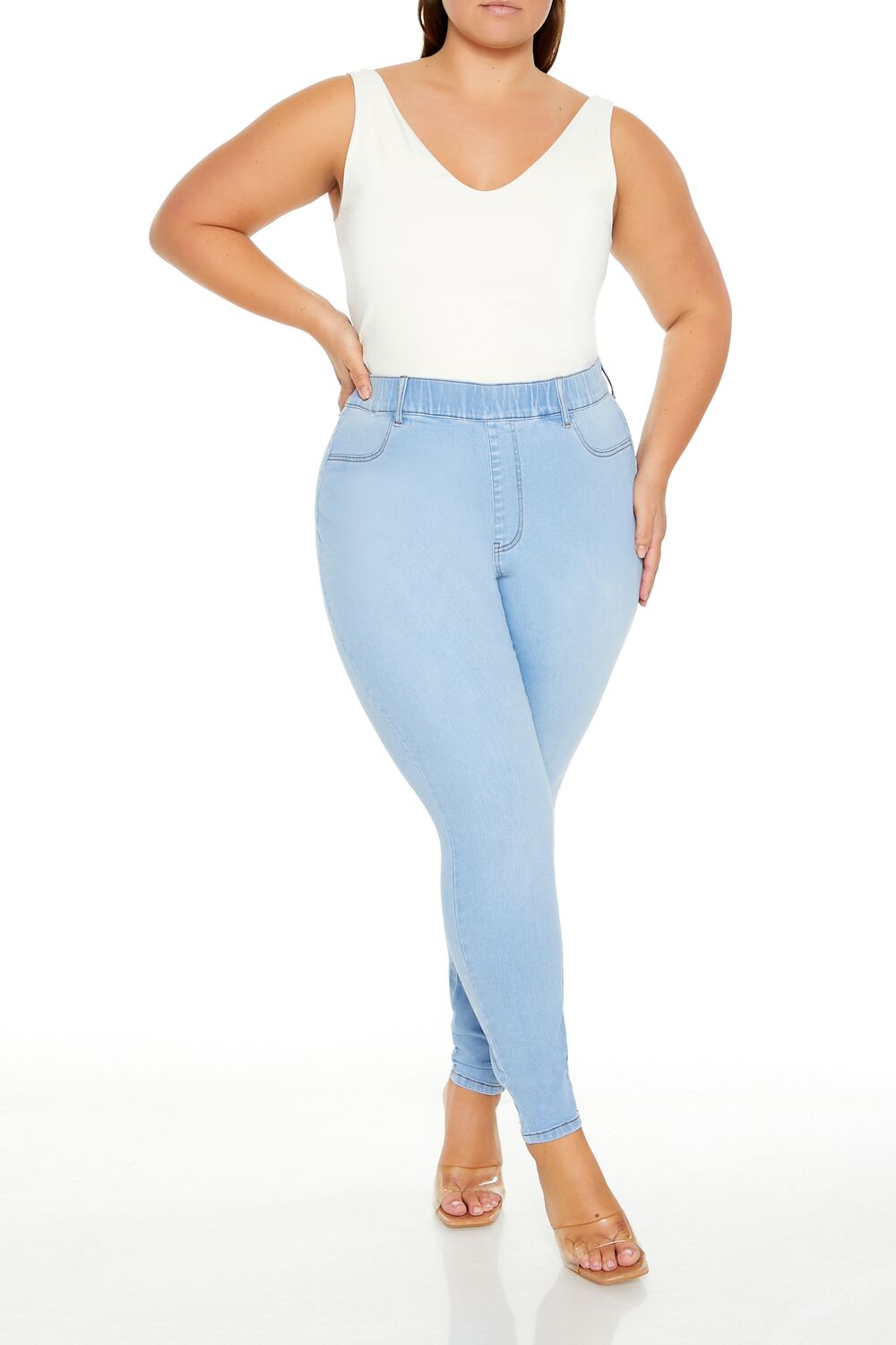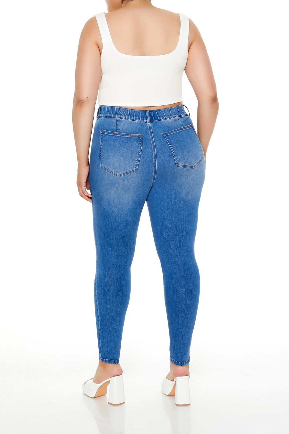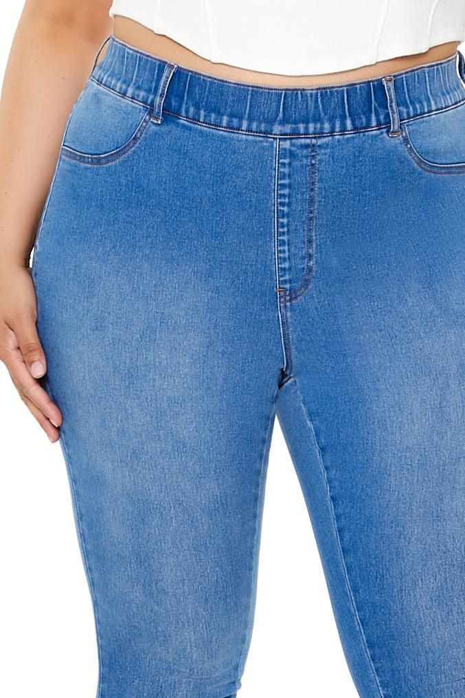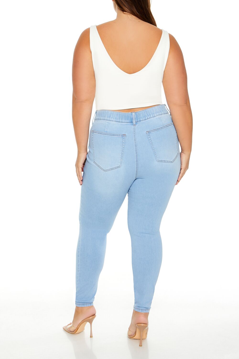 Forever 21+ – Crafted from non-stretch denim, this pair of skinny jeans features an allover stone wash, elasticized high-rise waist, belt loops, mock zip fly, slanted front pockets, and back patch pockets.Content + Care