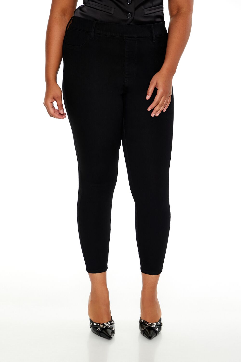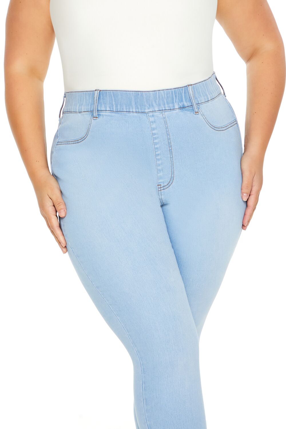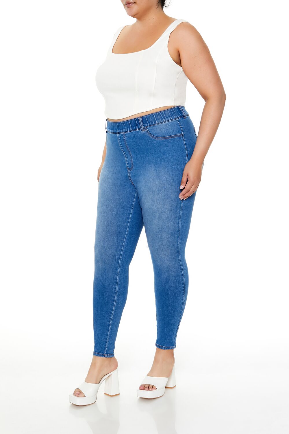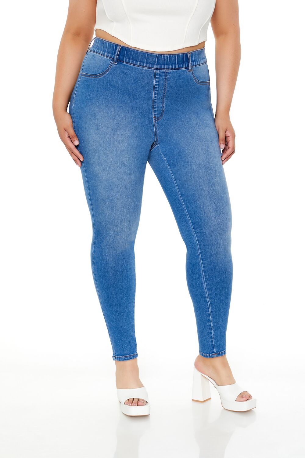 Forever 21+ – Crafted from non-stretch denim, this pair of skinny jeans features an allover stone wash, elasticized high-rise waist, belt loops, mock zip fly, slanted front pockets, and back patch pockets.Content + Care