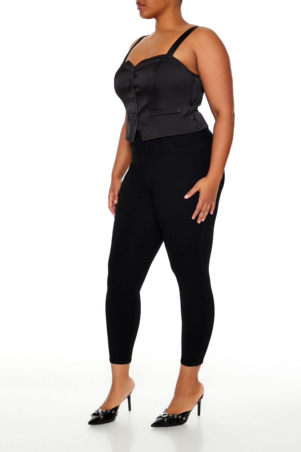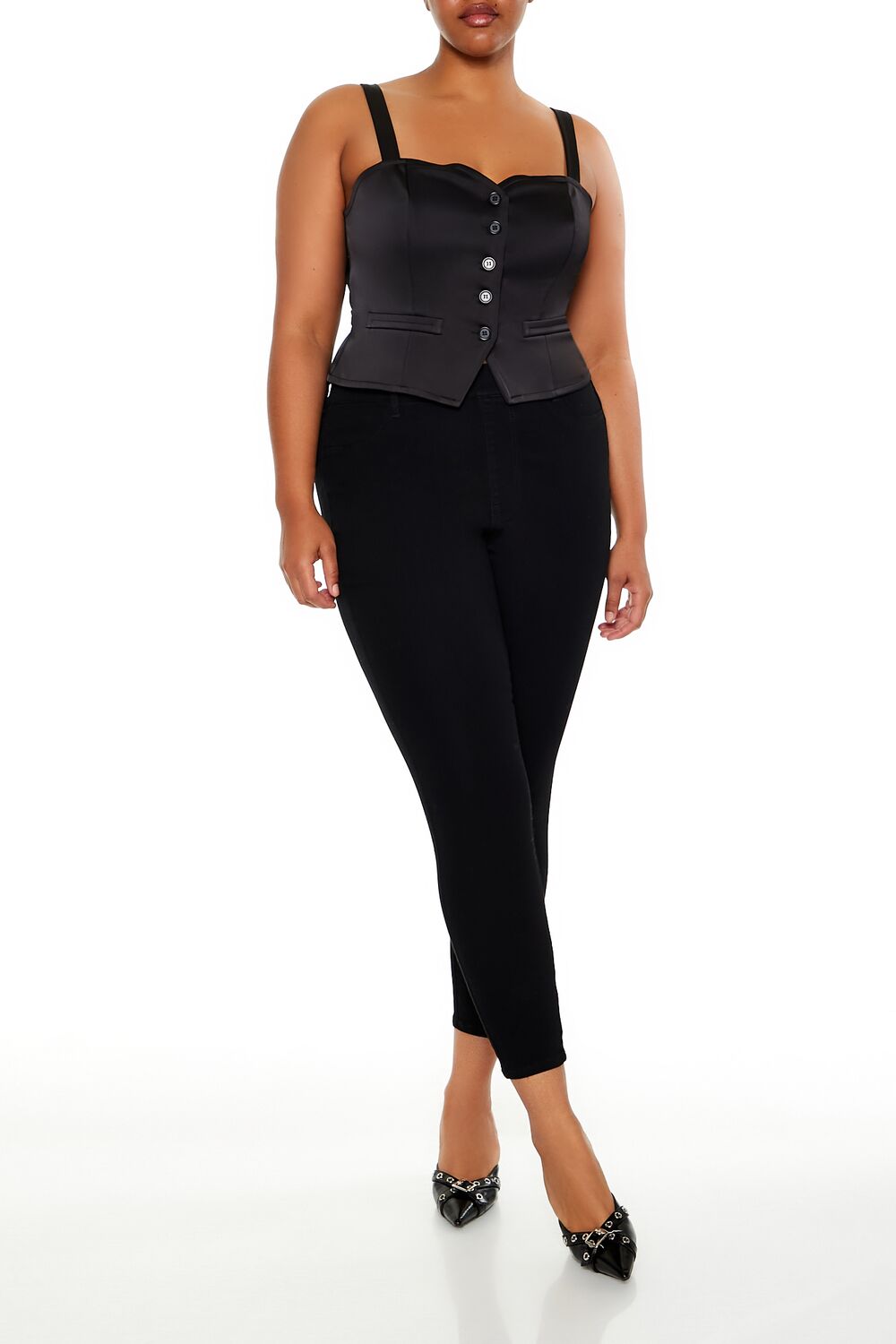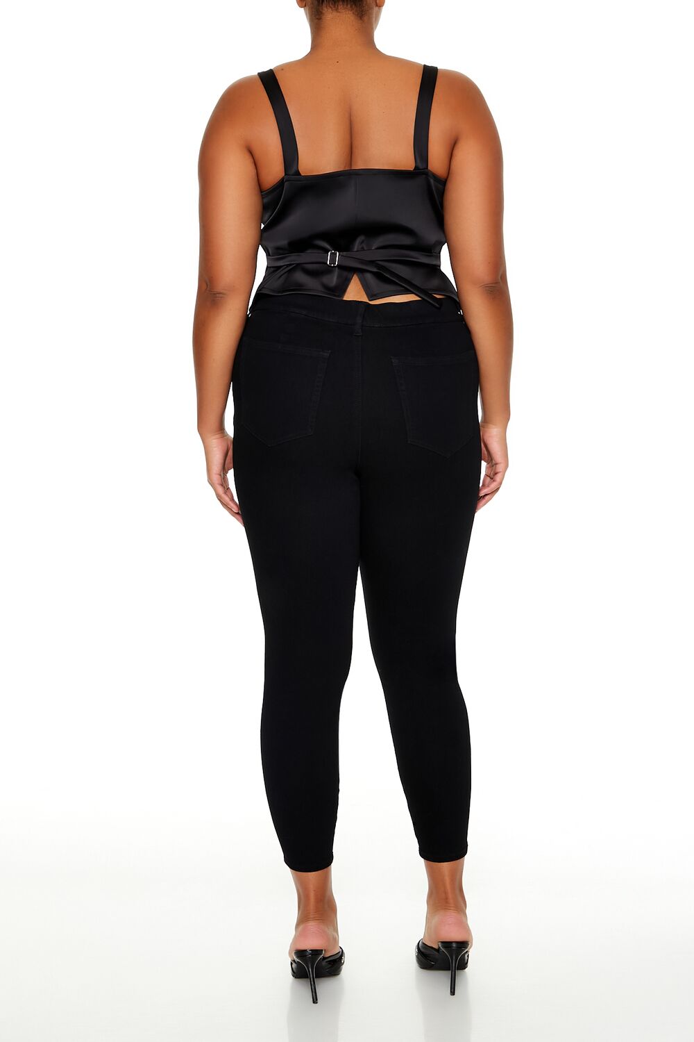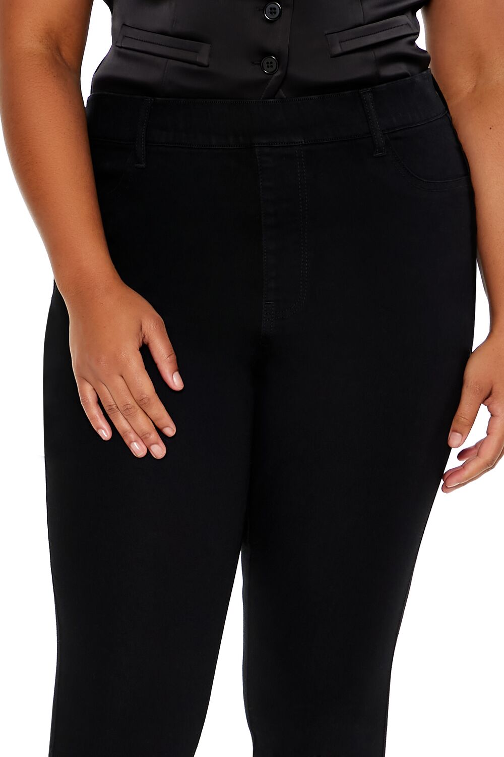 Forever 21+ – Crafted from non-stretch denim, this pair of skinny jeans features an allover stone wash, elasticized high-rise waist, belt loops, mock zip fly, slanted front pockets, and back patch pockets.Content + Care