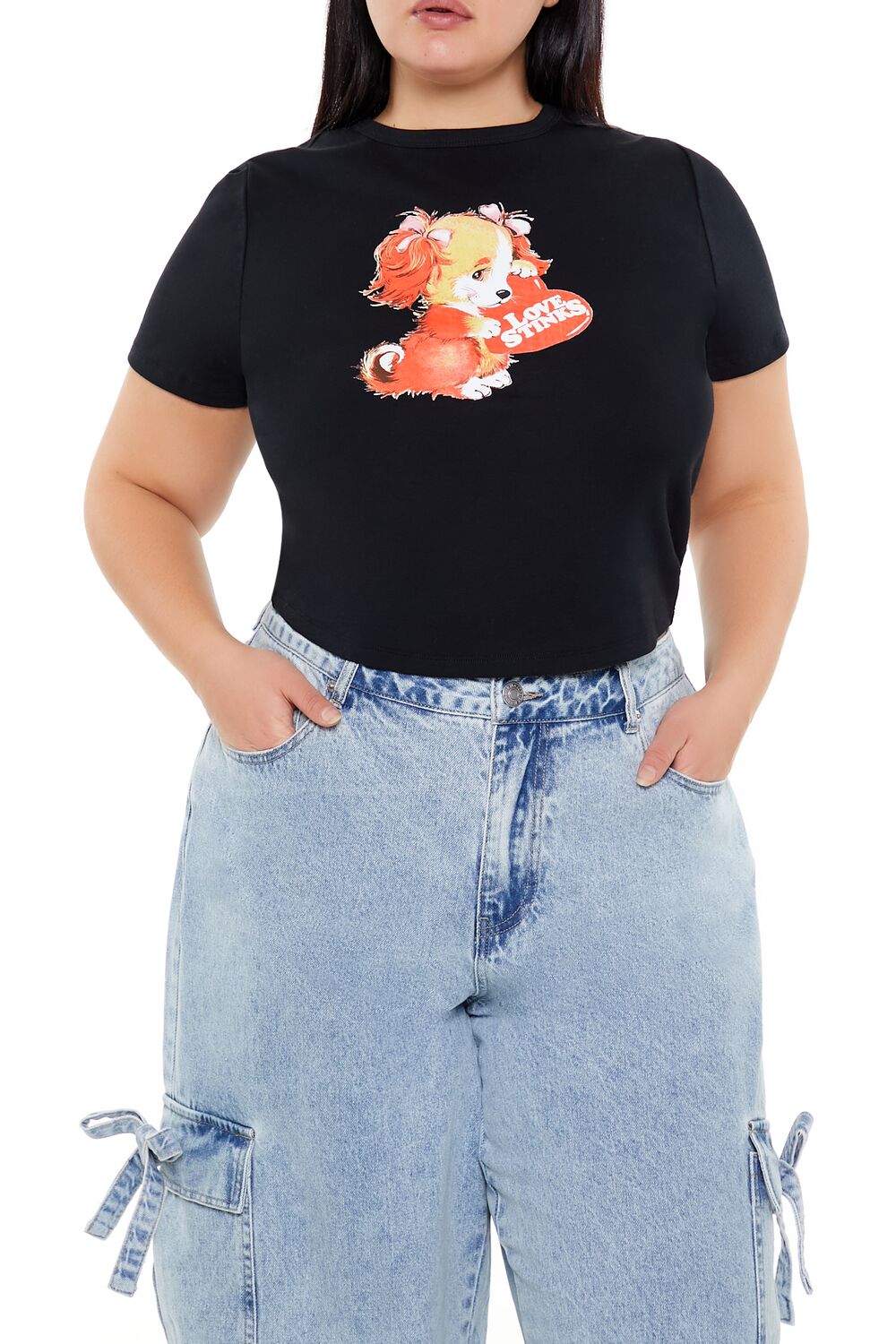 Forever 21+ – A knit baby tee featuring front ‘Love Stinks’ text, accompanying graphic of a dog with bows, short sleeves, a round neckline, and semi-cropped hem.Content + Care