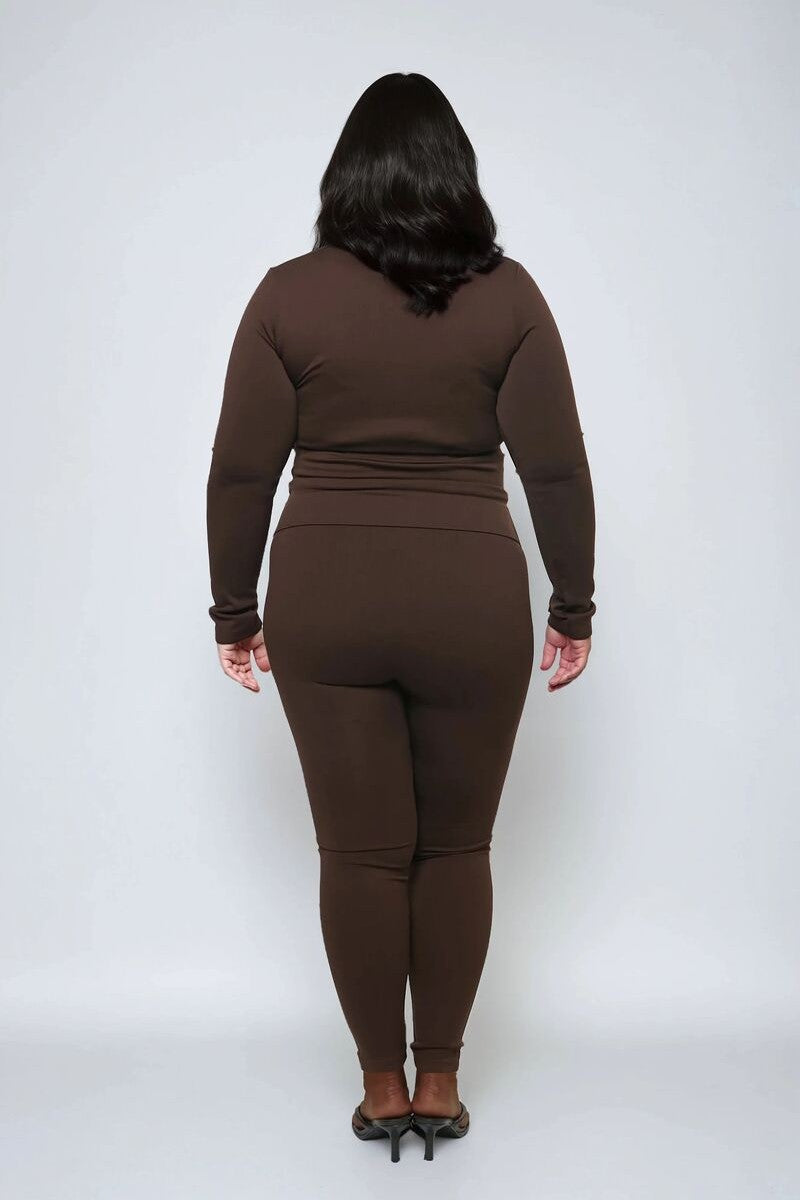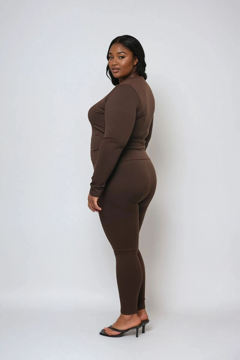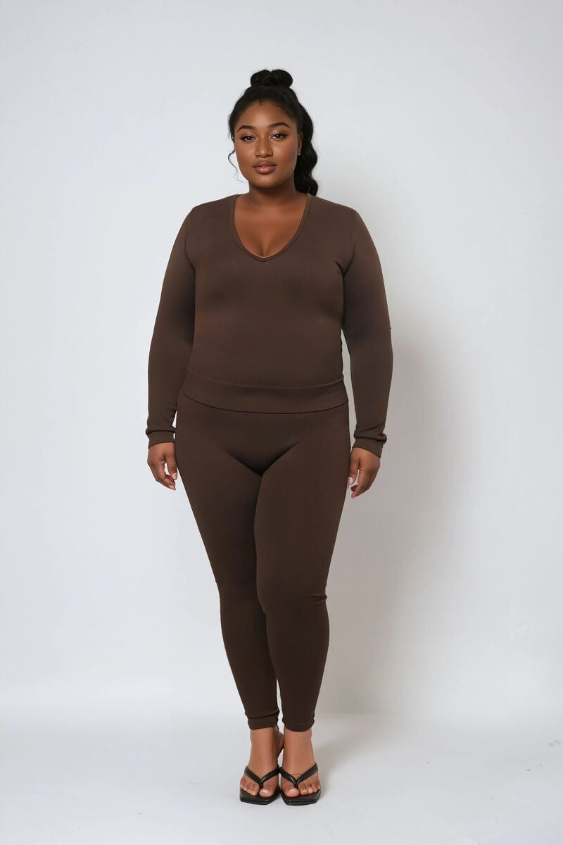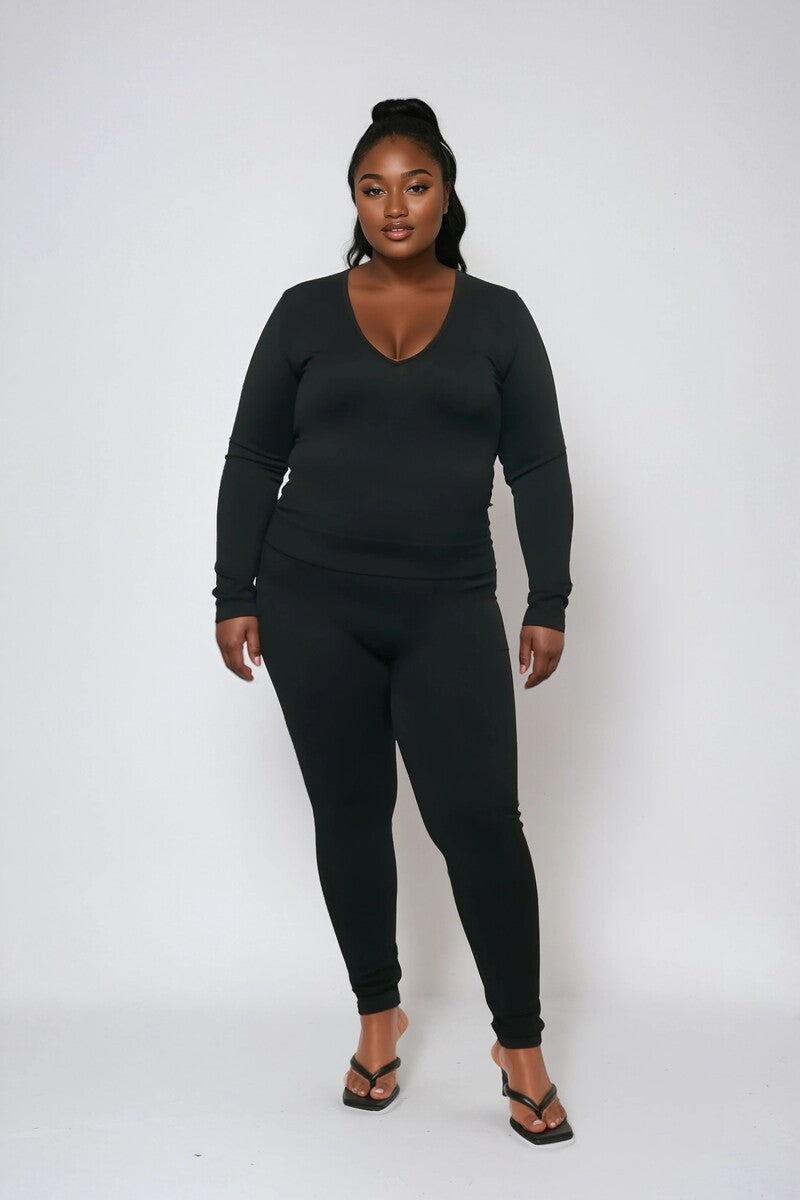 V-neck long sleeve top pairs perfectly with matching high-rise leggings