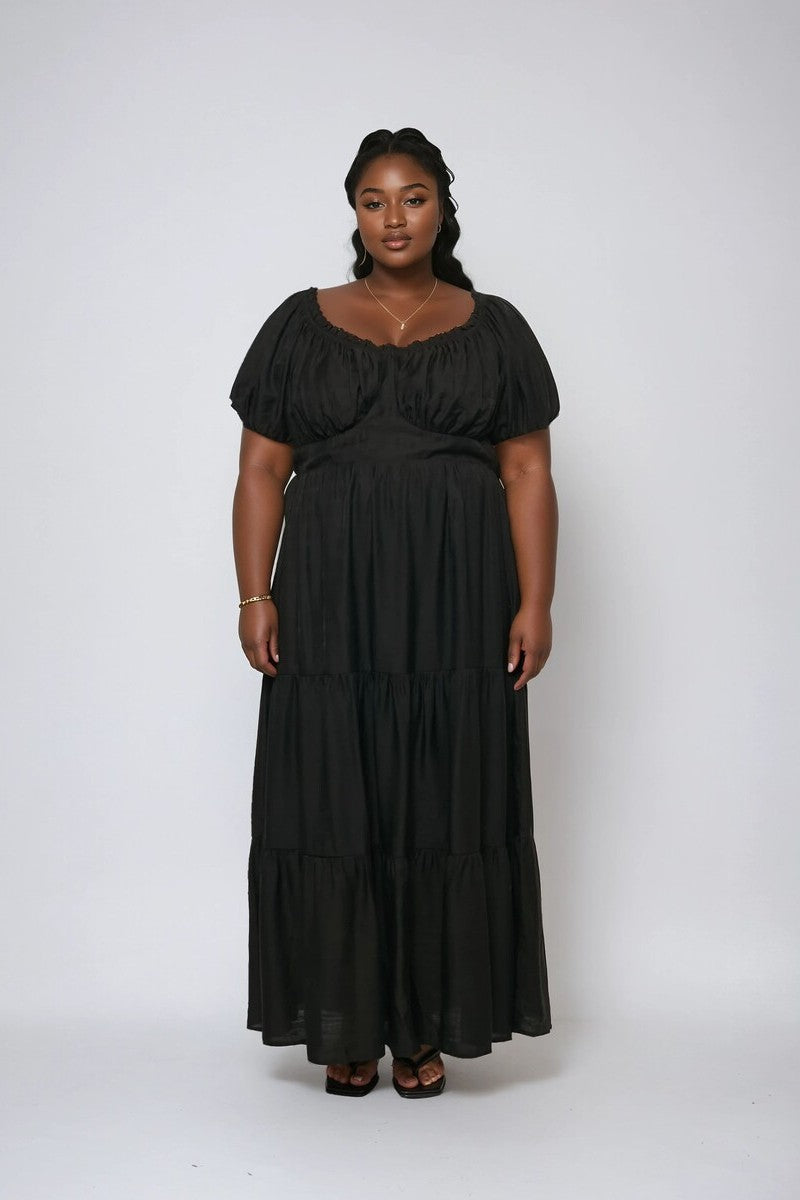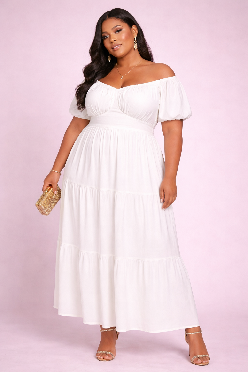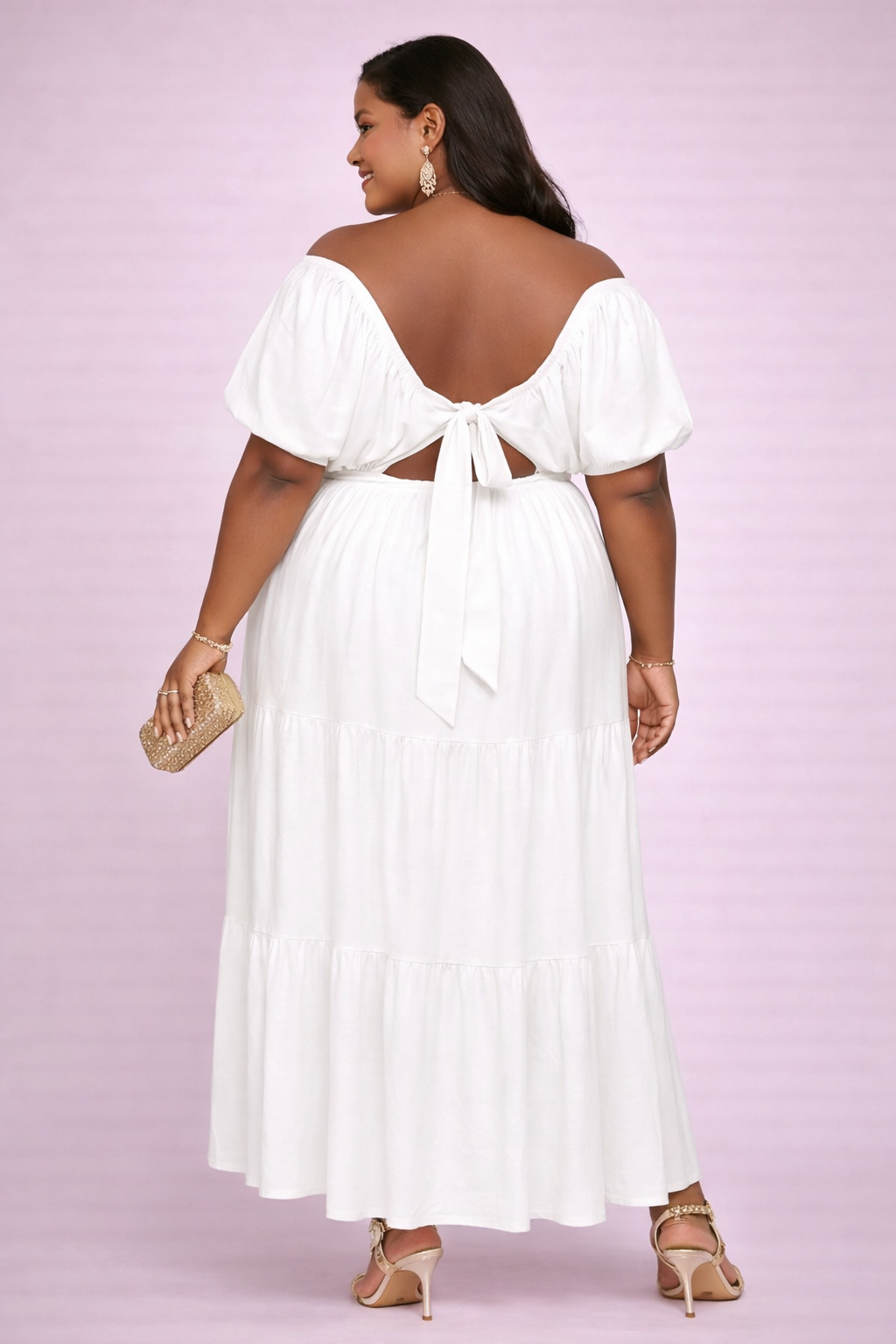 A woven maxi dress featuring ruffle trim, a sweetheart neckline, short puff sleeves, low-cut back with self-tie closure, tiered construction, and A-line silhouette.