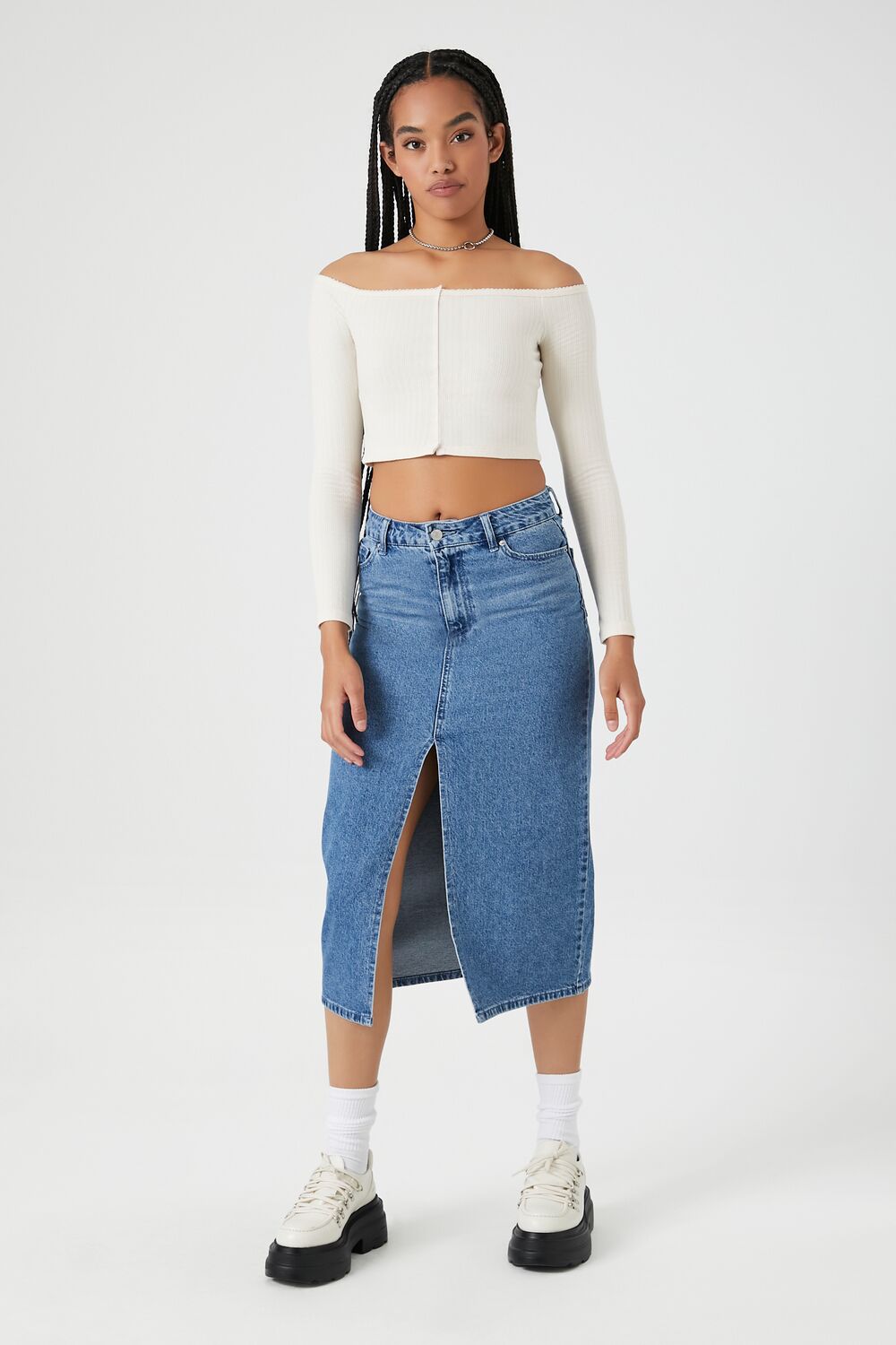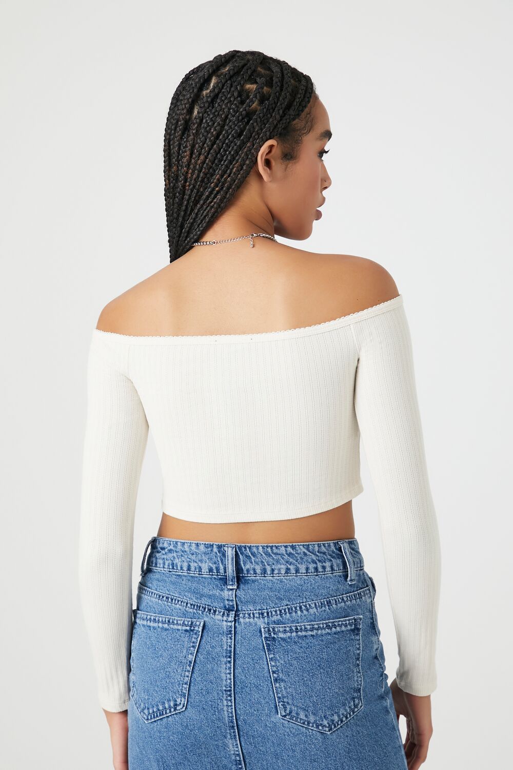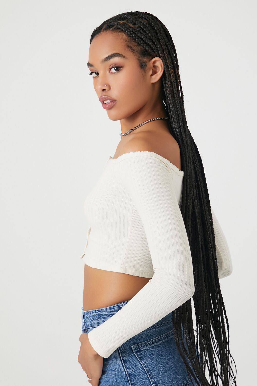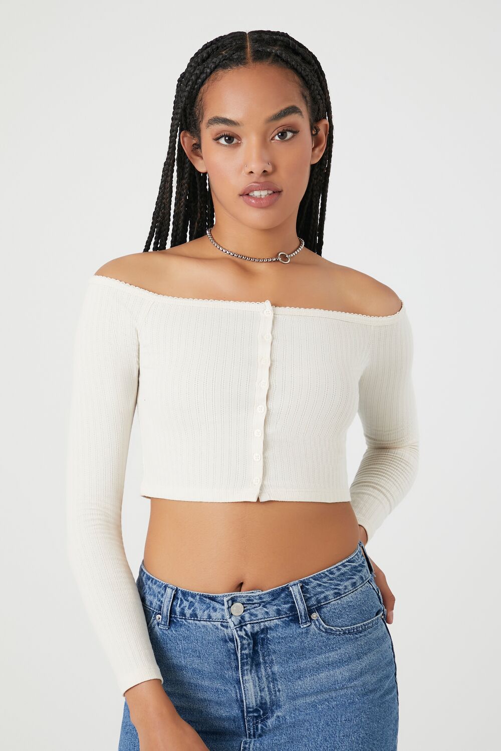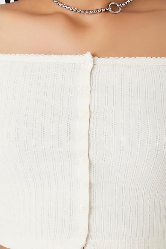 A Pointelle ribbed knit top featuring an off-the-shoulder neckline, long sleeves, button-front closures, and a cropped hem.Content + Care
