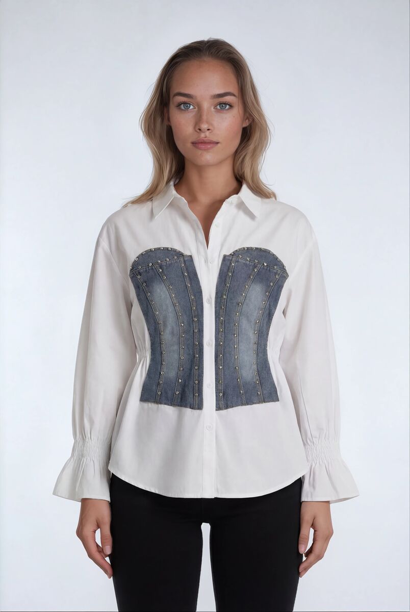 Illusion denim corset panel adds sculpted detailing and contrast texture