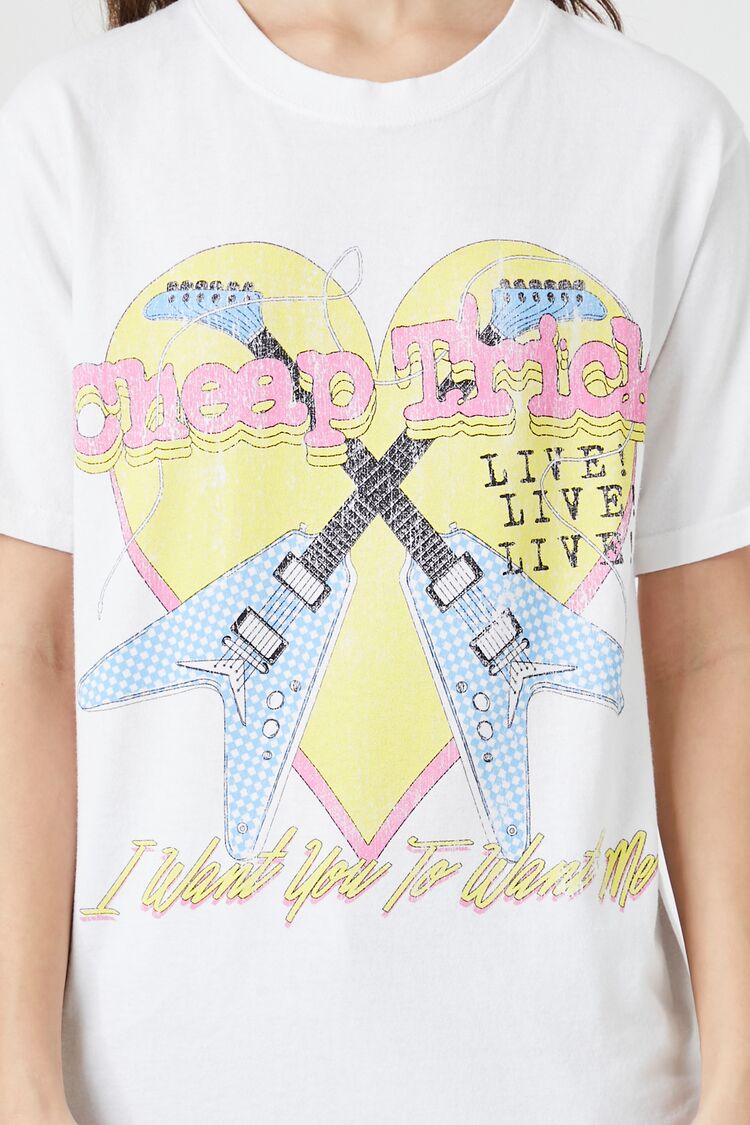 A knit tee by Prince Peter™ featuring front and back ‘Cheap Trick’ and ‘I Want You To Want Me’ graphics, front ‘Live! Live! Live!’ text and heart and guitar imagery, short sleeves, and a crew neck. (Officially licensed product)- This is an independent brand and not a Forever 21 branded item.