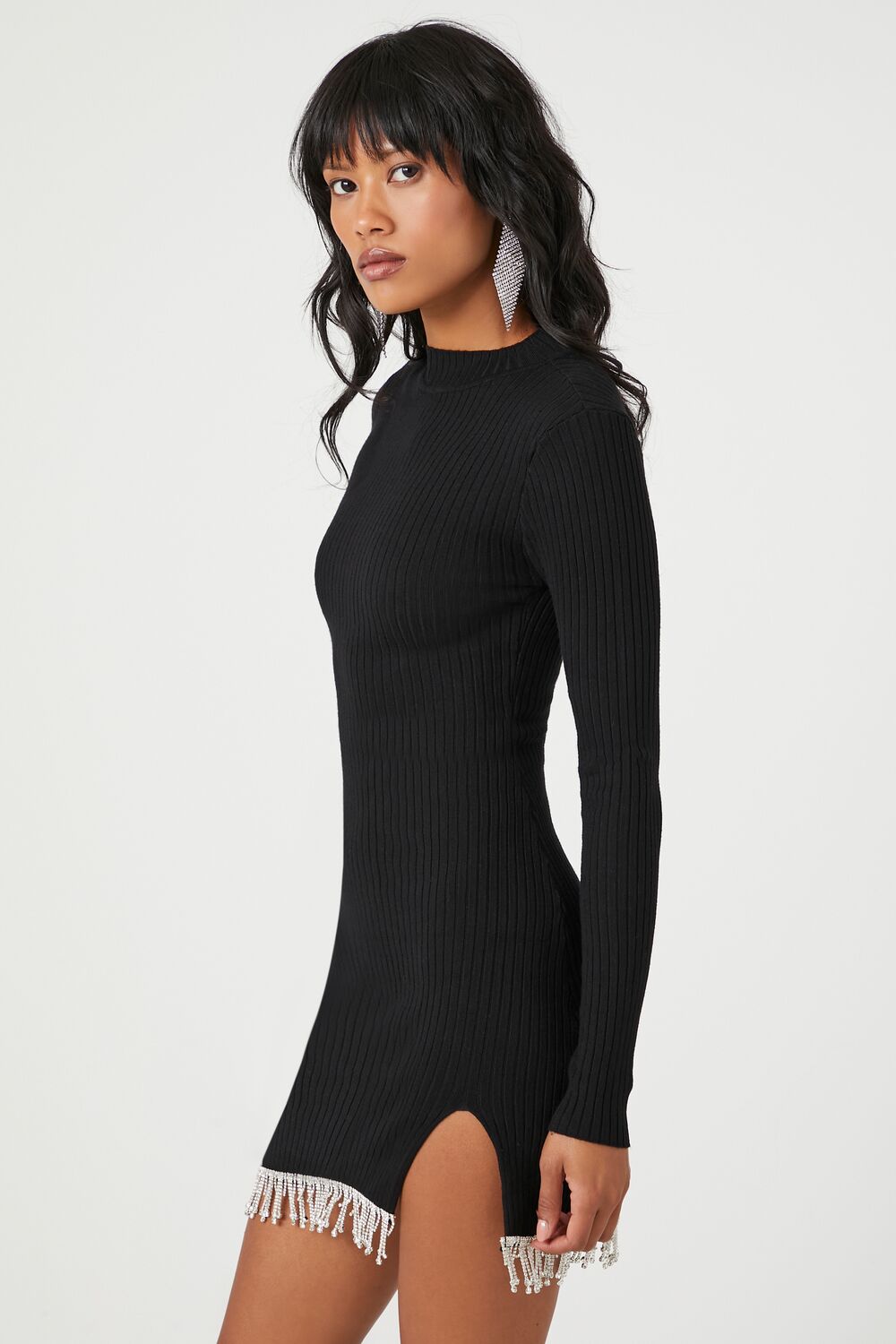 A ribbed knit sweater dress featuring a round neckline, long sleeves, rhinestone fringe trim, mini length, vented hem, and bodycon silhouette.Content + Care