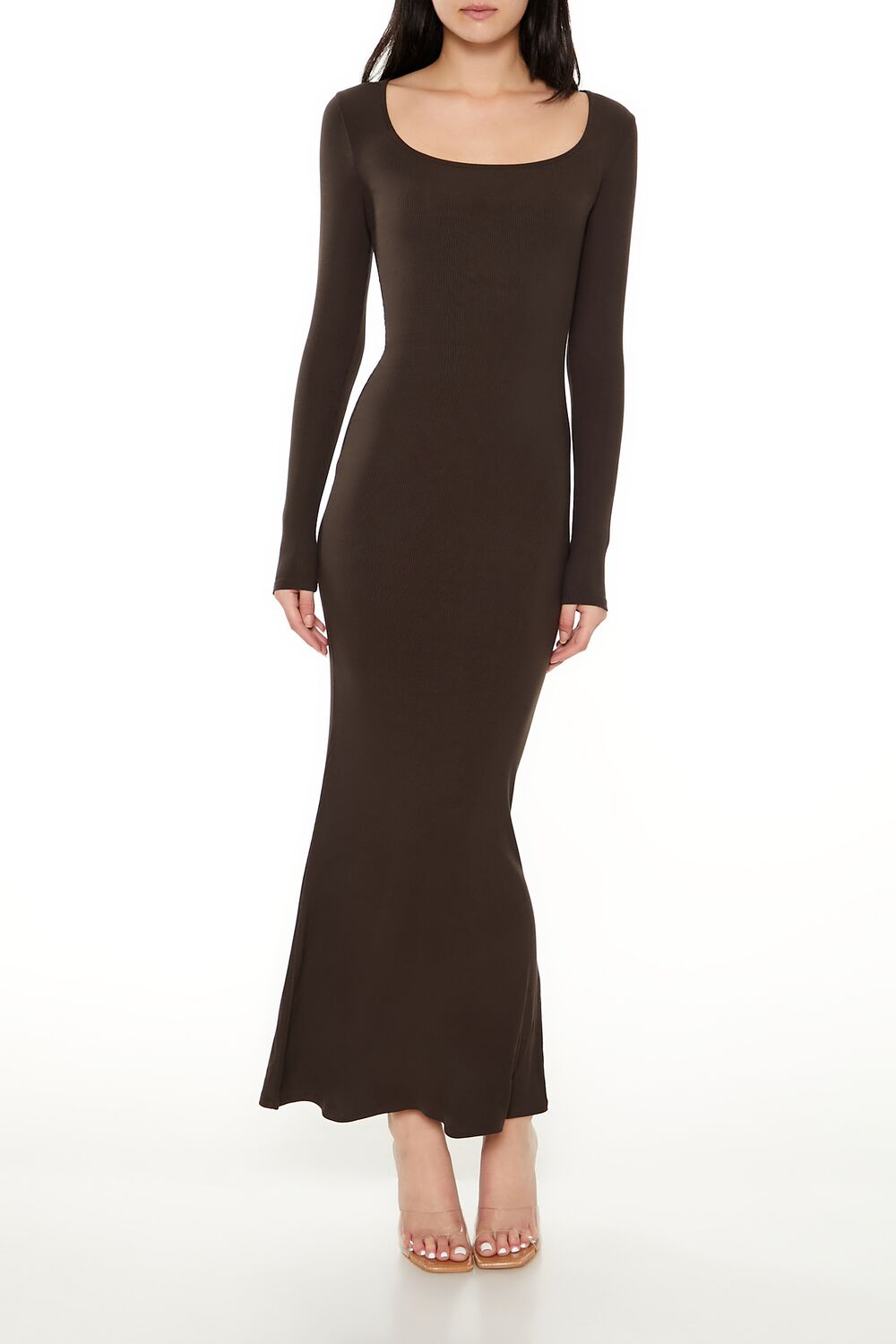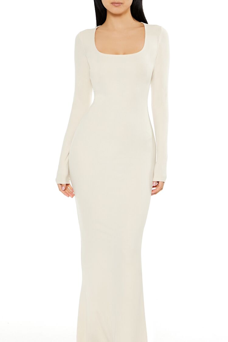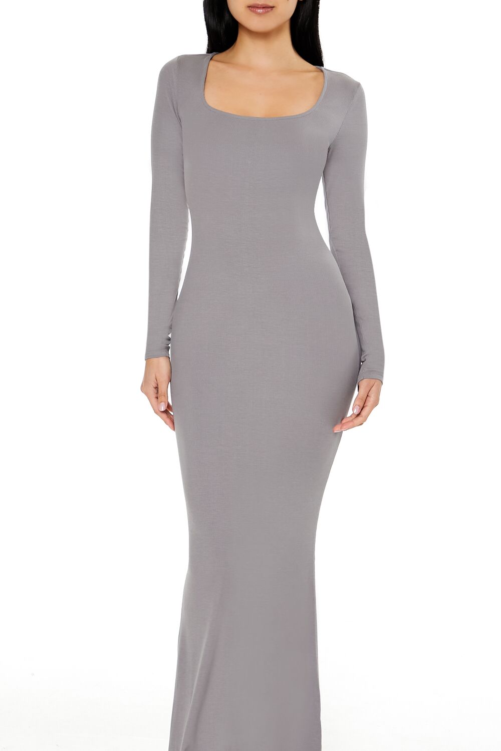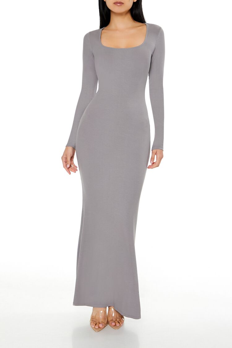 A ribbed knit maxi dress featuring a square neck, long sleeves, and column silhouette.Content + Care