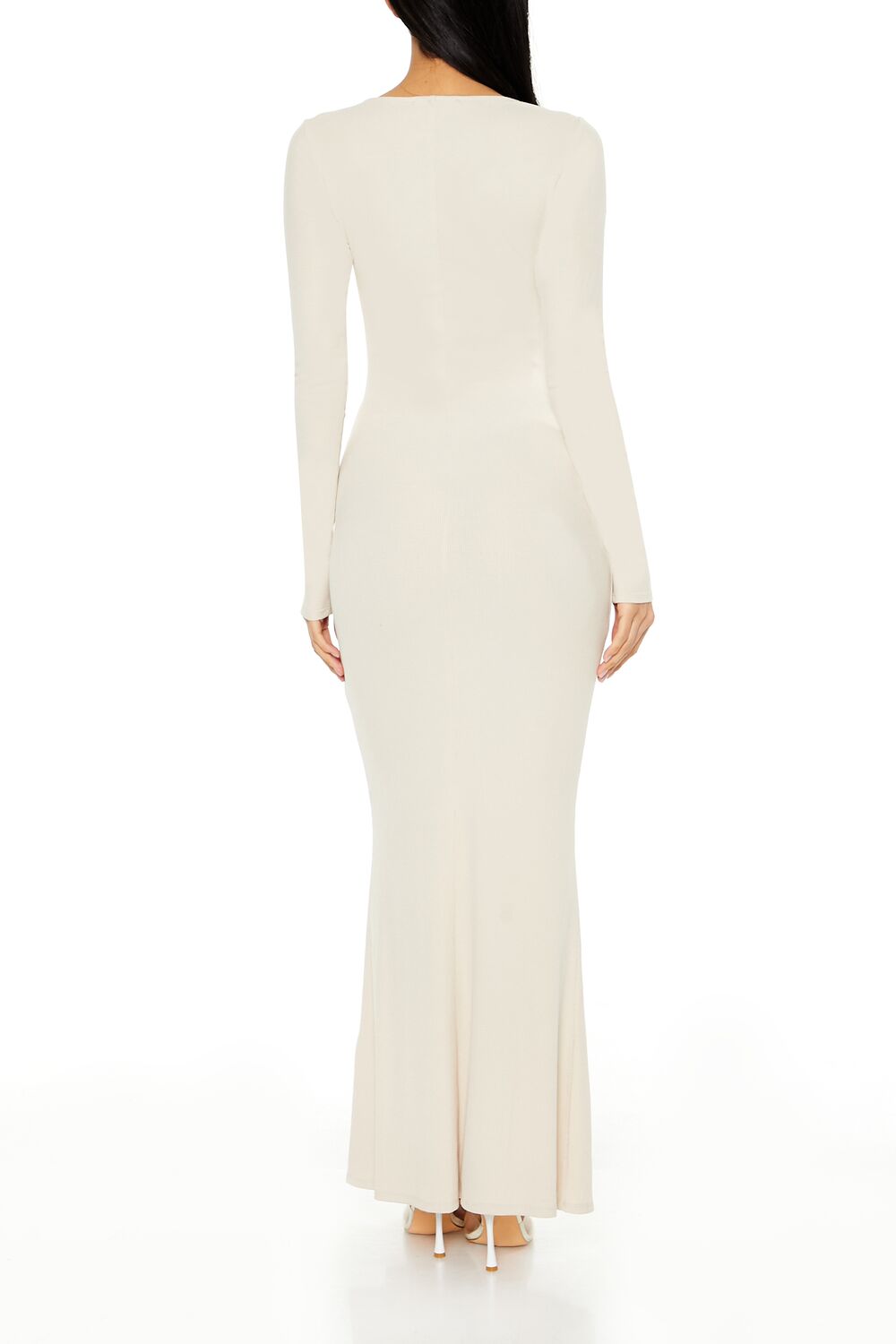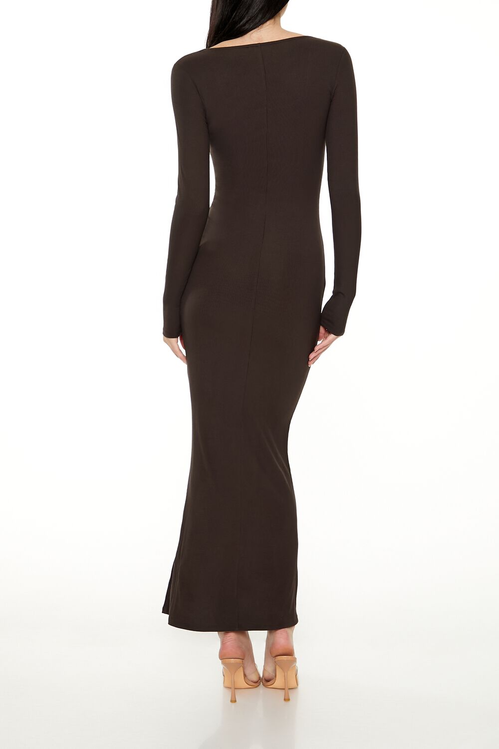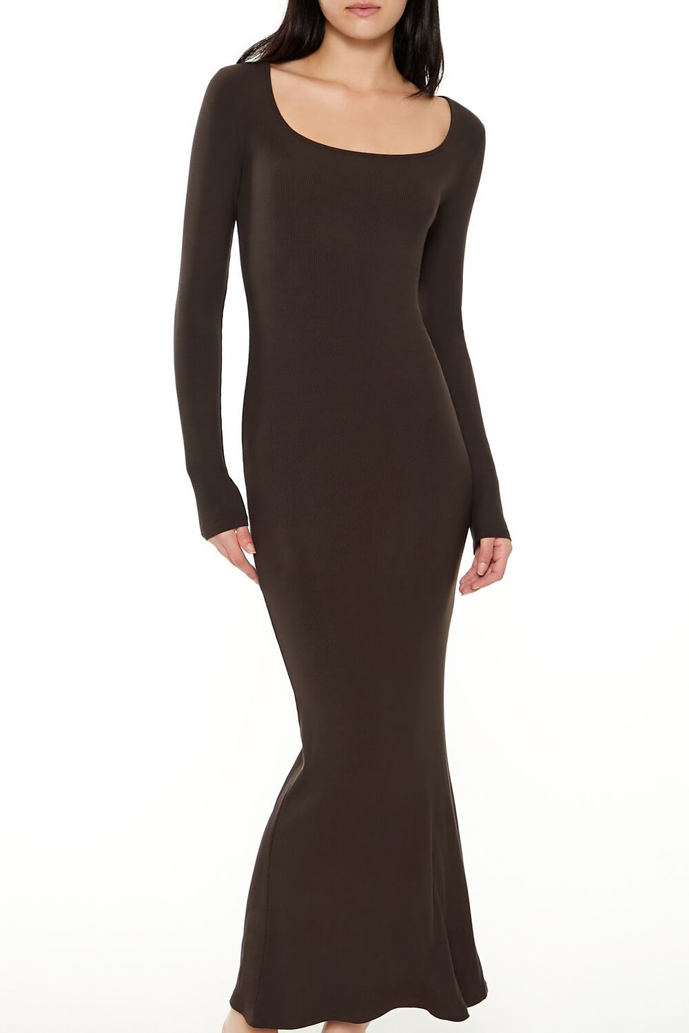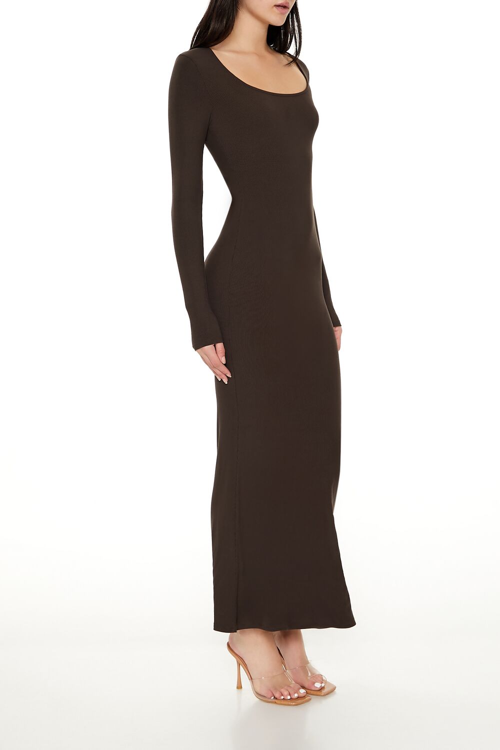 A ribbed knit maxi dress featuring a square neck, long sleeves, and column silhouette.Content + Care