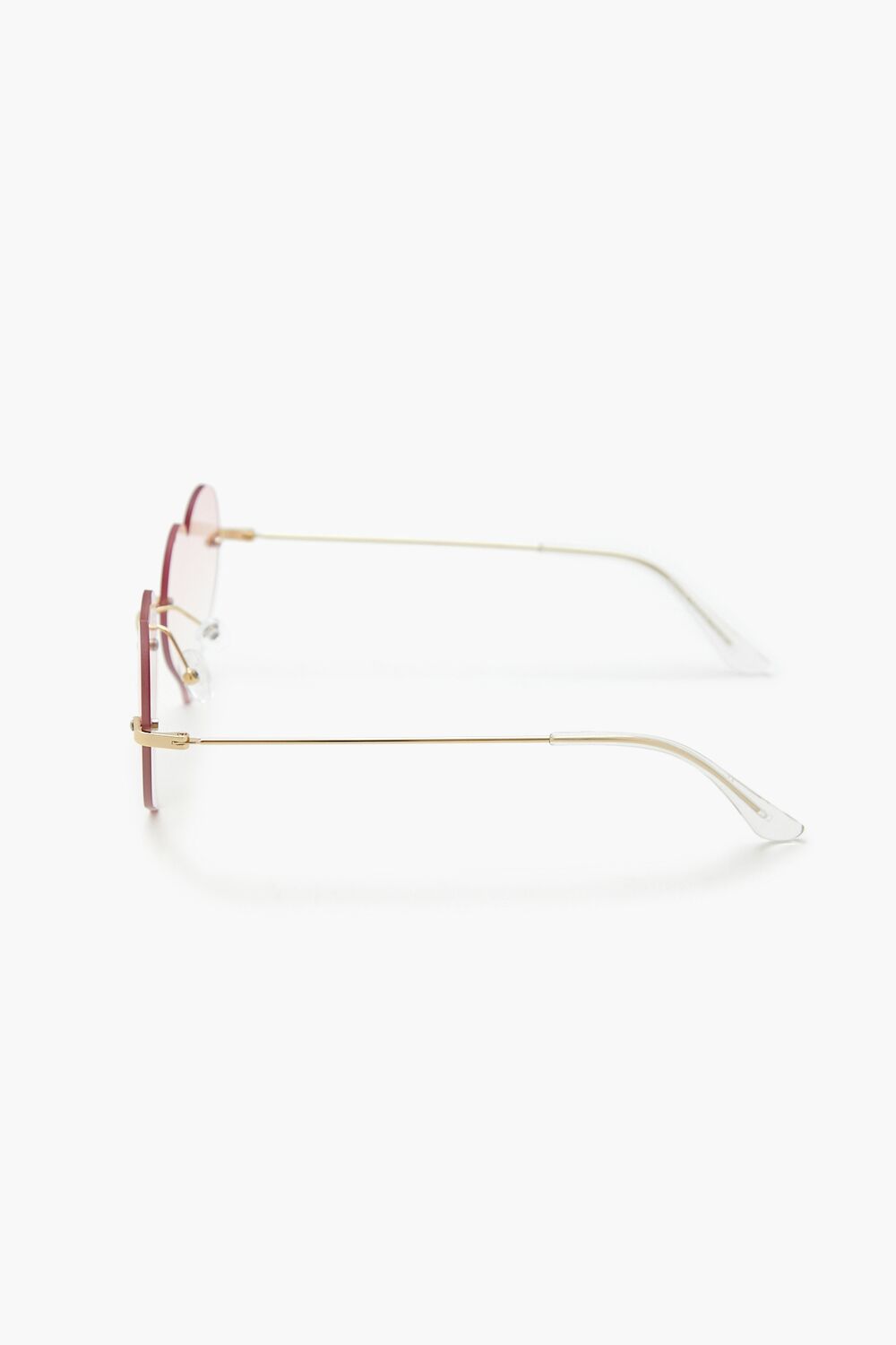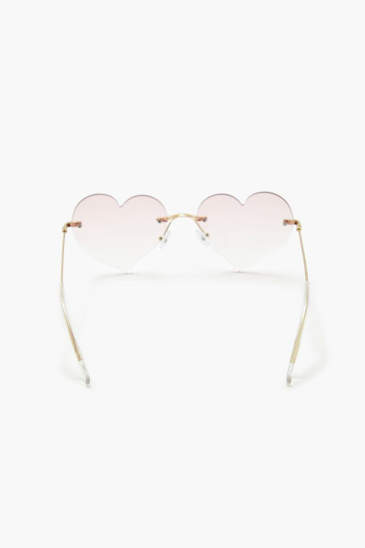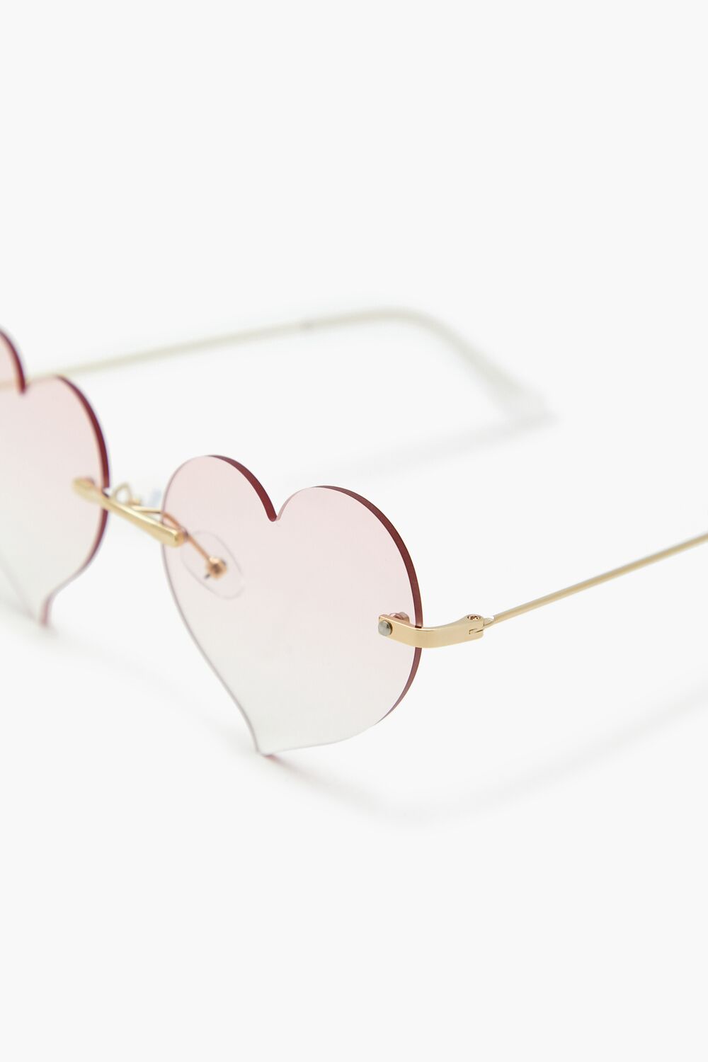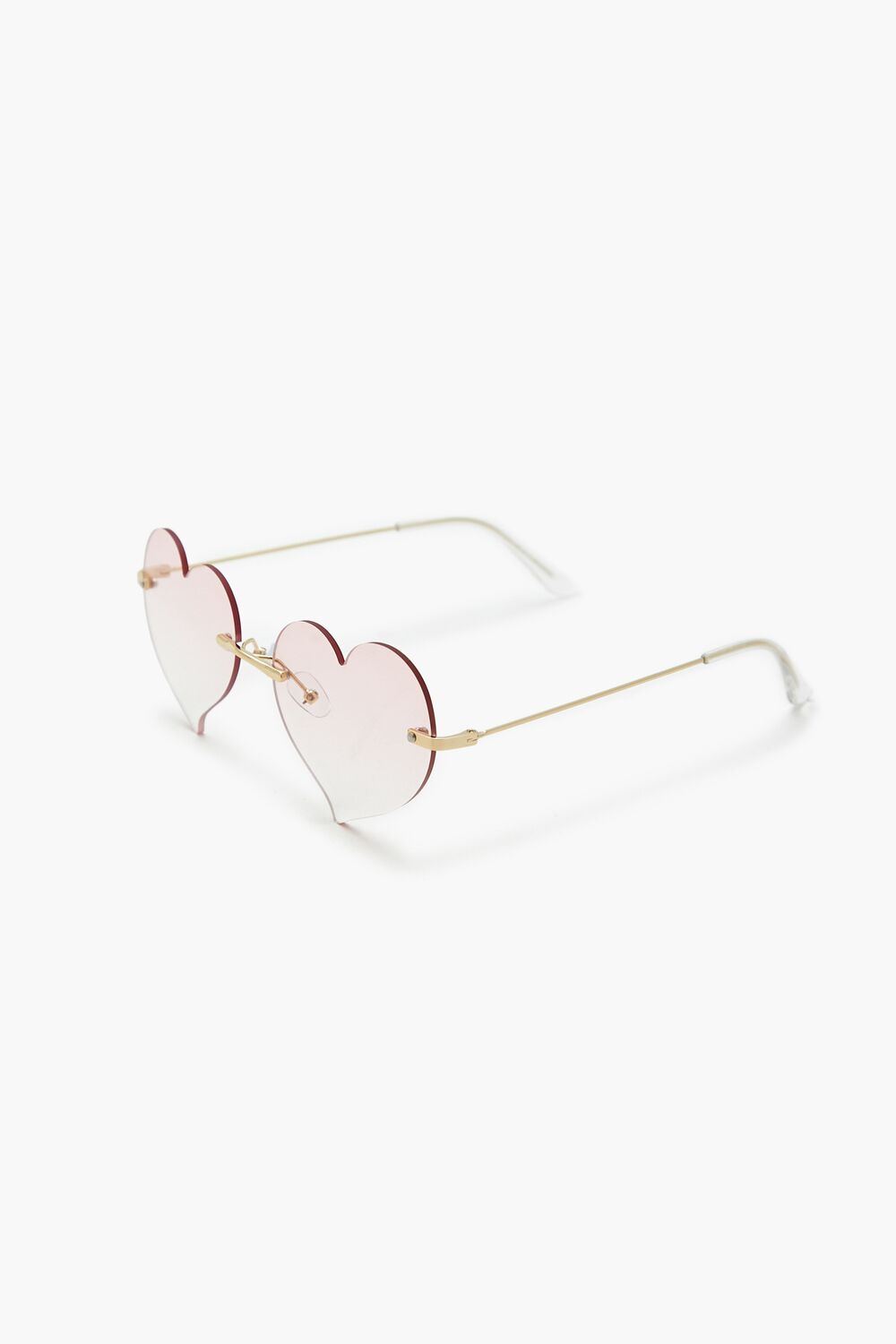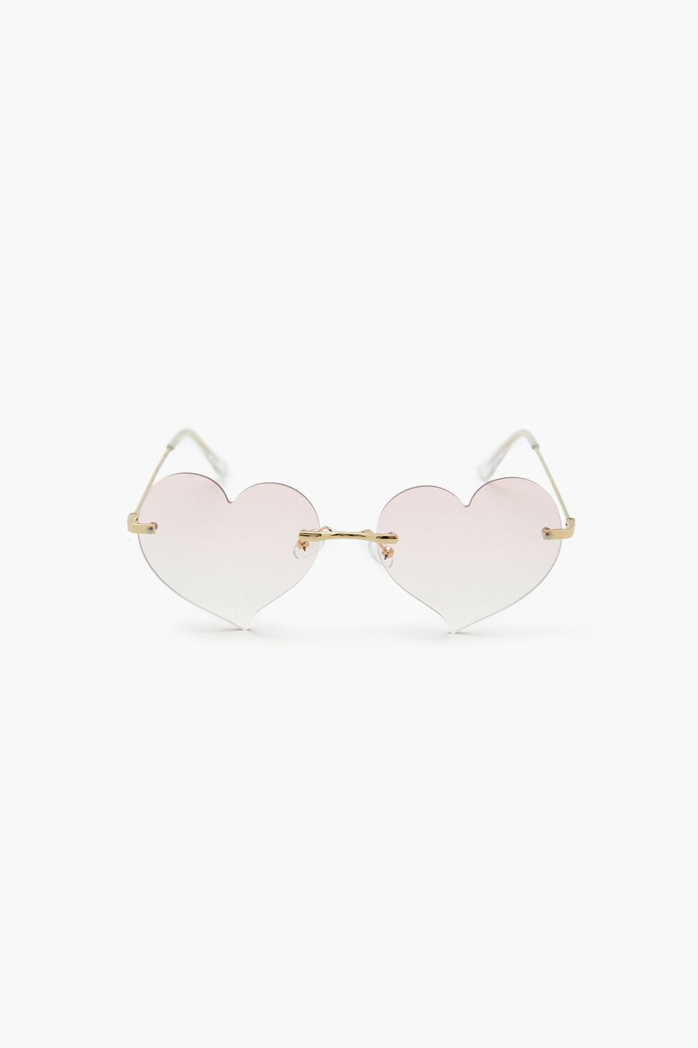 A pair of rimless sunglasses featuring high-polish hardware, heart-shaped tinted lenses, and nose pads.Size + Fit