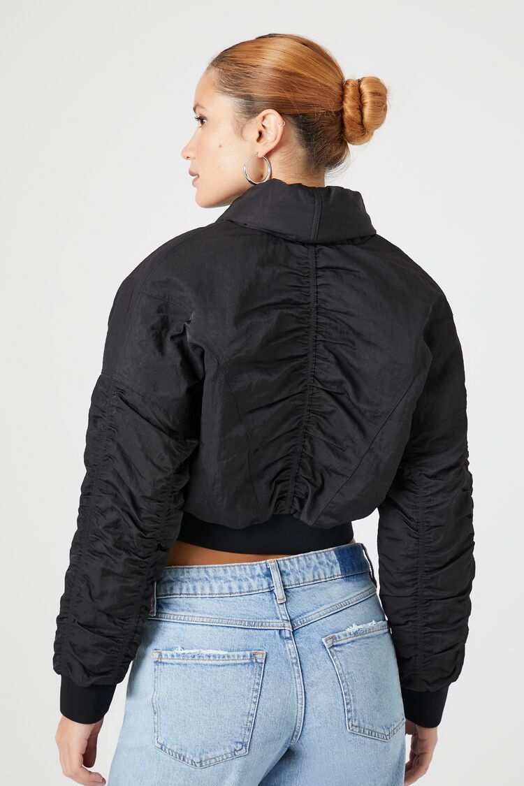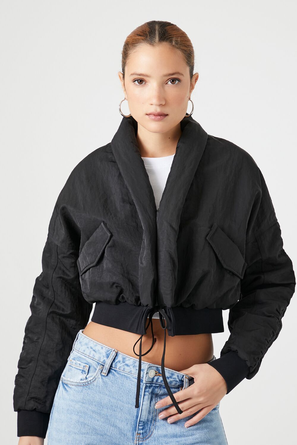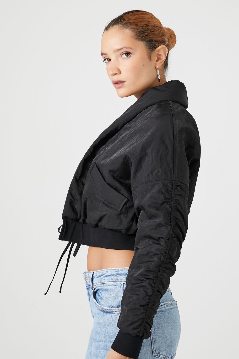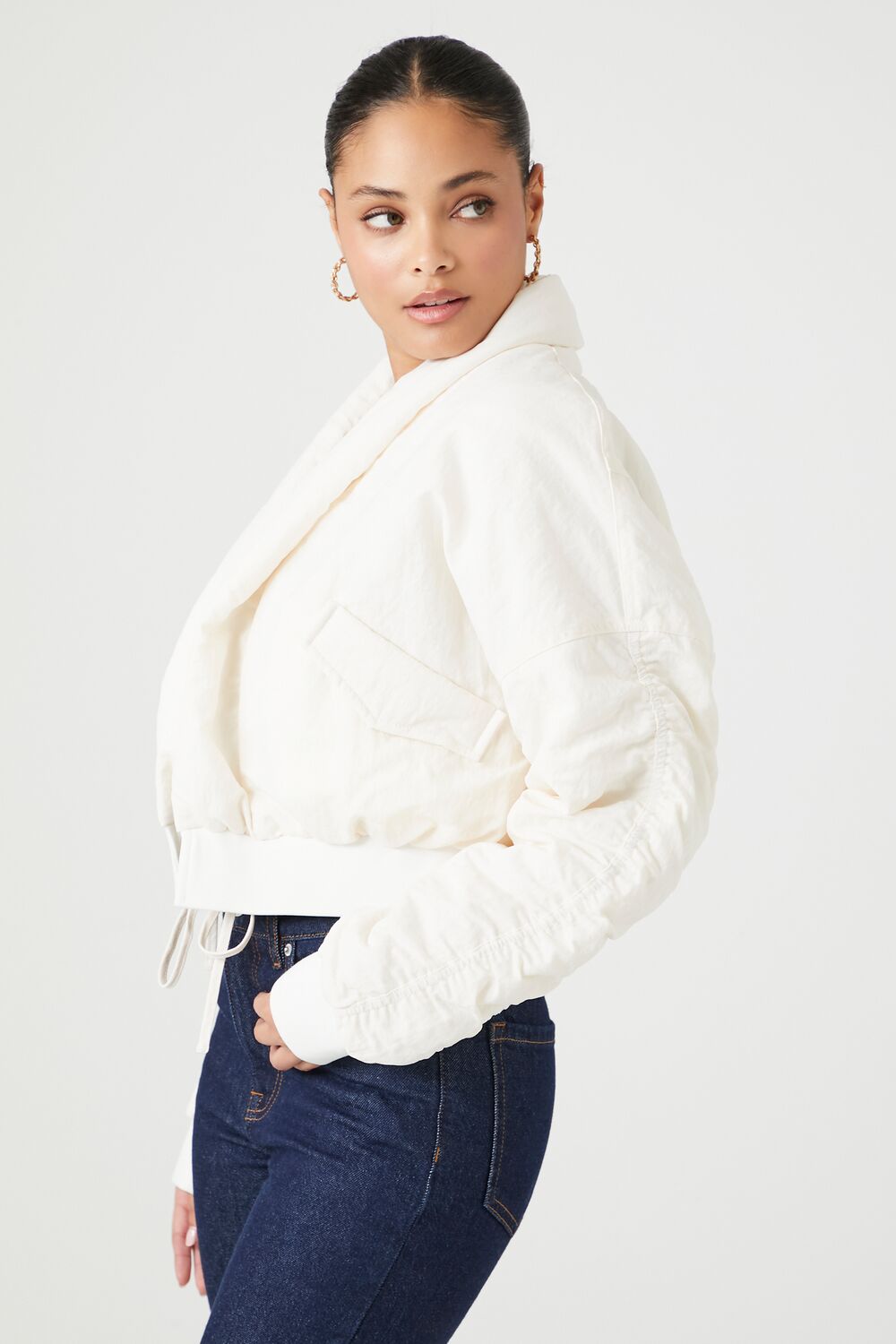 A woven puffer jacket featuring a shawl collar, front self-tie closure, slanted front flap pockets, dropped shoulders, ruched back and long sleeves, ribbed trim, and cropped hem.Content + Care