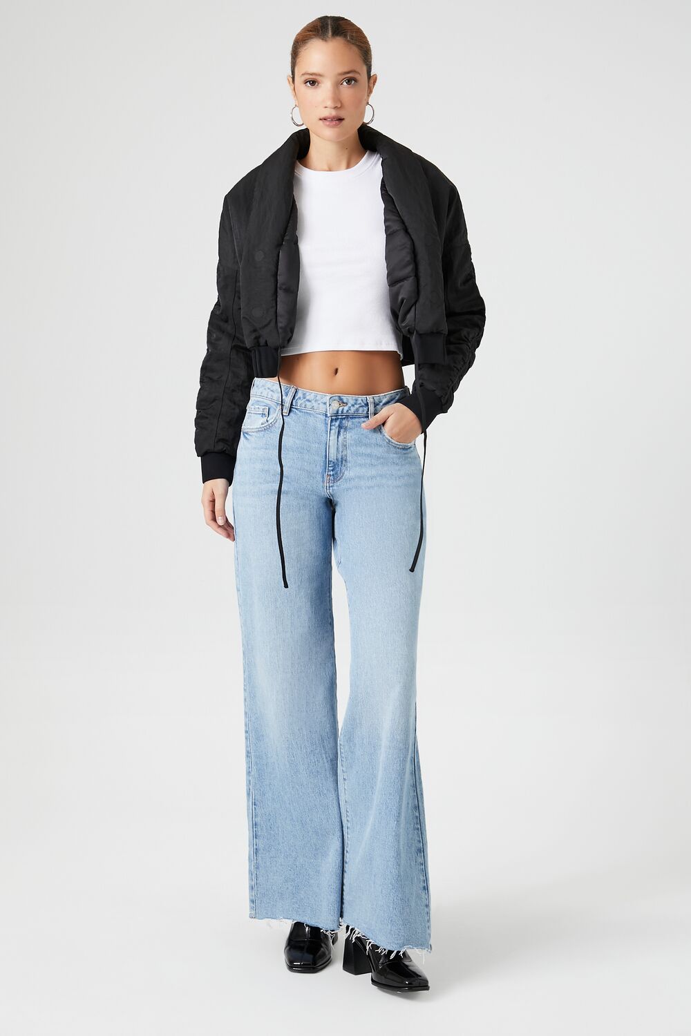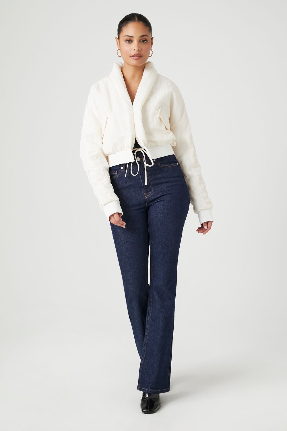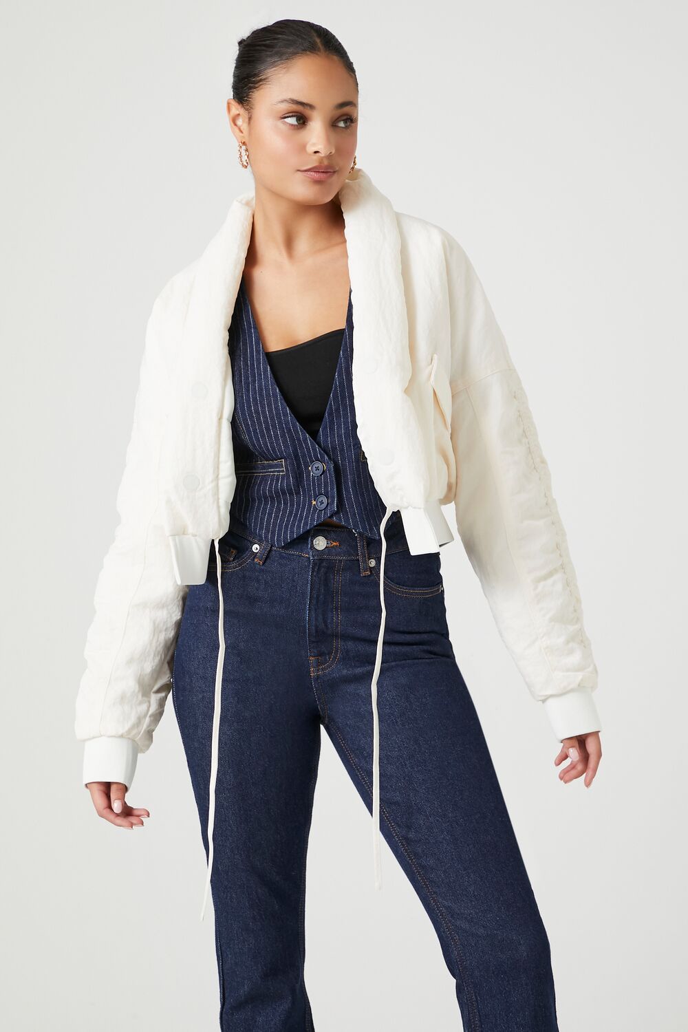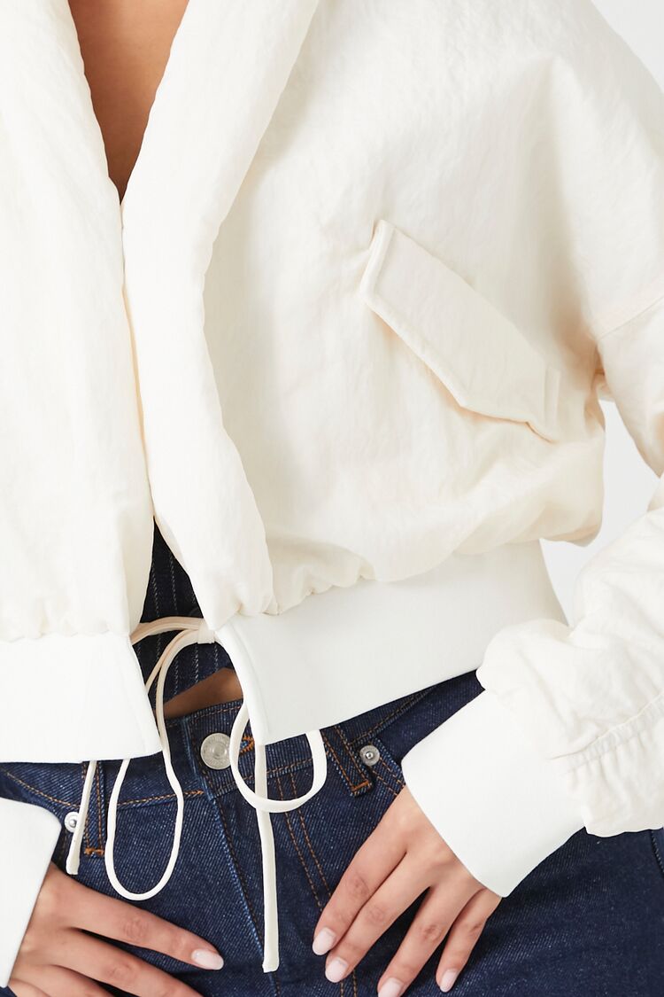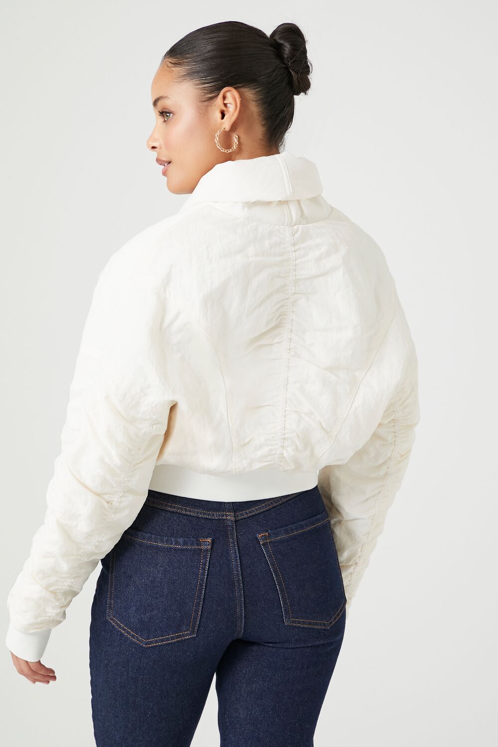 A woven puffer jacket featuring a shawl collar, front self-tie closure, slanted front flap pockets, dropped shoulders, ruched back and long sleeves, ribbed trim, and cropped hem.Content + Care