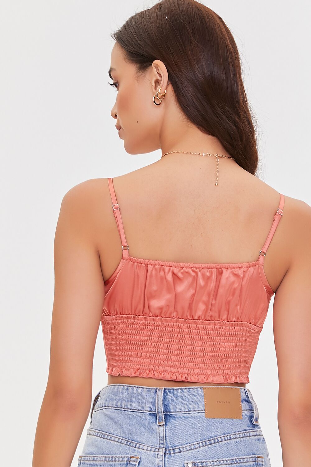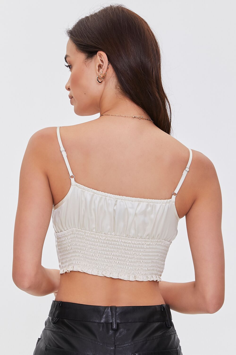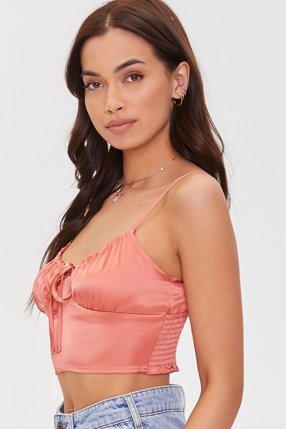 A satin cropped cami featuring a bustier-style design with seamed bust, sweetheart neckline, centered self-tie detail above a keyhole, adjustable straps, and a smocked back panel.Content + Care