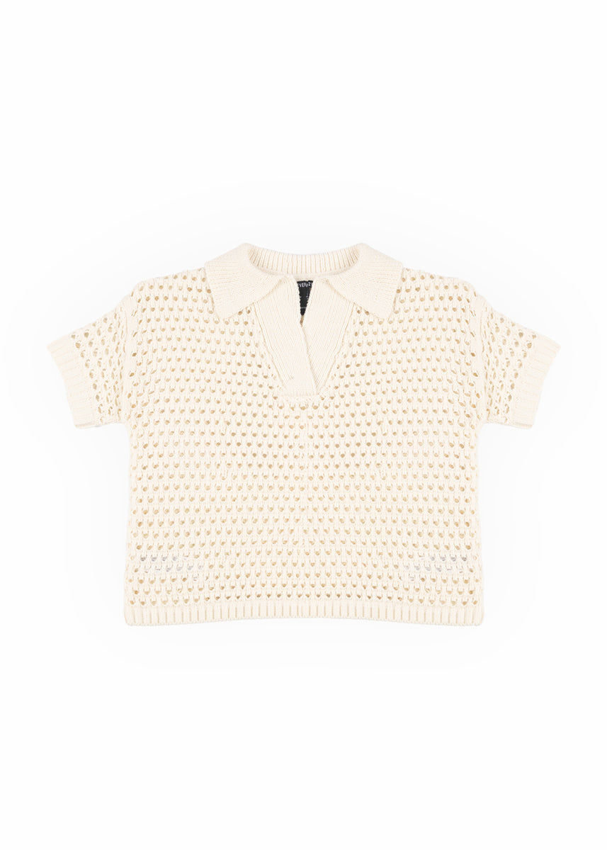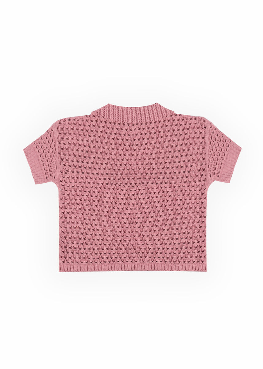 Short-sleeve sweater top with an airy crochet knit texture