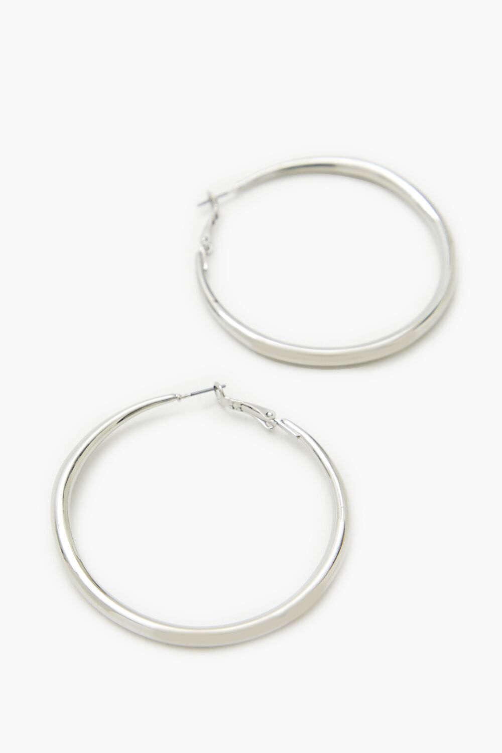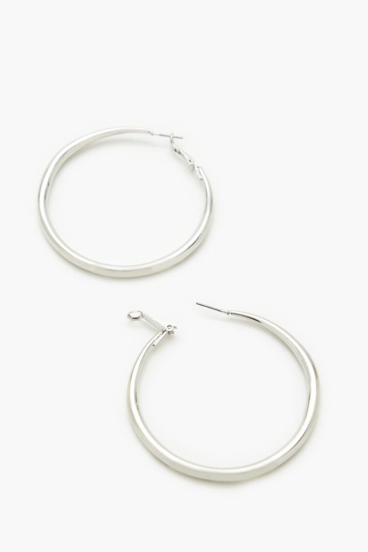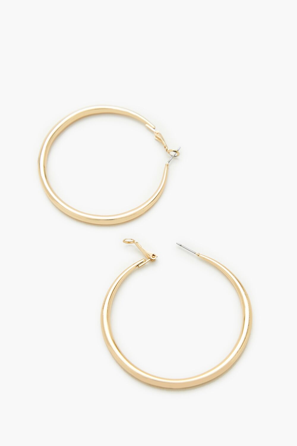 A pair of high-polish hoop earrings featuring a smooth finish and omega closures.Size + Fit
